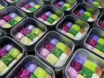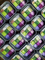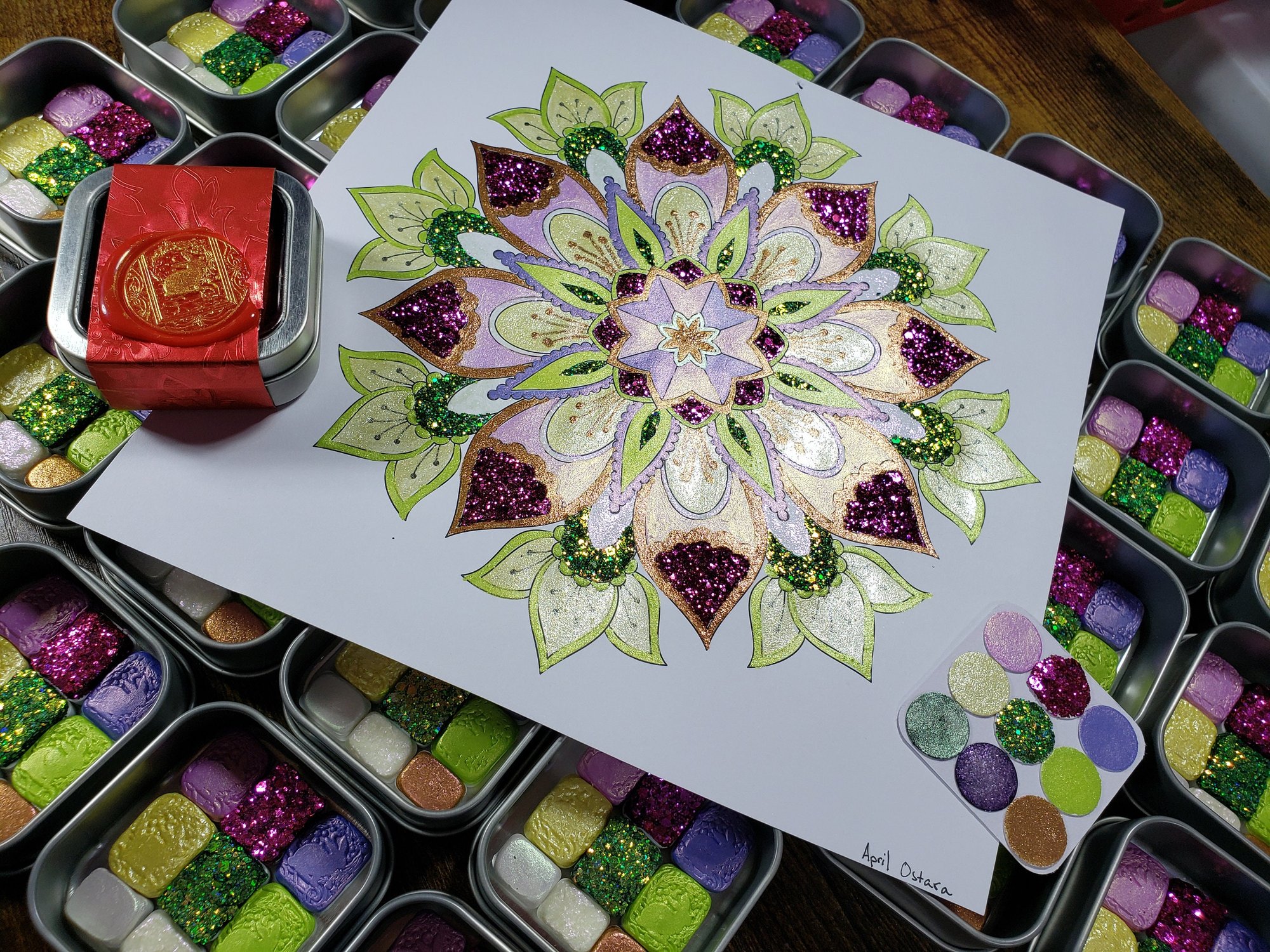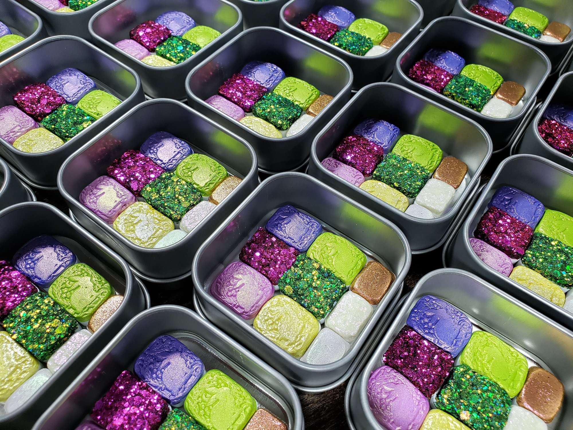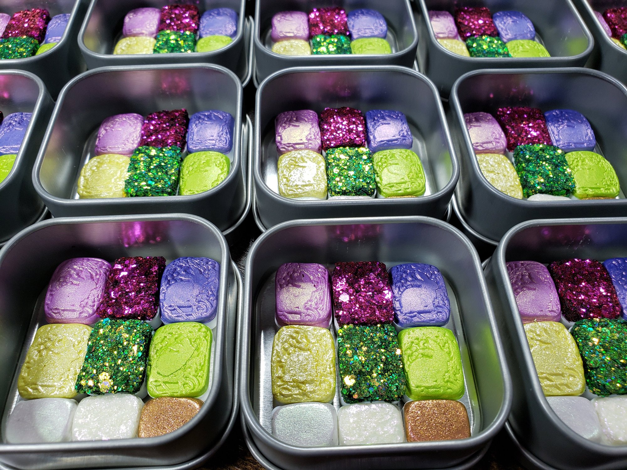 The finest holographic specular and mica pigments, and .1mm glitter in small batch watercolors, made with all organic binders. I use the best essential clove oil as a preservative and highest grade gum arabic powder available.