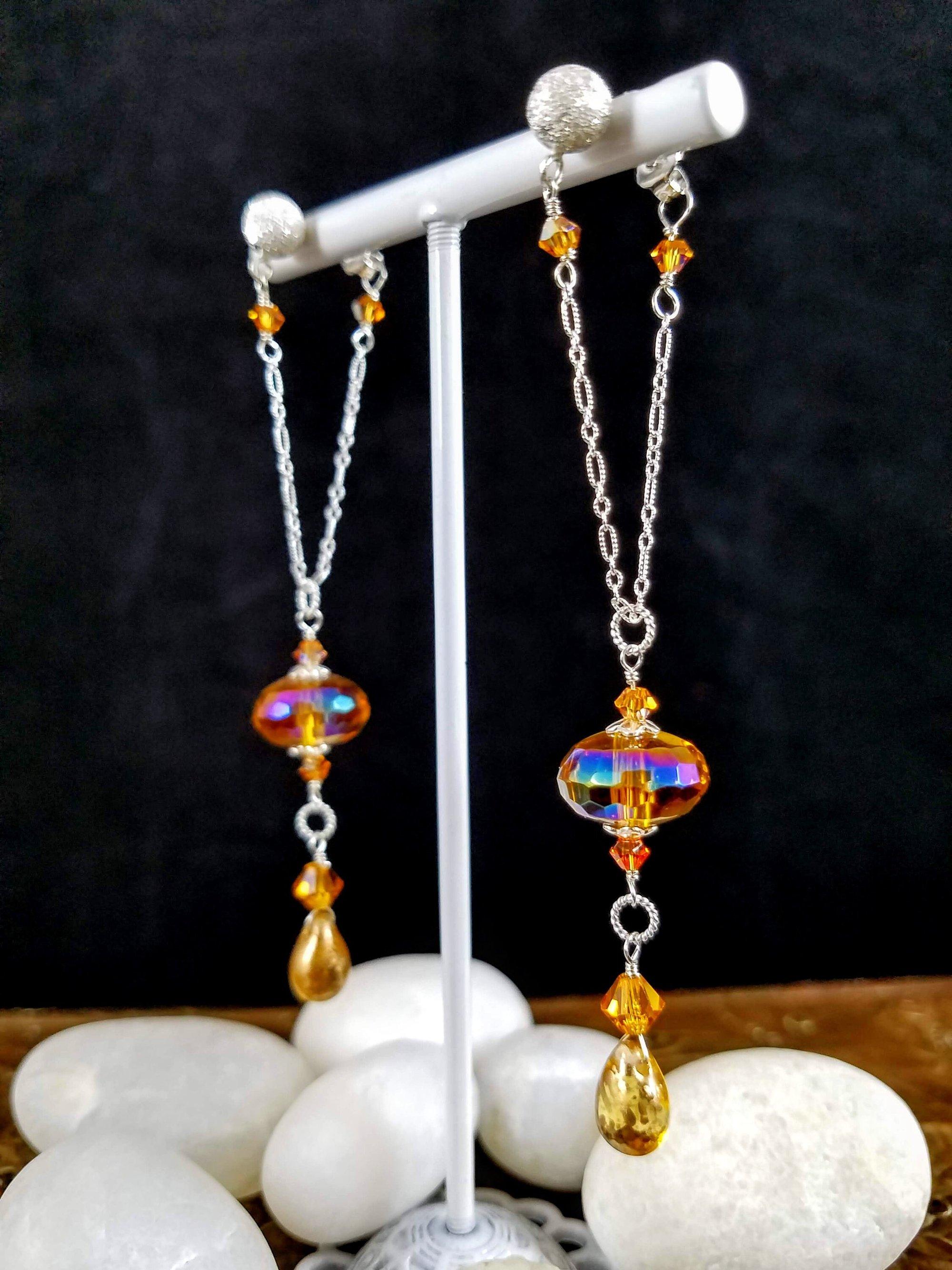 The subtle rainbow glow of Aurora Borealis coated amber colored crystal glass drops with Czech and Swarovski crystals magnified with Thai Hill Tribe sterling silver accent beads, chain, and amazing laser cut sterling earring posts. Handmade by a native San Diego artist with sterling silver wire and a sincere love of things that sparkle. These dazzling earrings also have a great safety feature; the sterling chain connects both the front and back of the earring to ensure it doesn't get lost while you shake it on the dance floor.