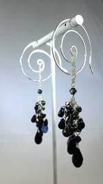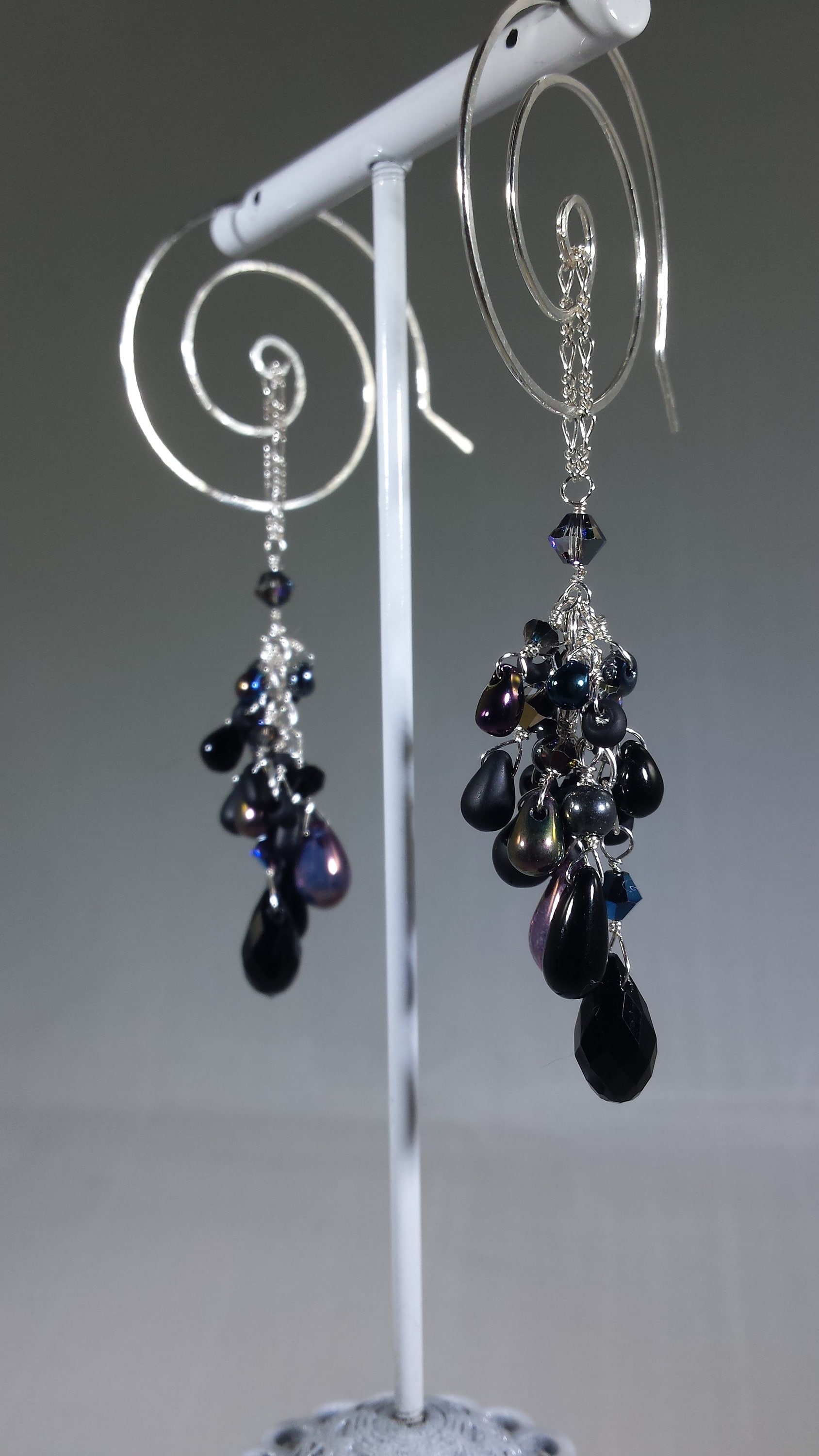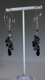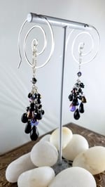 Black and Deep Purple Goth Crystal Tear Cluster Handmade Sterling Spiral Hook Earrings for Steamp...