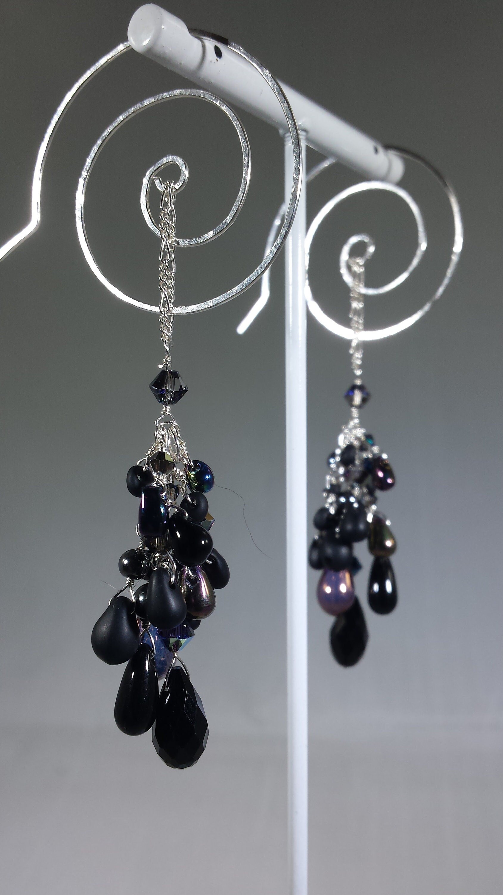 Black and Deep Purple Goth Crystal Tear Cluster Handmade Sterling Spiral Hook Earrings for Steampunk Magical Labyrinth Cosplay Fantasy Fun