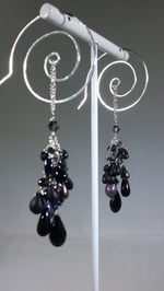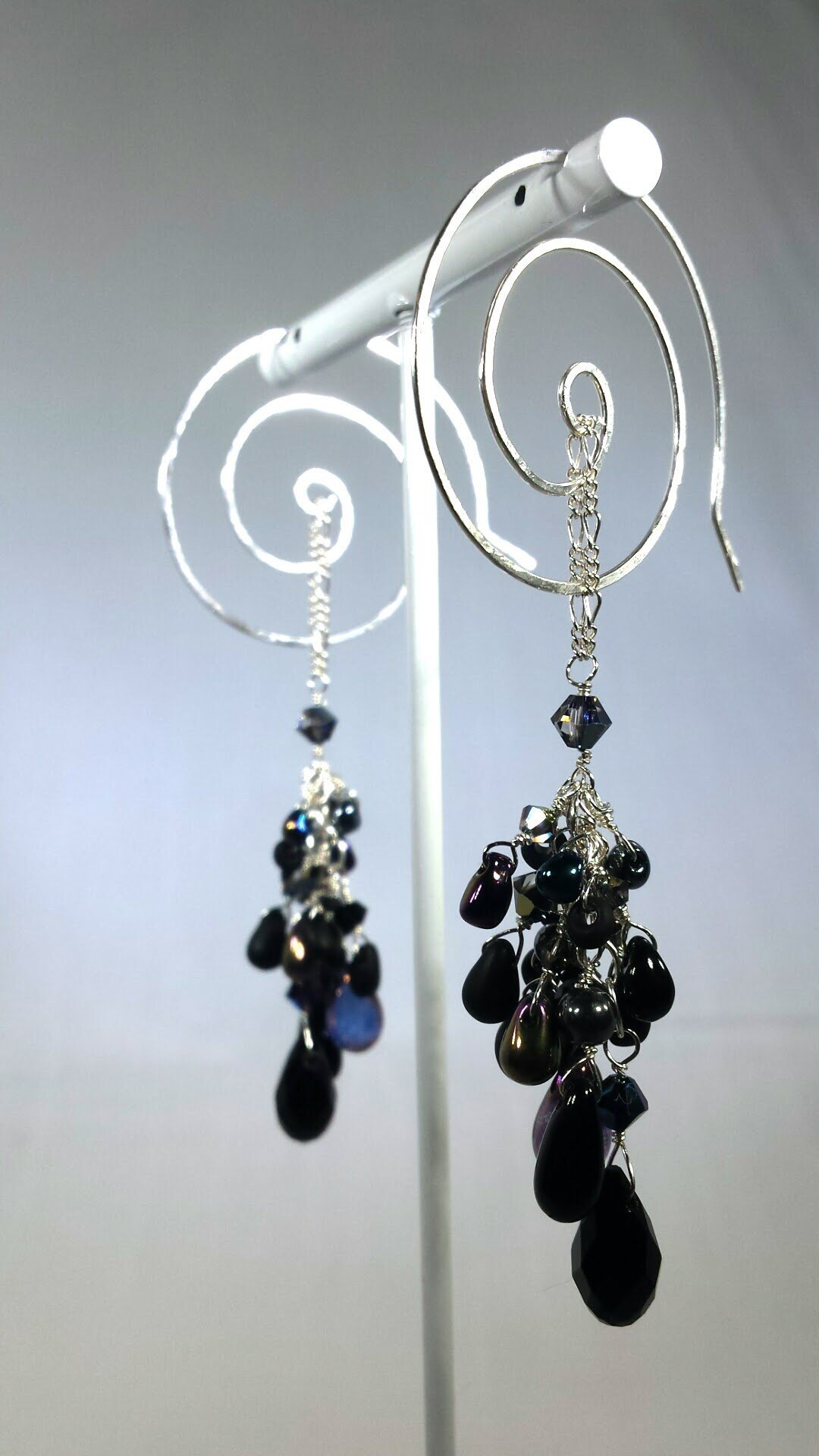 There are some days when I can't wait to get home so that I can do a little art therapy. These days I've been really into HITTING THINGS WITH A HAMMER! Thus, SMASH IT PRETTY!! was born. Inspired by the Anza Borrego Desert and the Book of Kells, these are 3 1/2 inches of stunning lustrous crystal sparkles! Unique handmade 20 gauge sterling silver hooks balance the cascades of oh so gothic black, purple, and other dark crystal drops twisted with stunning sterling silver wire. One of a kind, handmade, and gorgeous! Make your own dramatic and elegant statement.