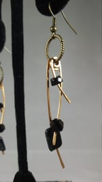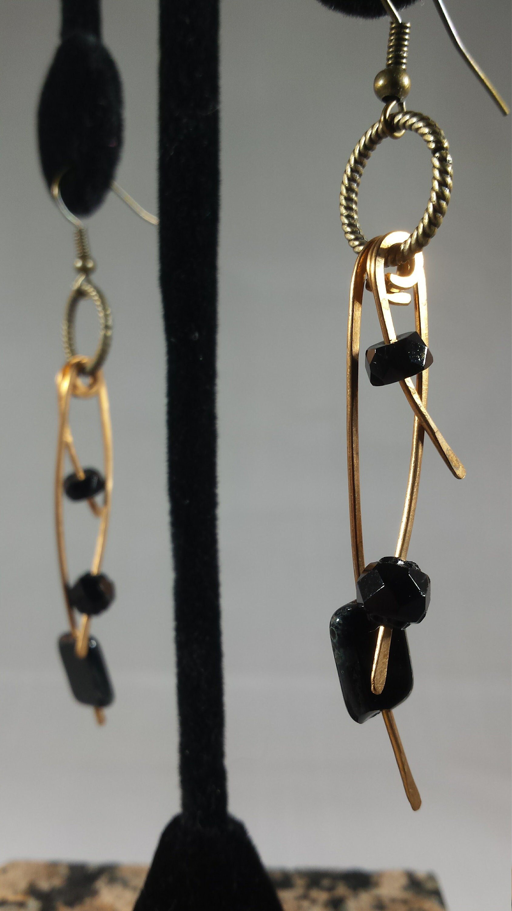 Original product name: Black as Onyx Crystal and Glass Beads on Three Hammered Bronze Feathers Steampunk Feather Vegan Alternative Bronze Hook Earrings