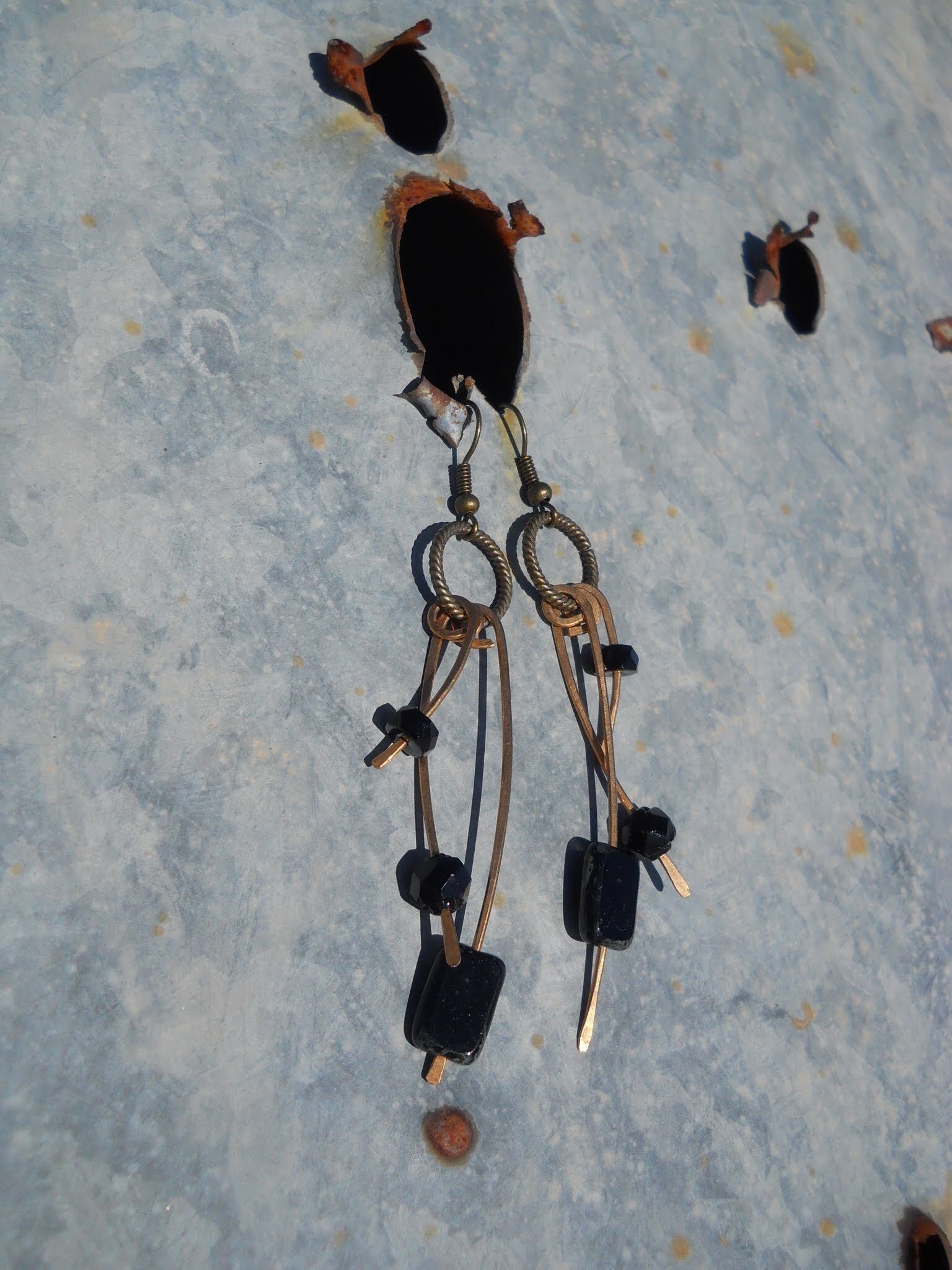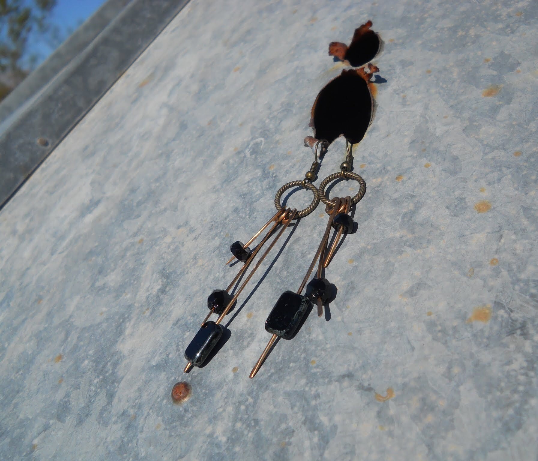Long, elegant, and perfect to go with your best dress, these earrings are about 3 1/2 inches long, and feature six hand hammered bronze wire "feathers" and an exotic variety of glass and onyx crystal beads. Just the thing to add to your Victorian or Steampunk wardrobe, to an elegant event, or to wear to the office. The metal feathers make a great gift for the vegan or vegetarian in your life!