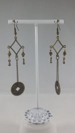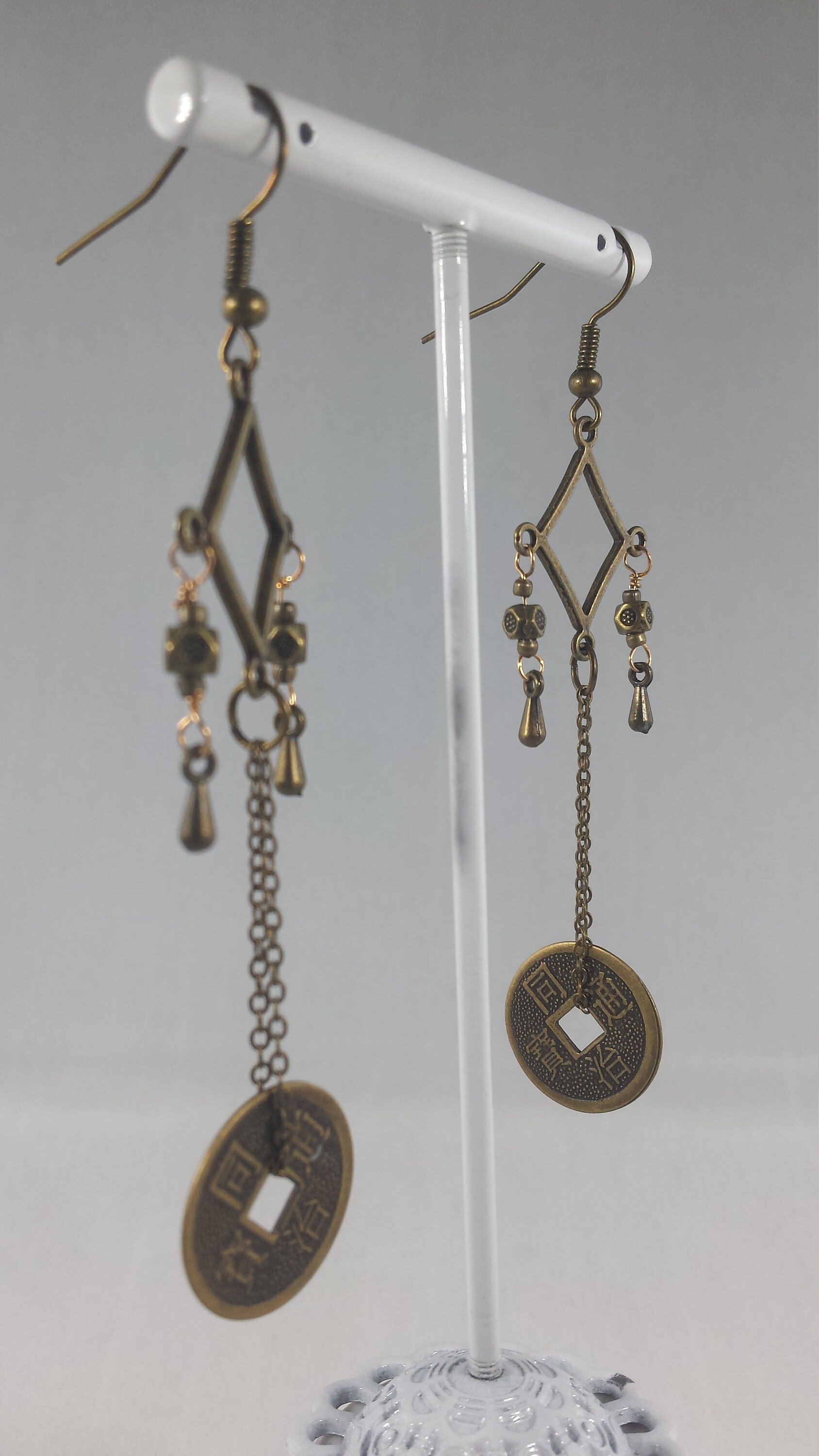 Original product name: Bronze Drops With Good Luck Coins on Fine Bronze Chain Extra Long Hook Dangling Fantasy Tribal Dance Earrings