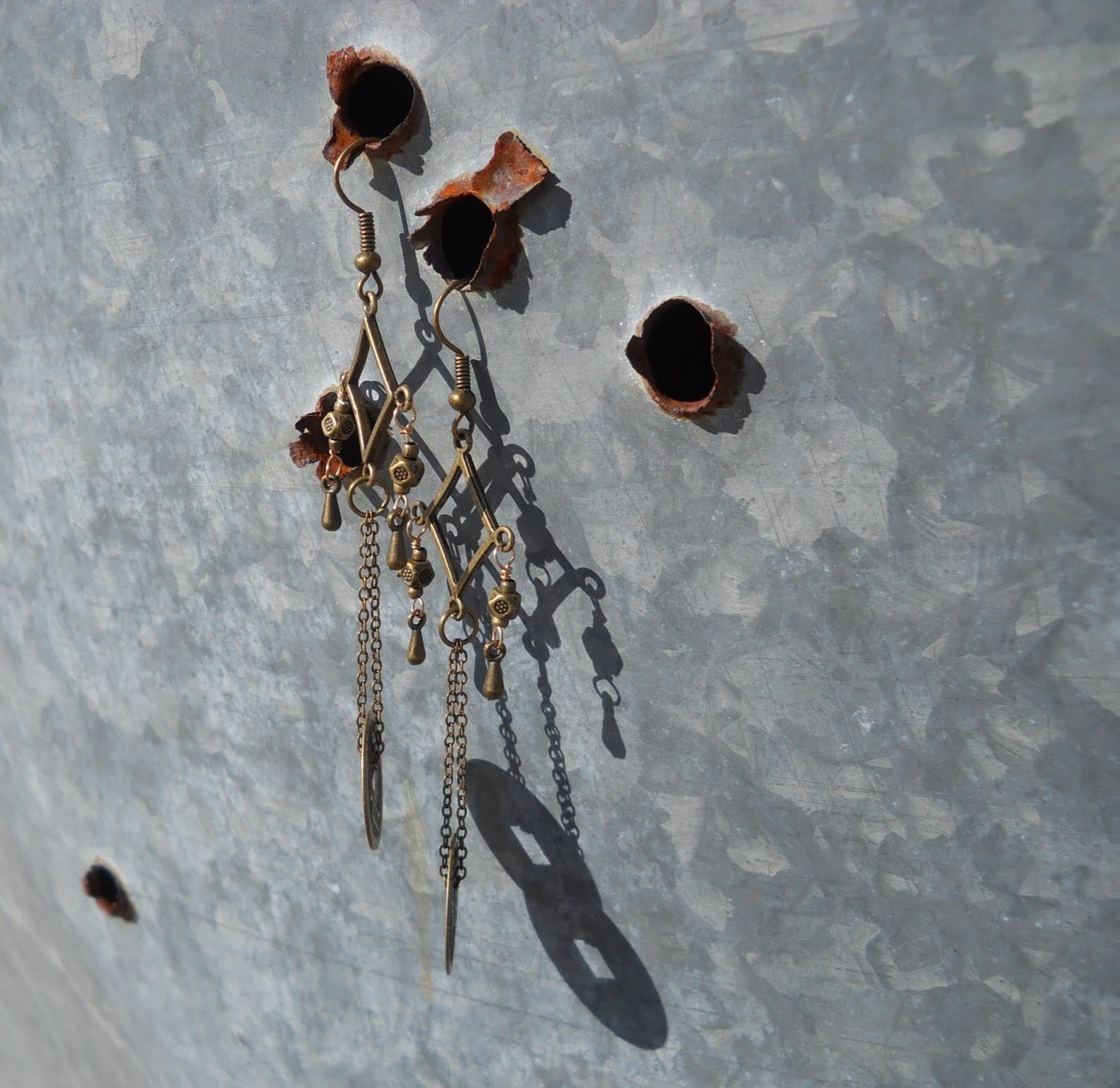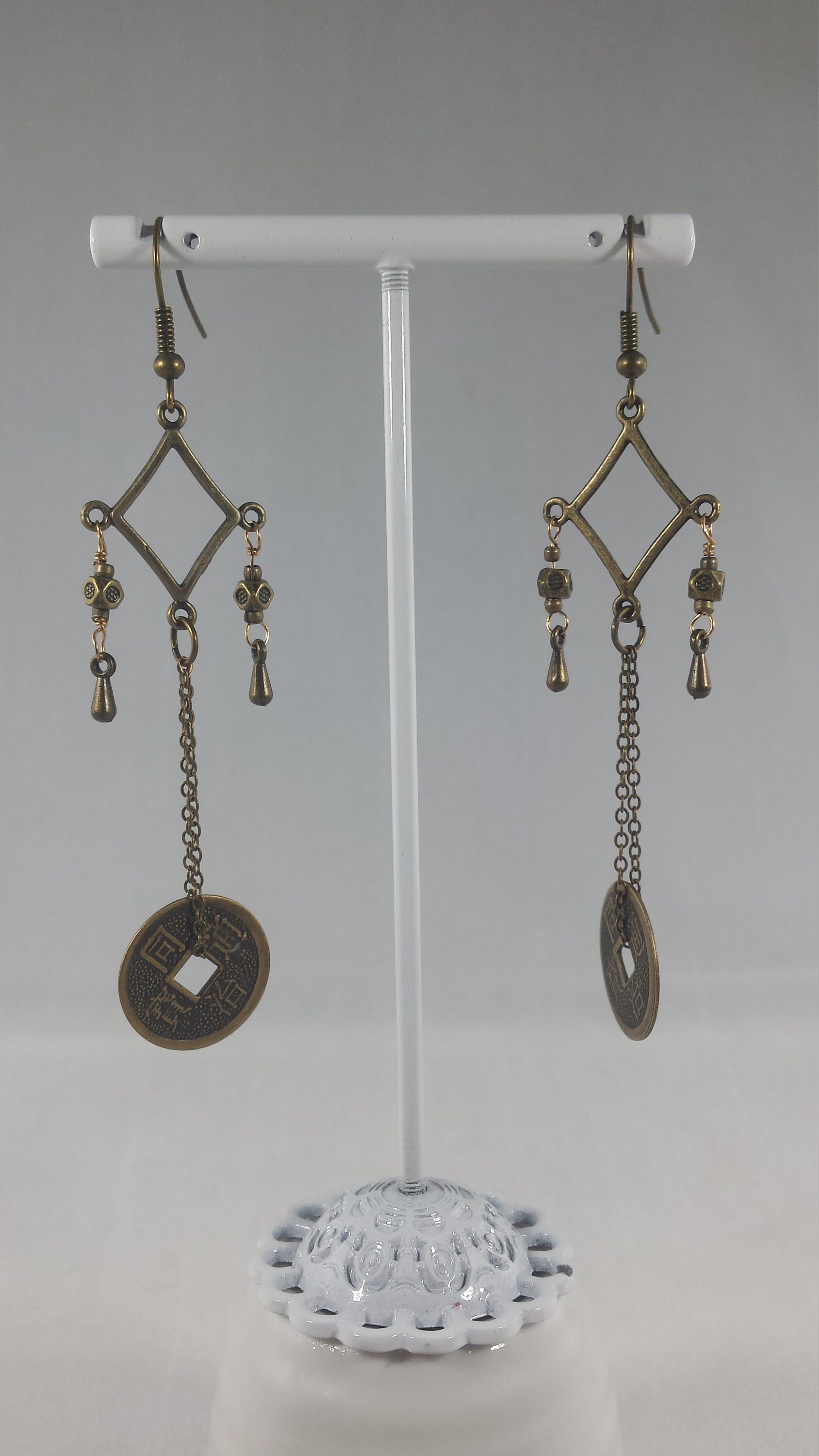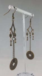 Long and lovely, these earrings have a lot of awesome going on and they are totally metal! Bronze pendants like raindrops accent the long bronze chains and Chinese style coins and bronze filigree. These earrings measure about four inches long, which is why we call them "shoulder dusters."