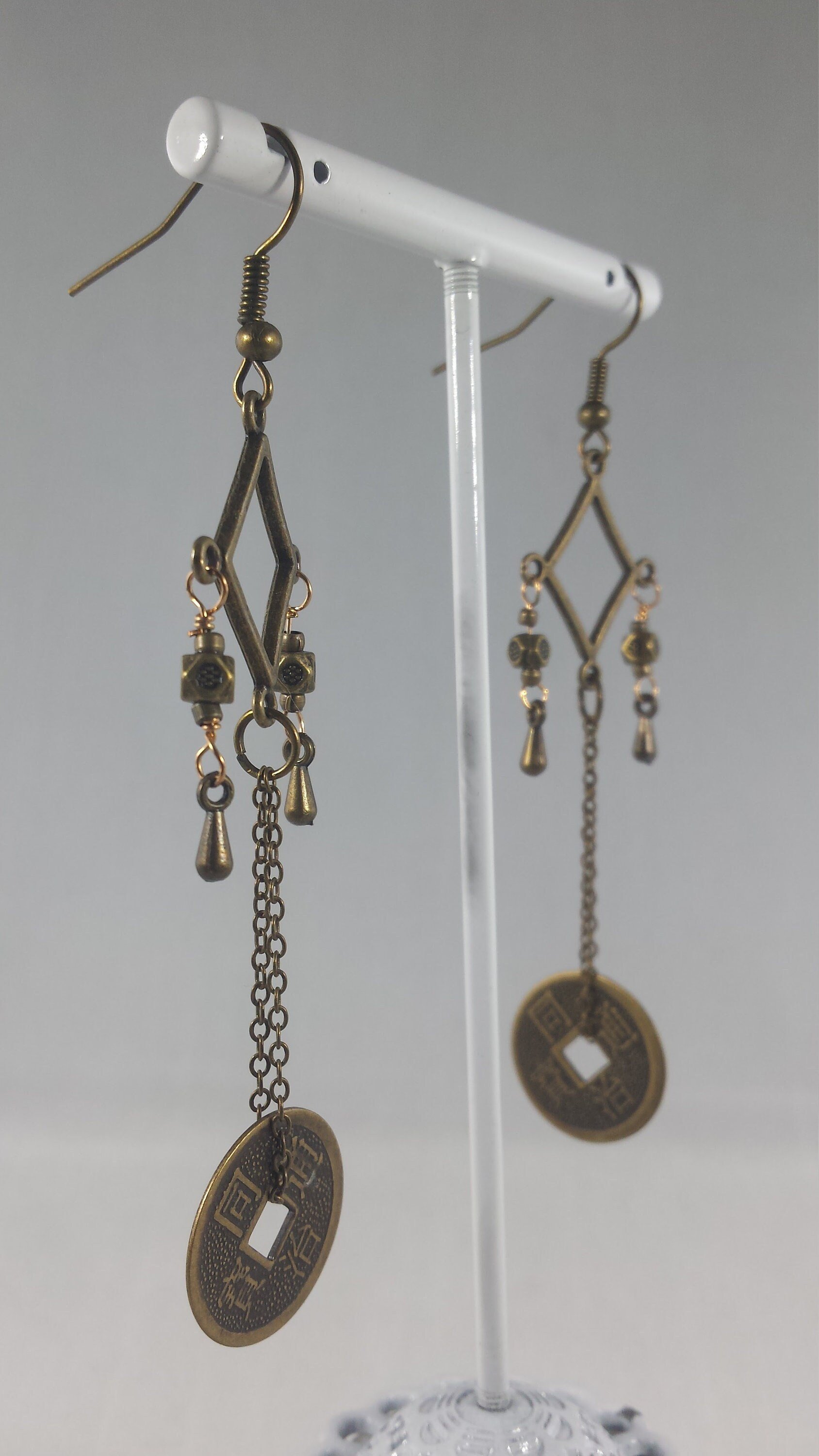 Bronze Drops With Good Luck Coins on Fine Bronze Chain Extra Long Hook Dangling Fantasy Tribal Da...