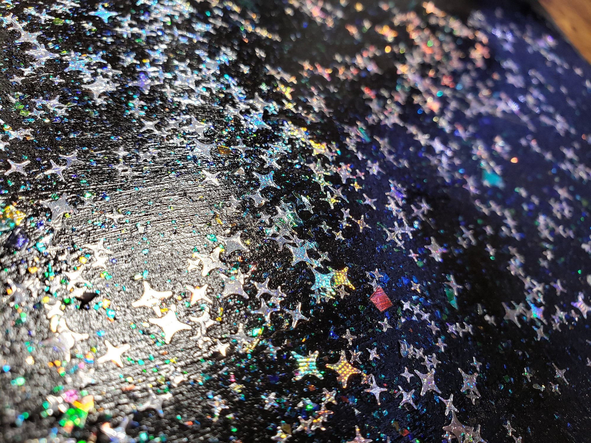 This is not paint! It is an incredible magical glittery mixture of holographic star flakes and rainbow holographic flakes from micro to 4mm size, water-based polyvinyl acetate "glue," and love. I fill the jar to the top with flakes, then add the gooey goodness. The consistency ends up more like mousse, but it goes on easily and gleams amazingly when it dries.