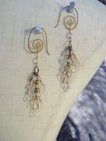 The desert is like no other place for me. Quiet, peaceful, and full of gorgeous beauty if you know where to look. I have been fortunate enough to have close encounters with rare Peninsular Bighorn Sheep in the Anza Borrego Desert State Park, and have taken inspiration from their amazing headgear to make these beautiful spiral hook earrings. They balance just right, and will swing and sway, sending sparkles of happiness all around you. These earrings are a little long, more than three inches of cascading polished and frosted quartz beads hand-wired with Turkish bronze to a unique handmade spiral ear hook. These are designer pieces worthy of showing off or sharing!