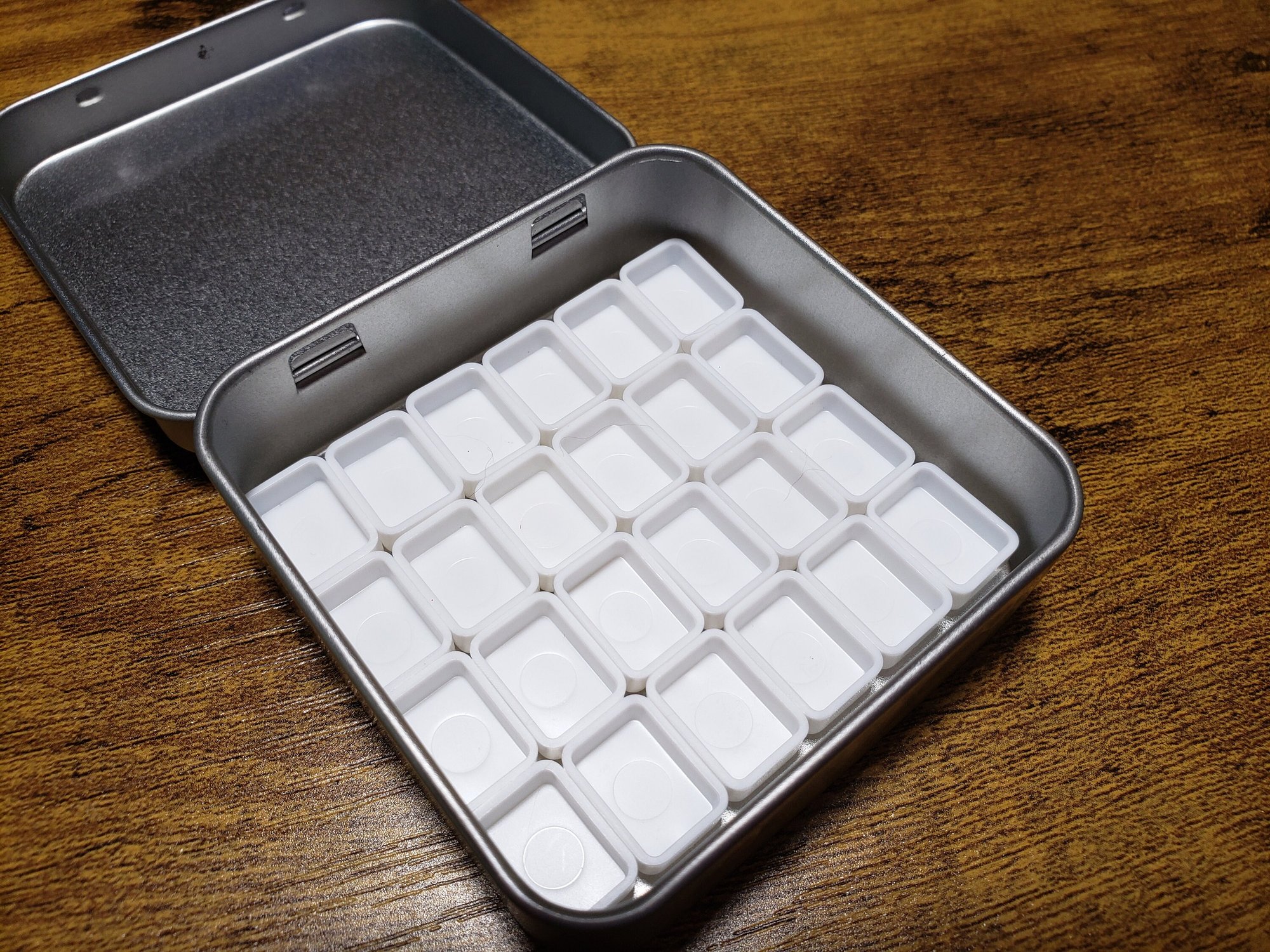 Original product name: CUSTOM - Small Steel Magnetic Palette: Your Choice of Mica Watercolors 24 1/6th, 12 1/4th, 12 1/2, or 6 Full Pans