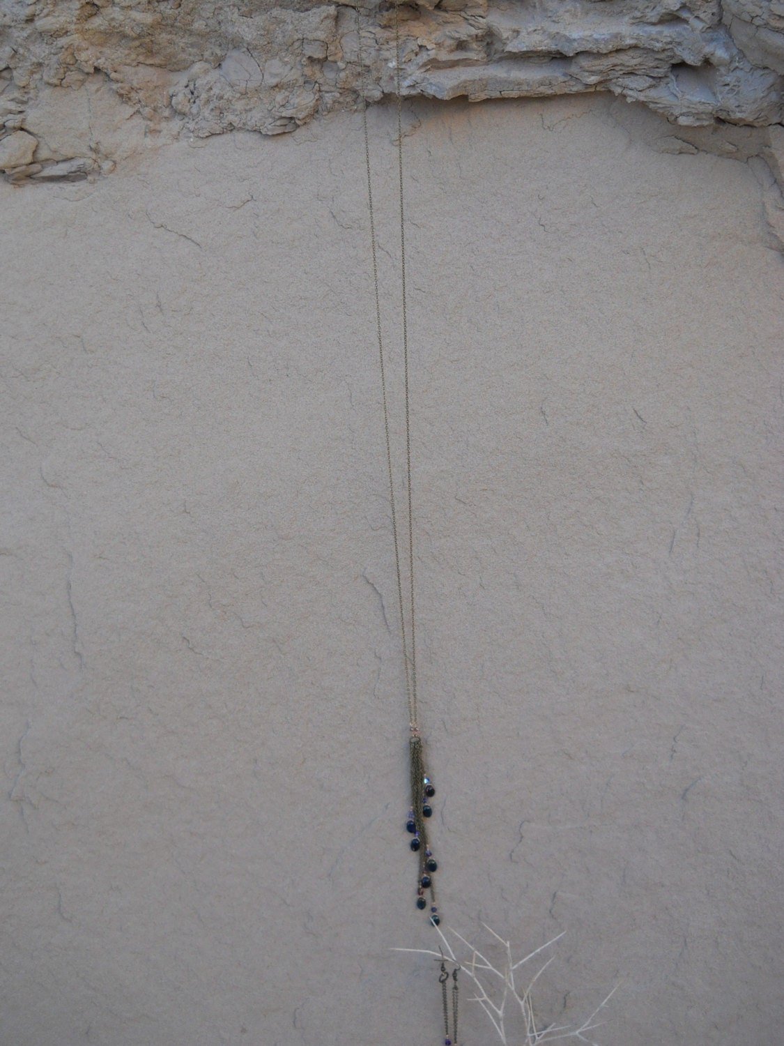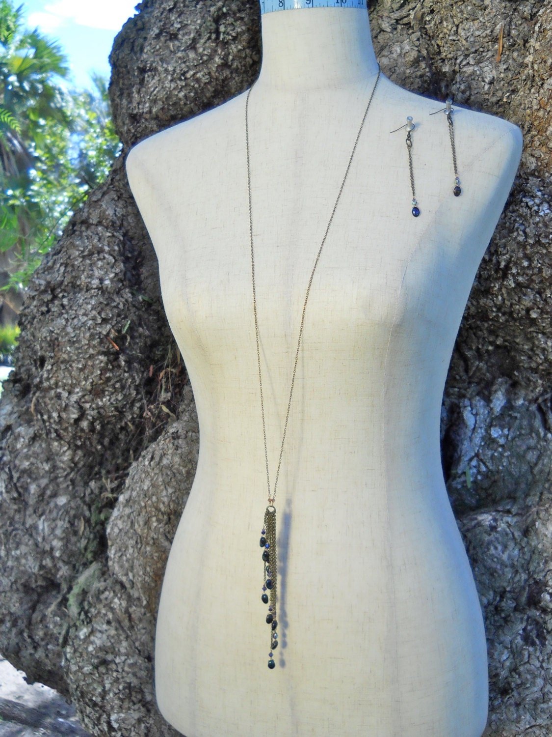 The matching earrings are made with the same beads and Turkish bronze chain as the necklace and are about three and a half inches long.