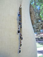 Perfect for a dark and stormy night, this extra long necklace can be worn long as shown, or you can double or possibly triple it for a shorter or choker look. The central pendant is made of exotic Eastern European indigo flame coated glass petal beads, Swarovski crystals, and flame coated seed beads, using multiple chains of different lengths to achieve a waterfall effect. The longest part of the pendant is about five inches long.