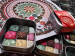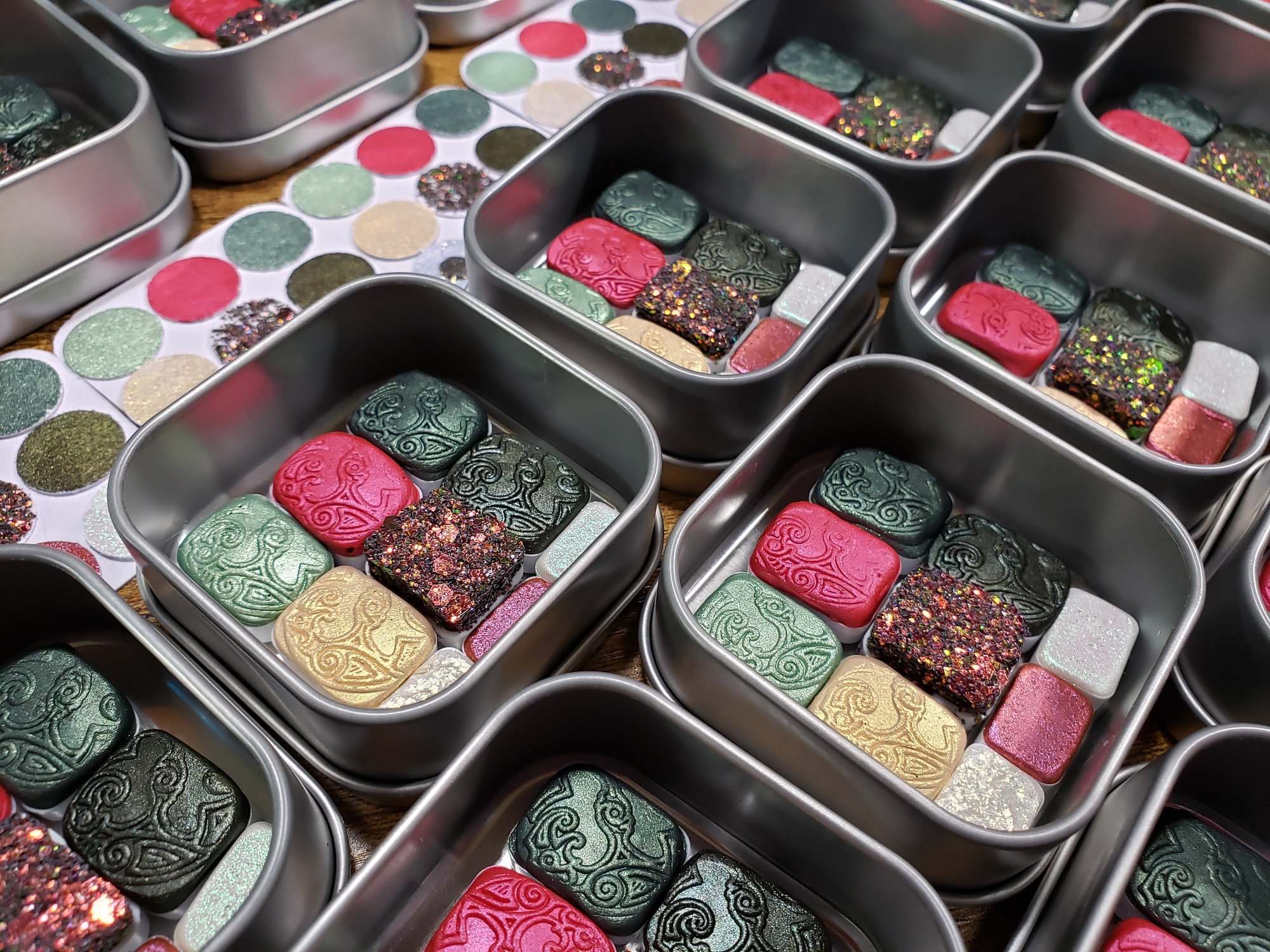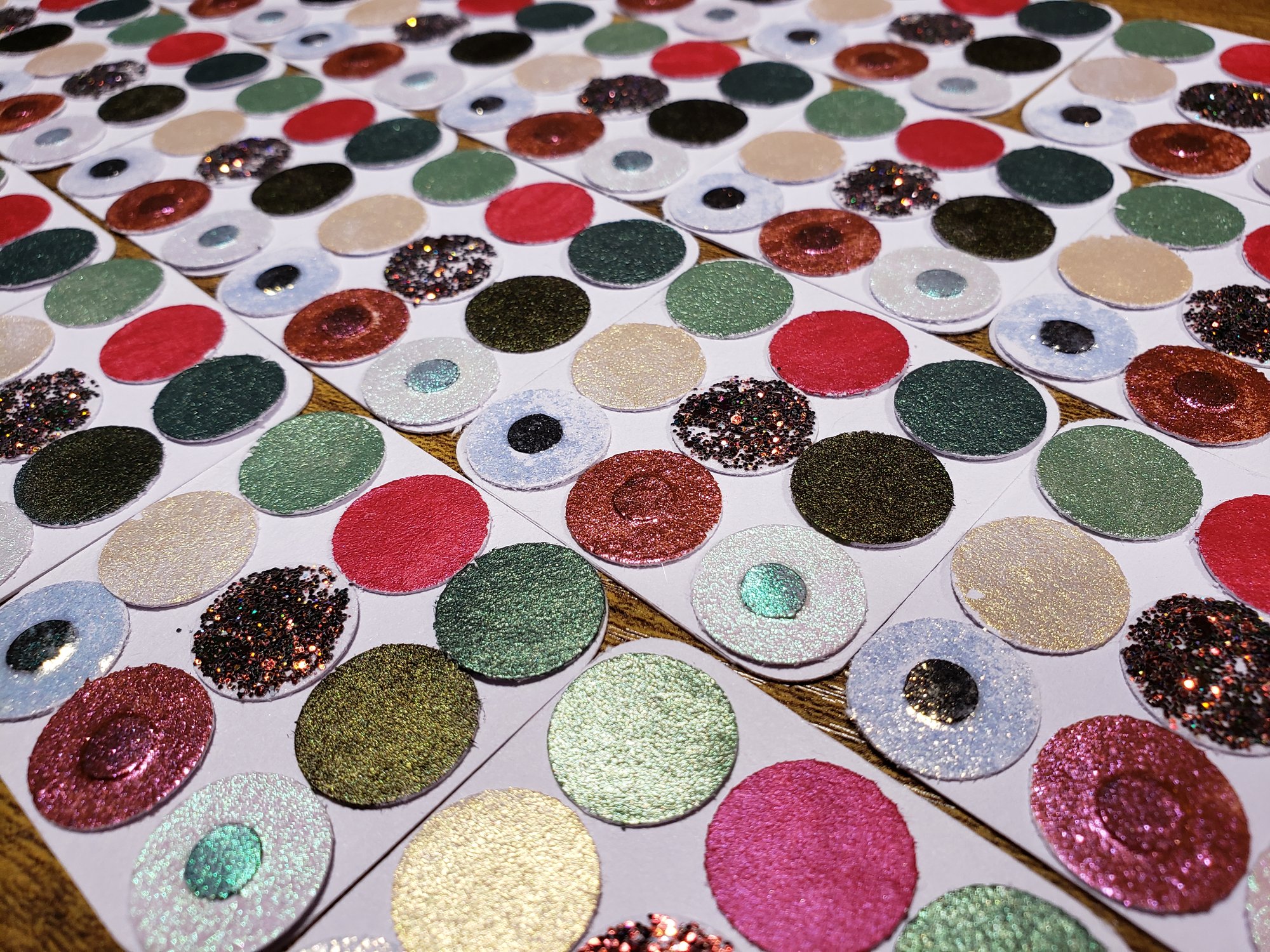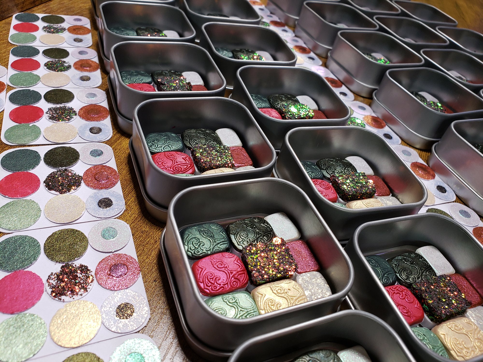 The finest holographic specular and mica pigments and glitter in small batch watercolors, made with all organic binders. I use the best essential clove oil as a preservative and highest grade gum arabic powder available.