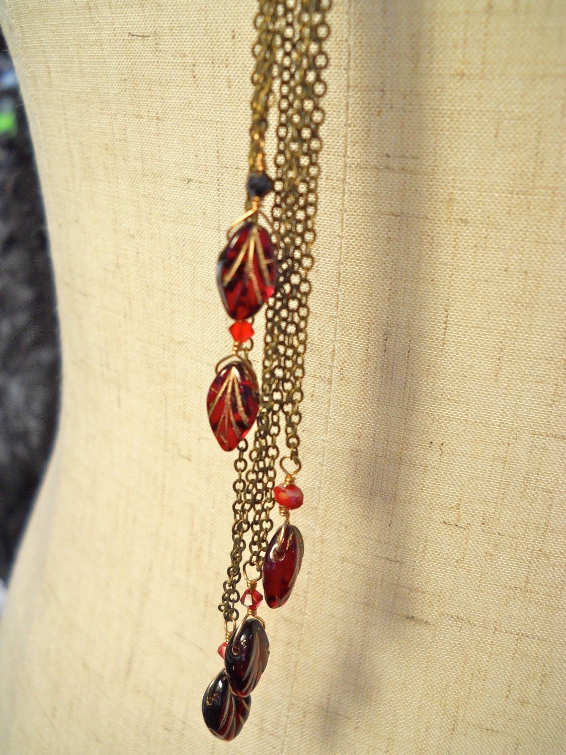 Simple, long, elegant, and beautiful, this matching necklace and earrings set features brilliant red leaf-shaped vintage Polish beads hand-painted in gold. The long chain pendant in front has loops of chain attached by a fine Turkish bronze ring so that they can move freely, and are accented with Red Siam Swarovski crystals. The necklace is about 20 inches long and has a strong but delicate magnetic clasp to ensure you don't loose the chain, but still be able to take it off and put it on easily. The long dangling pendant hangs about eight inches from the bronze ring to the end of the chain.