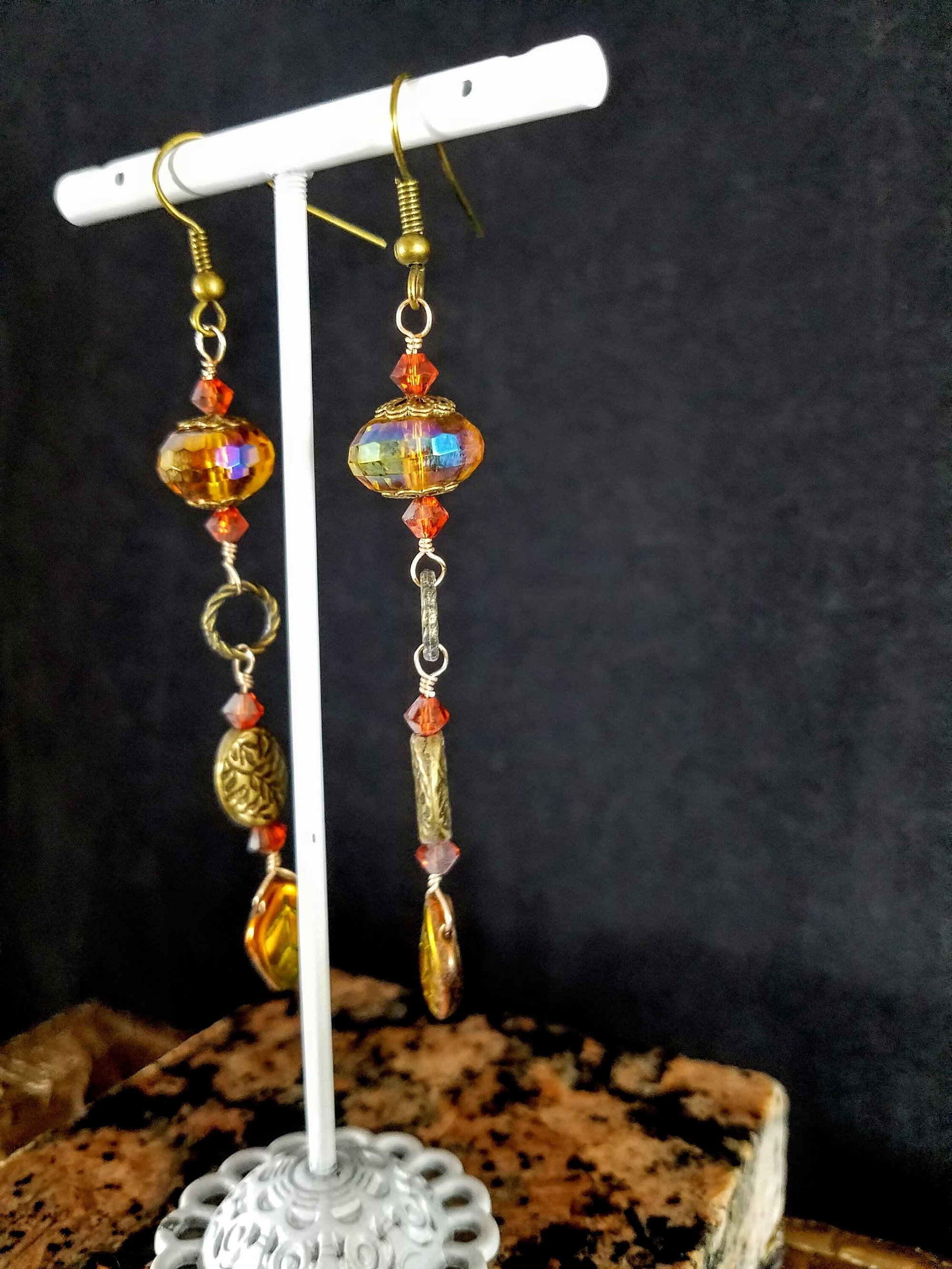At almost four inches long, these are what I like to call "shoulder dusters," because they're long enough to sweep the tops of your shoulders as you move. Surprisingly light for their size, you'll adore the way they swing and sway. Made from Turkish bronze wire and accents, amber colored hand cut Czech crystal drops, crystal frosted leaf drop beads, and Swarovski crystals, these are a pair of earrings perfect for that little black dress, a long lace-embellished Victorian one, or a pair of jeans and a t-shirt. Whether you want to go out on the town or to an elegant dinner, you won't be sorry you wore these.