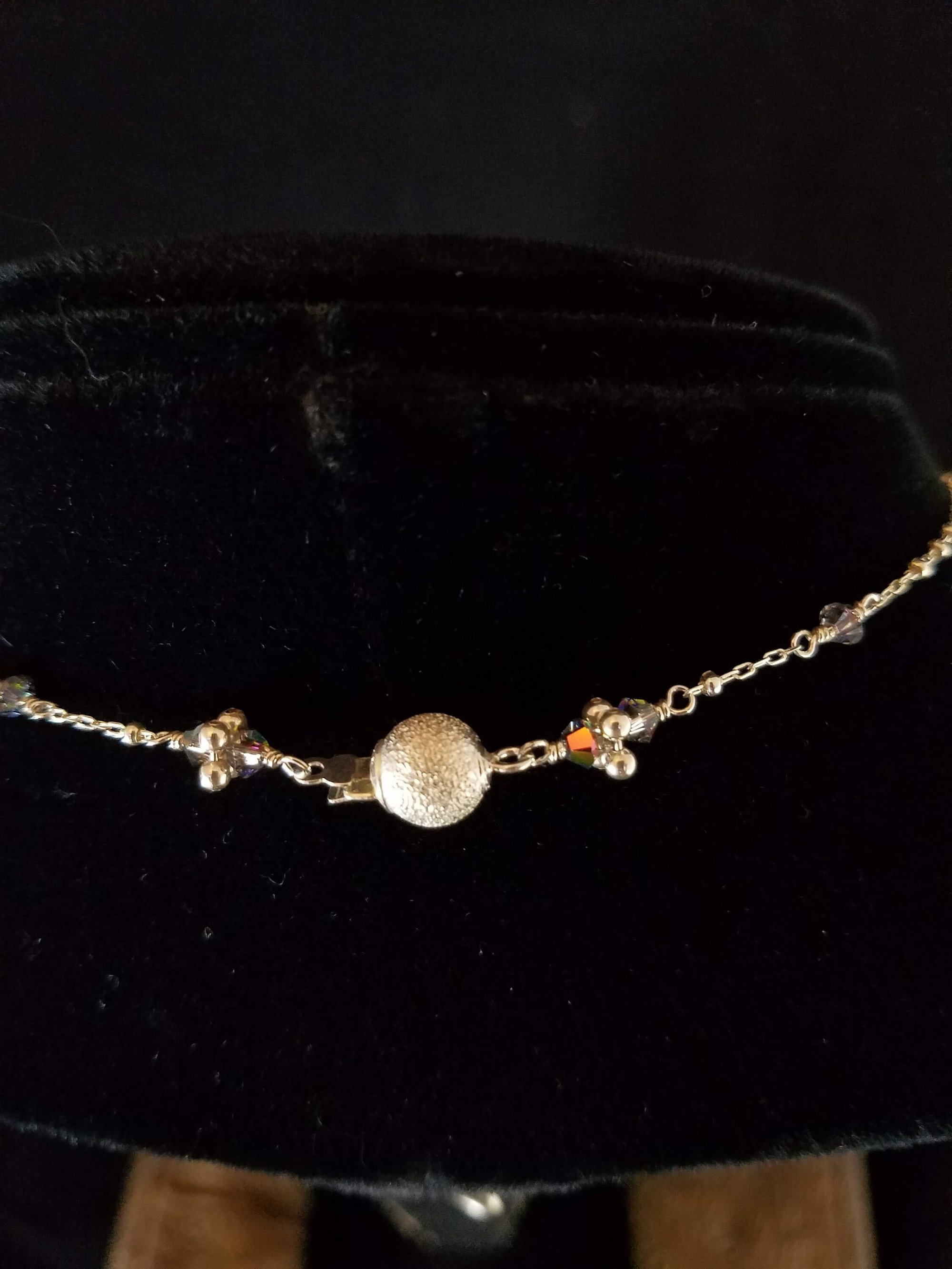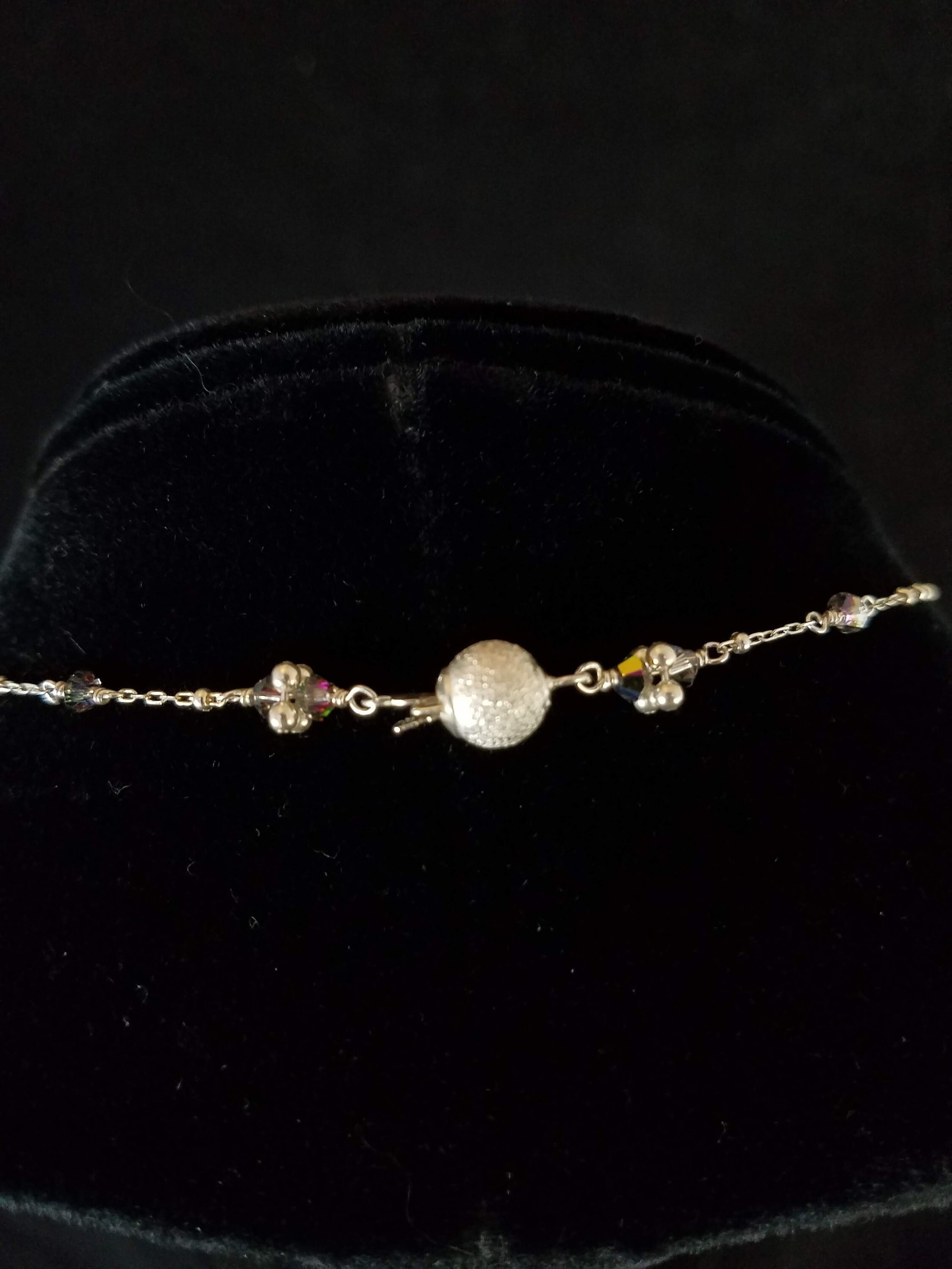 A beautiful and dazzling addition to any jewelry collection, this stunning sterling silver necklace features hand cut Czech crystals, Swarovski crystals, and sterling silver spacers and beads. The delicate chain measures about 16 inches long and has a lovely sterling silver "pumpkin" box clasp that will keep your treasure in place securely.