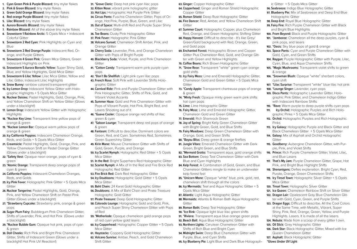 Our color selection changes once in a while. Here's the latest 127 AMAZING GLITTERY COLORS!