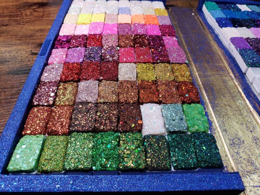 A huge and sturdy collection of the finest glitters mixes with mica blends in handmade watercolor mixes; small batch watercolors in individual shades, made with all organic binders. I use the best essential clove oil as a preservative and the highest grade gum arabic powder available.