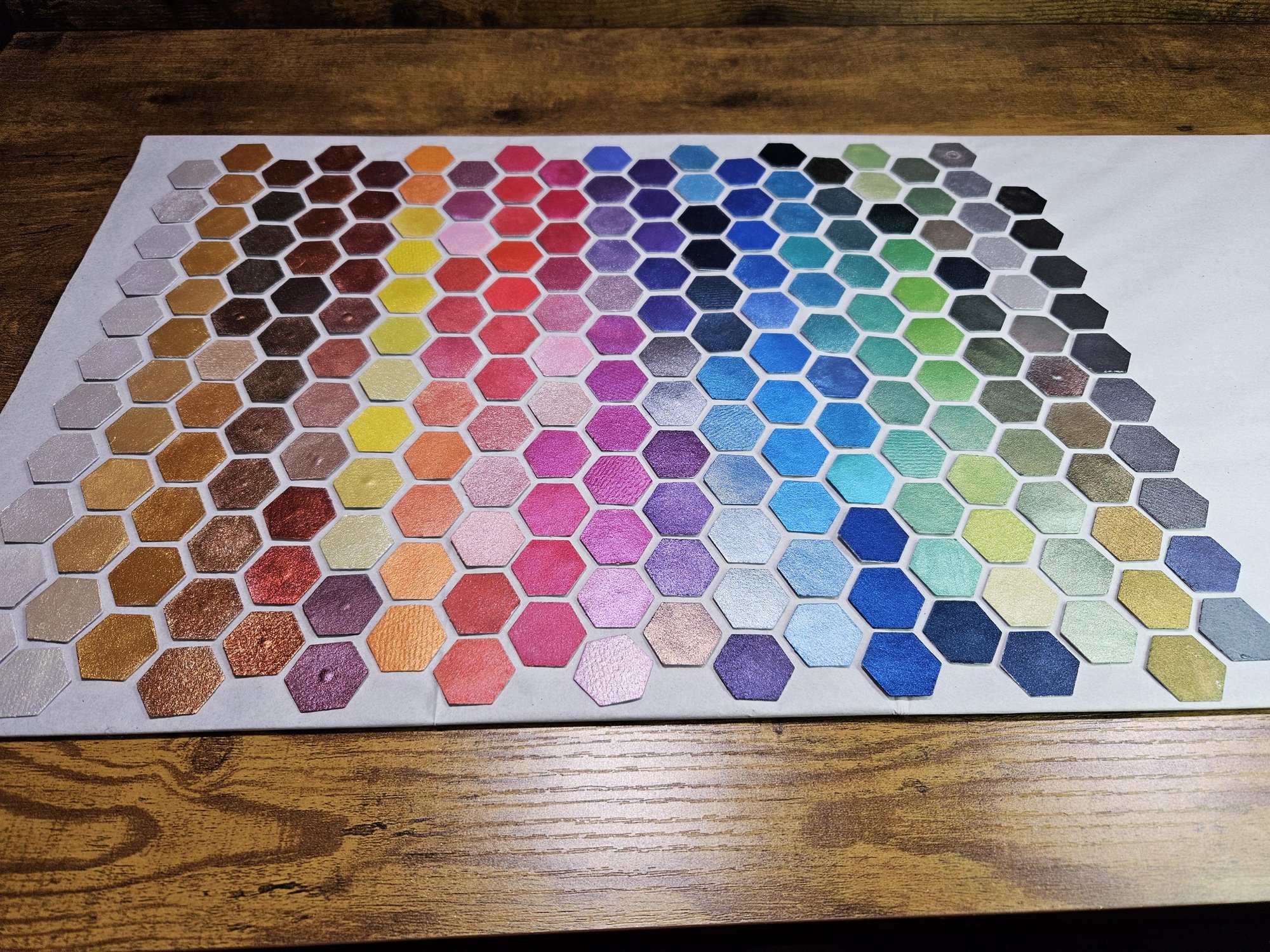 As long as I can remember, I've always wanted ALL the colors. It is my goal to offer you the largest range of shimmer mica watercolors as possible. At first glance, some of these colors may seem similar. I encourage you to consider much more than just color (basic location on the color wheel) when making your choices: tone/hue (what under colors are present? Over tones?), finish (is it shiny, very shiny, sparkly, satin, or matte?), opacity (sheer or fully opaque?), and light effects (how does light shift as it passes over the paint?).