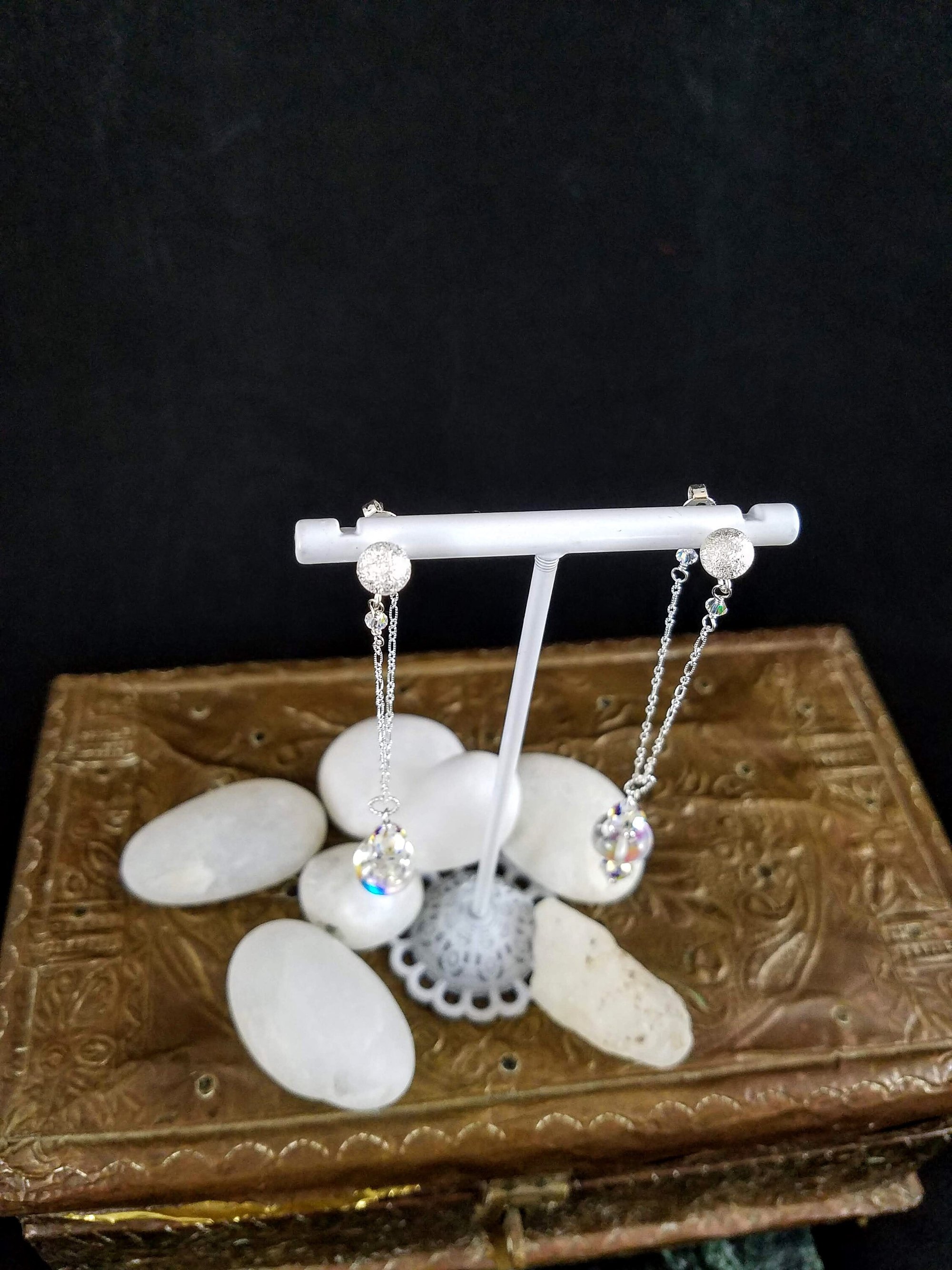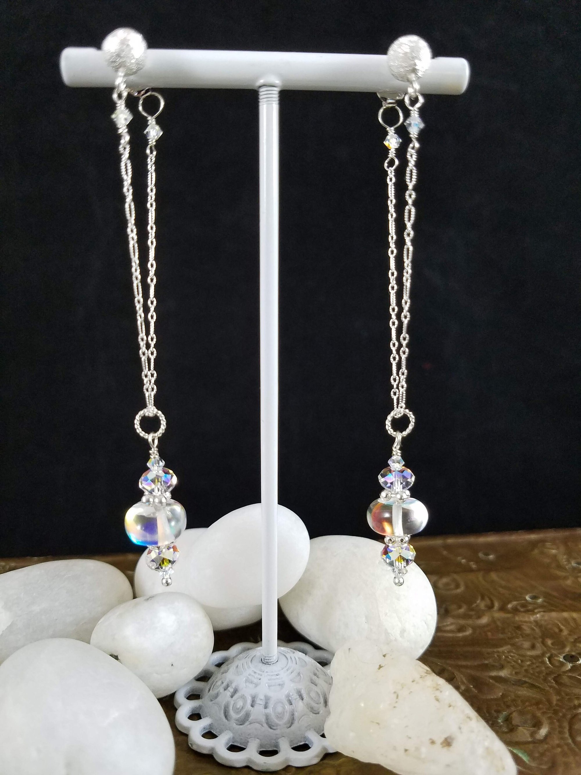 The subtle inner rainbow glow of crystal glass drops with Czech and Swarovski crystals magnified with Thai Hill Tribe sterling silver accent beads, chain, and amazing laser cut sterling earring posts. Handmade by a native San Diego artist with sterling silver wire and a sincere love of things that sparkle. These dazzling earrings also have a great safety feature; the sterling chain connects both the front and back of the earring to ensure it doesn't get lost while you shake it on the dance floor.