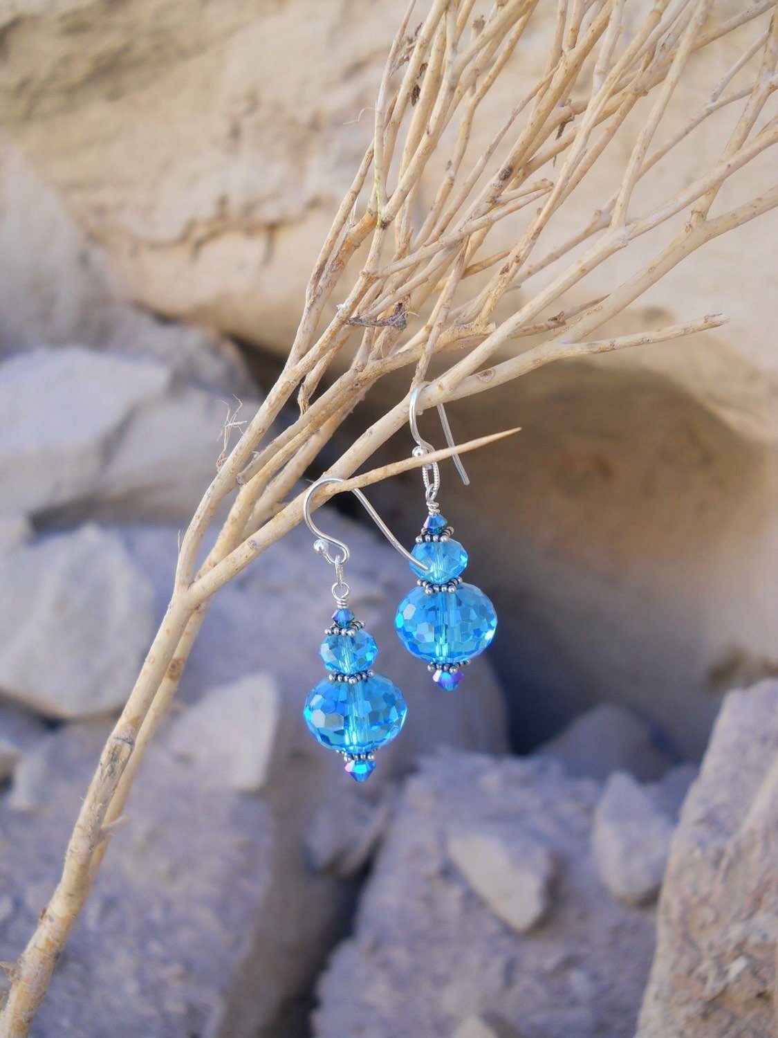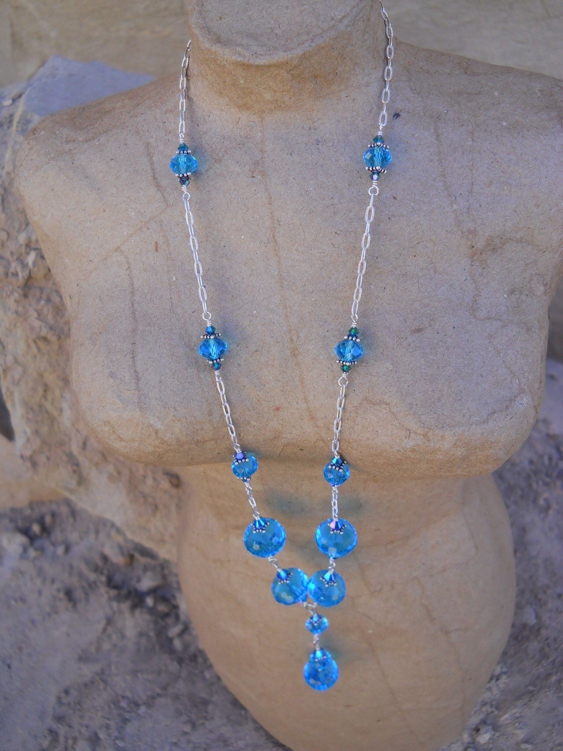 Inspired by the Showtime drama, "The Tudors," this turquoise bright blue Czech and Swarovski crystal necklace looks like a clear mountain lake or the summer desert sky at noon. These wonderful pieces both feature sterling silver wire crafted by a native San Diego, CA, artist with sterling silver accents, beads, chain, Sterling "S" clasp, and French hooks on the earrings. This gorgeous set would be a perfect addition to any Medieval or Renaissance garb, and just as easily with a Steampunk or Victorian lady's wardrobe. The necklace is about 20 inches long, the earrings are 1 1/2 inches. The short pendant in front measures just over an inch.