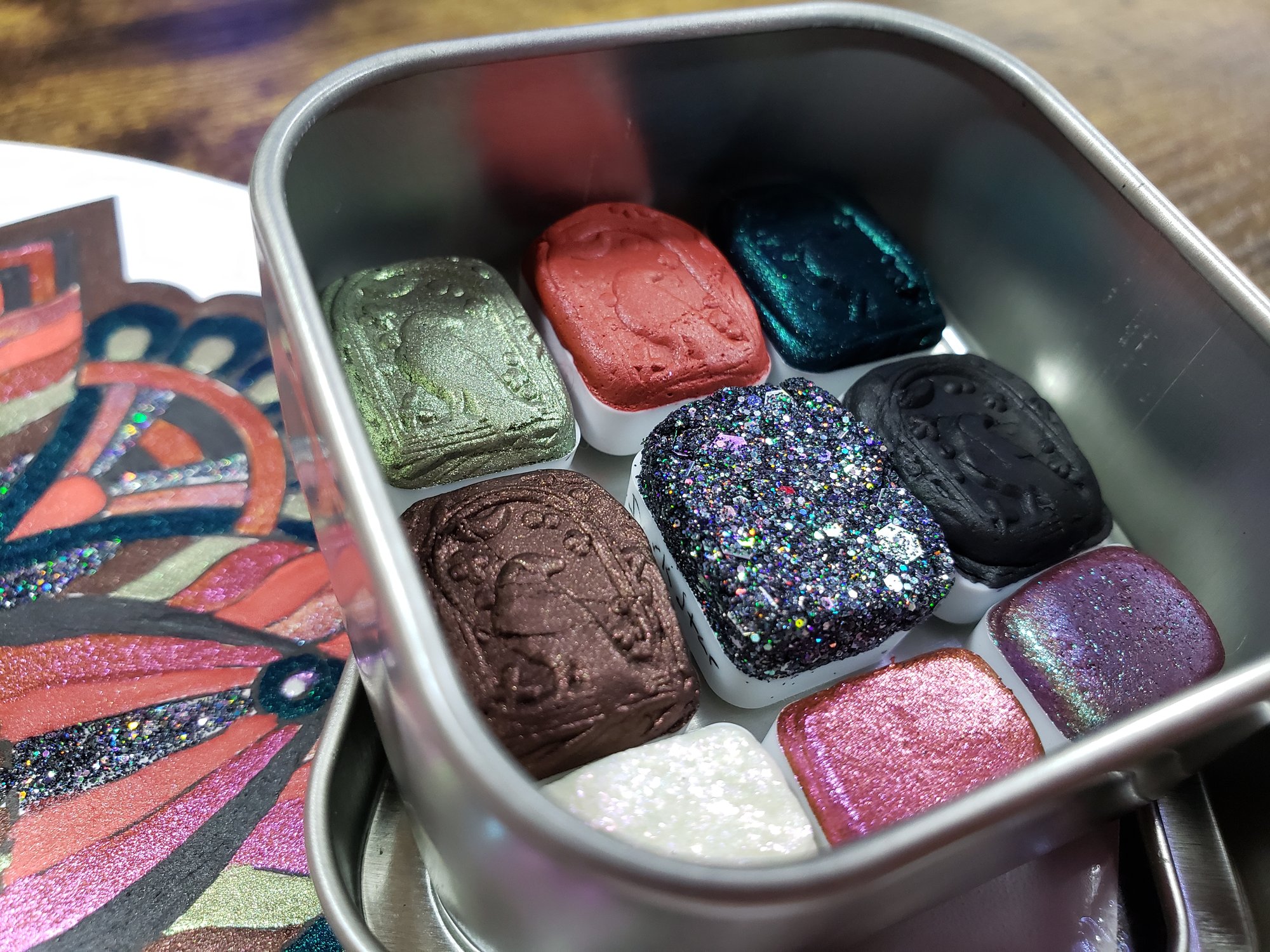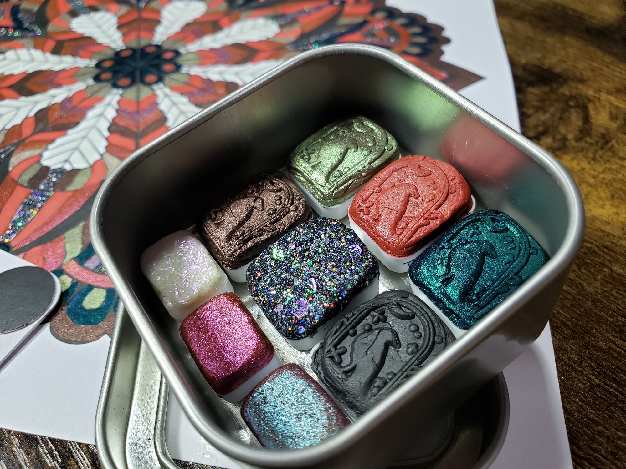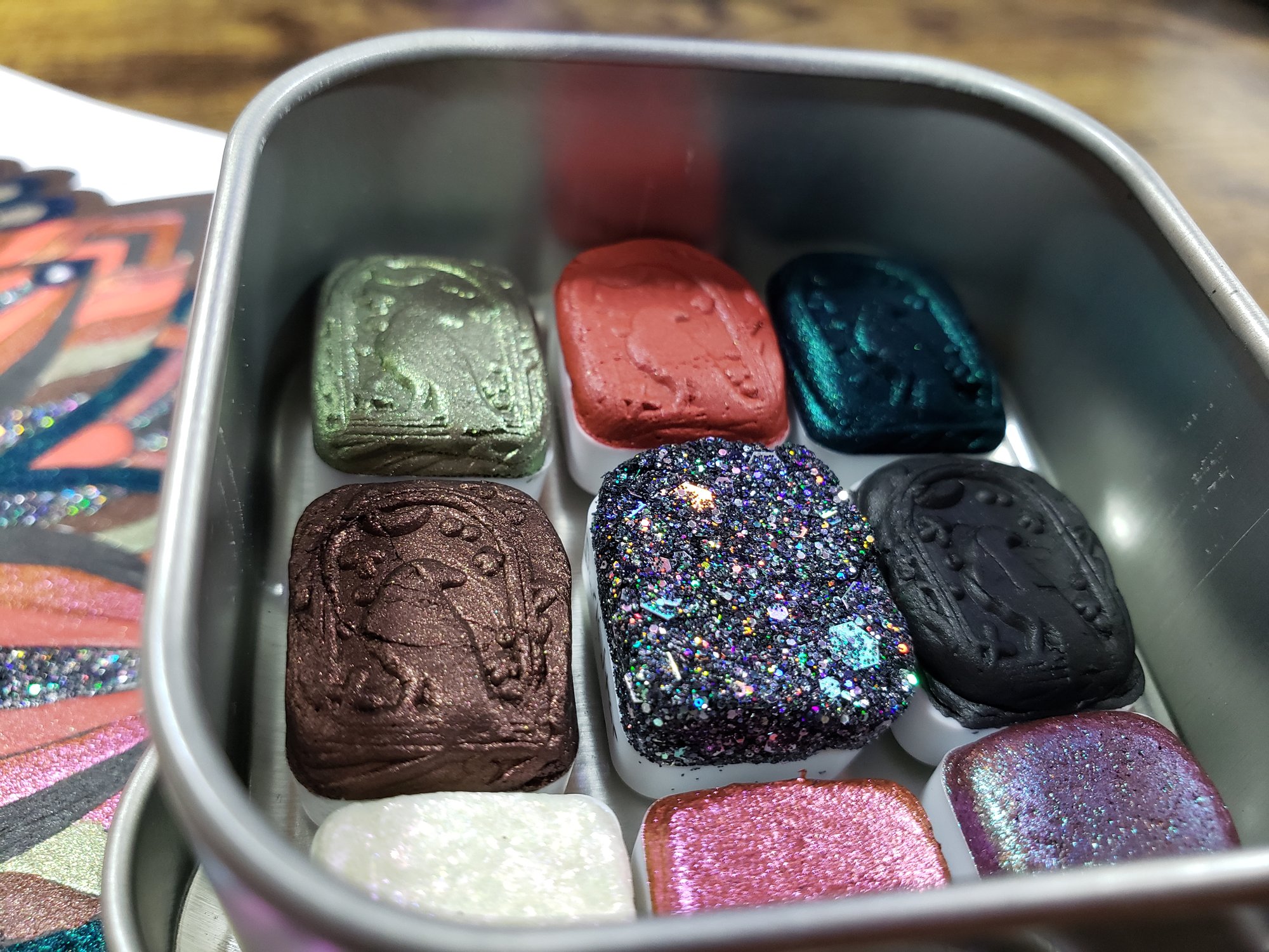 The finest holographic specular and mica pigments, .05mm, and .1mm glitter in small batch watercolors in 10 shades, made with all organic binders. I use the best essential clove oil as a preservative and highest grade gum arabic powder available.