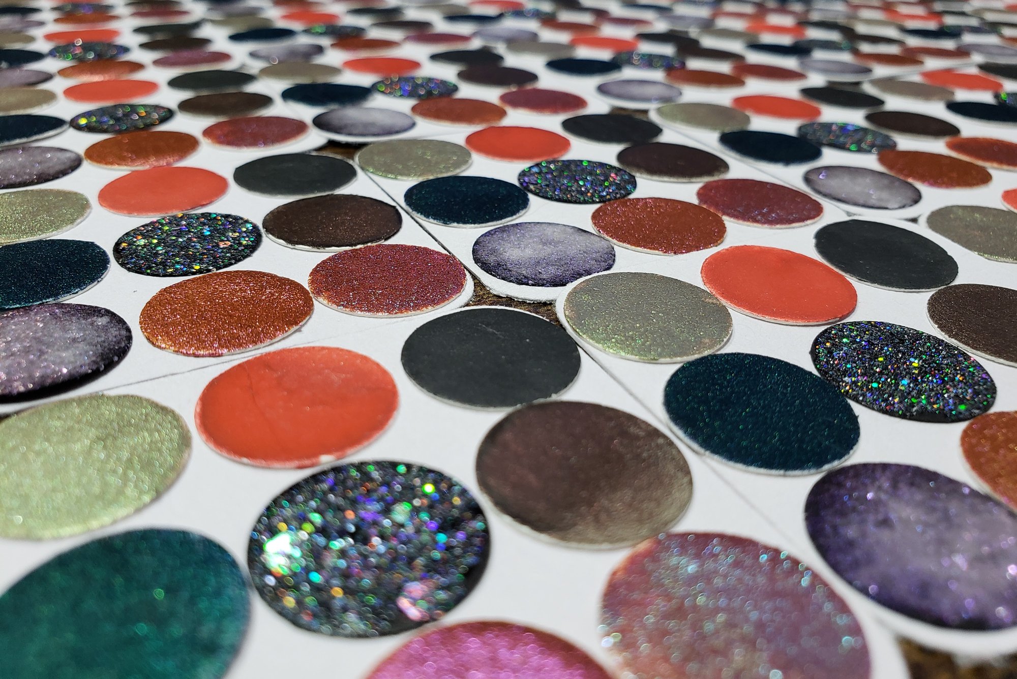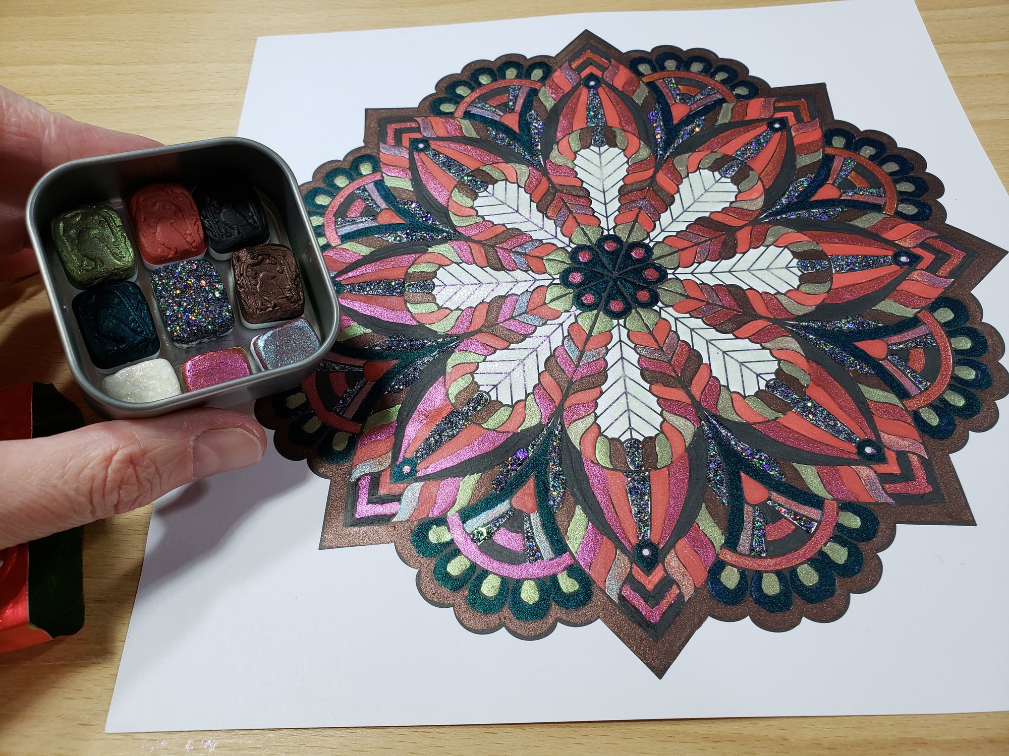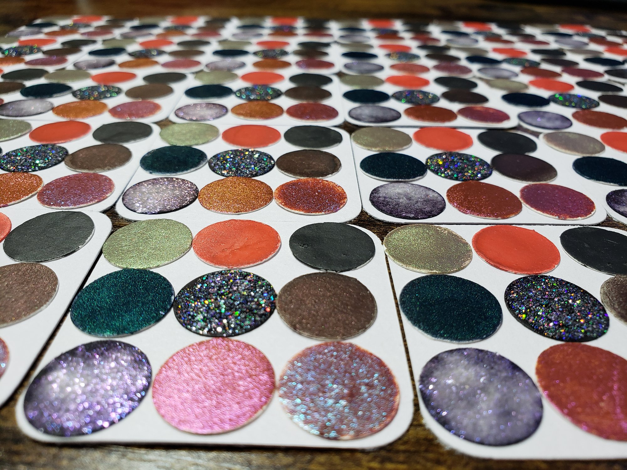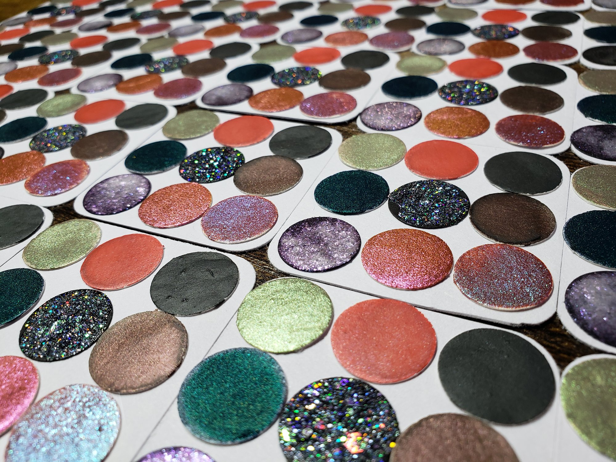 The finest holographic specular and mica pigments, .05mm, and .1mm glitter in small batch watercolors in 10 shades, made with all organic binders. I use the best essential clove oil as a preservative and highest grade gum arabic powder available.