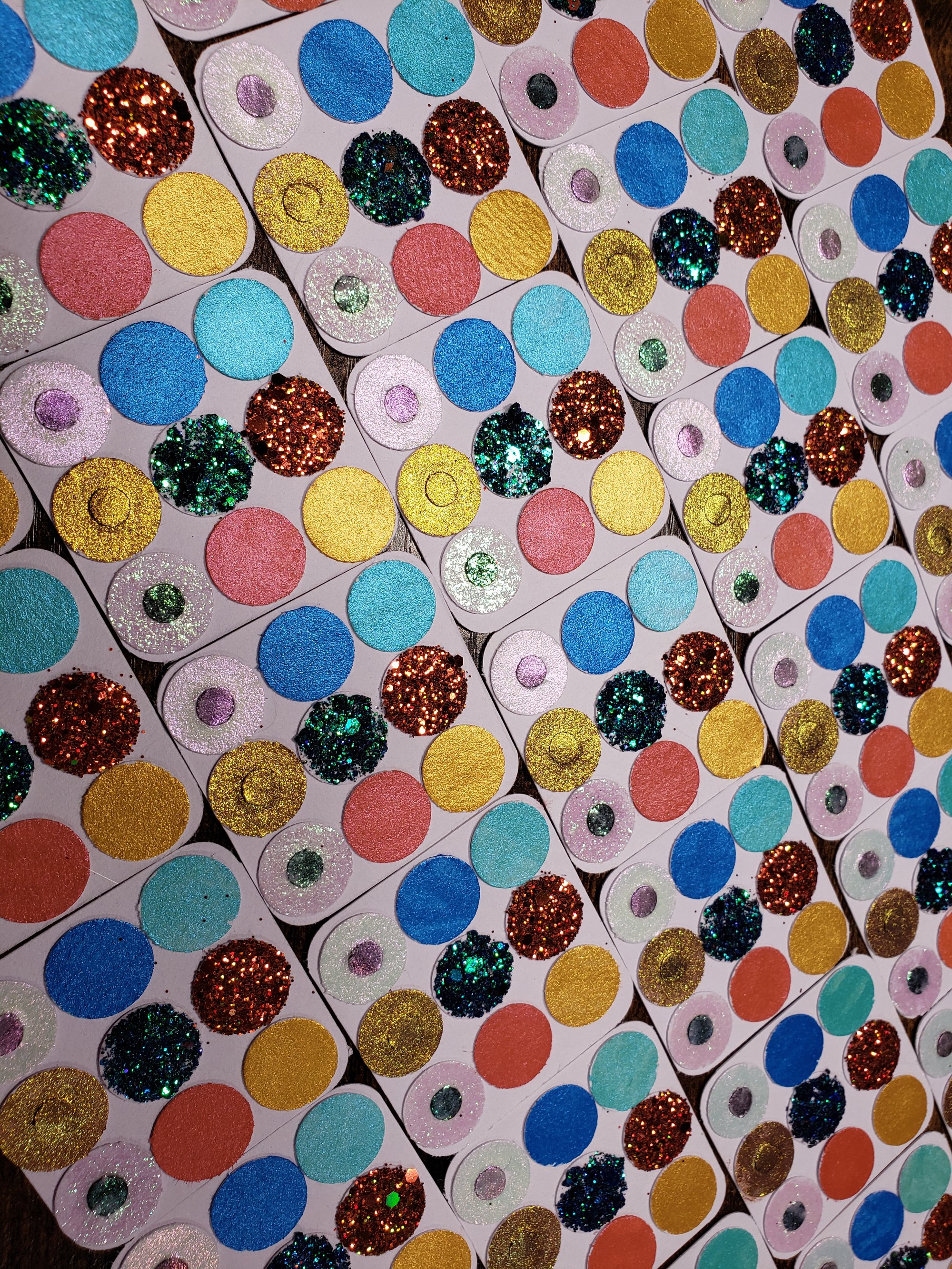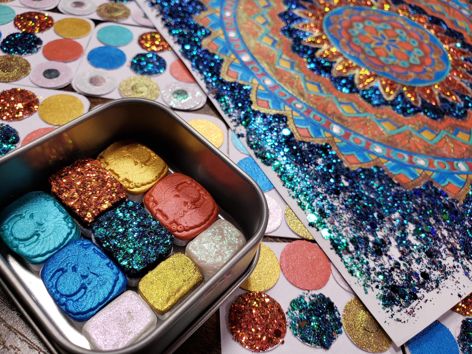 The finest holographic specular and mica pigments, and .1mm glitter in small batch watercolors, made with all organic binders. I use the best essential clove oil as a preservative and highest grade gum arabic powder available.