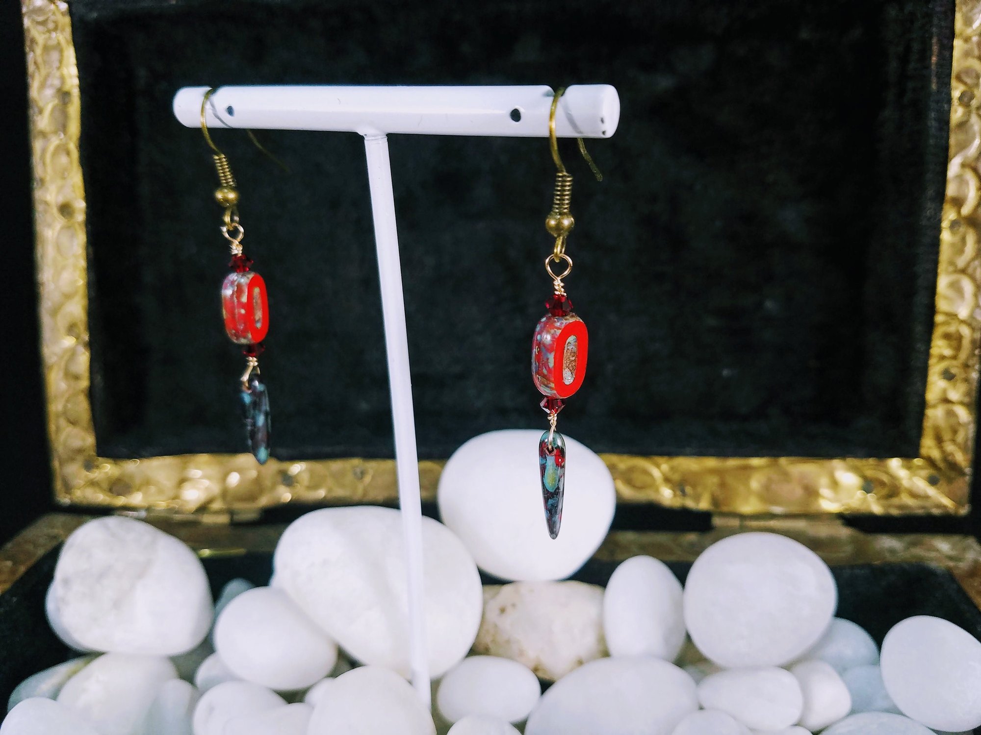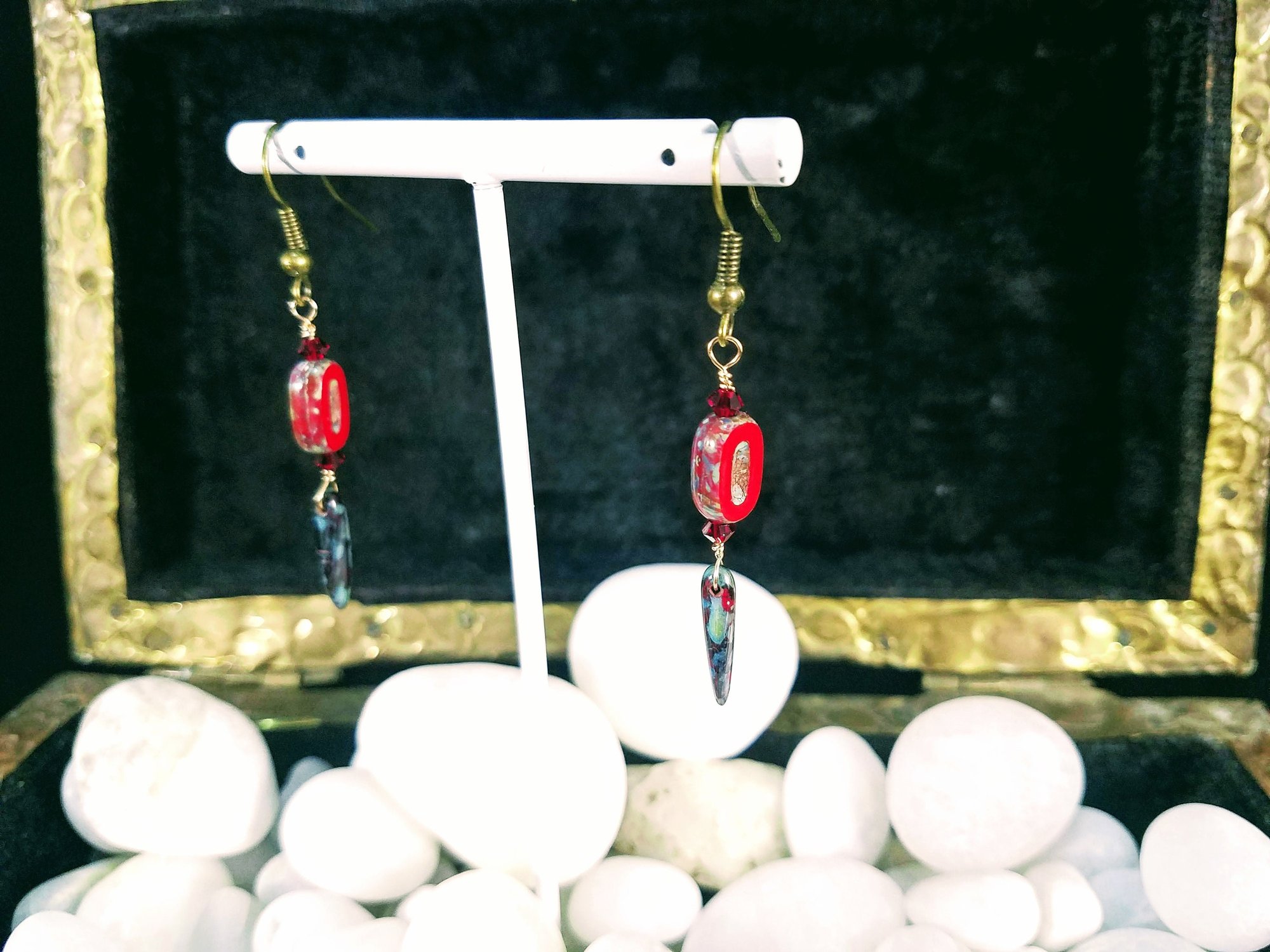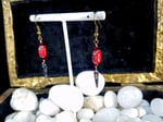 Not too long and delightfully lovely, these earrings have a lot of awesome going on. Lovely red Picasso coated beads blades and accented with amazing Red Siam Swarovski crystals. So light weight with crystal accents. These earrings measure about 1 1/2 inches long.
