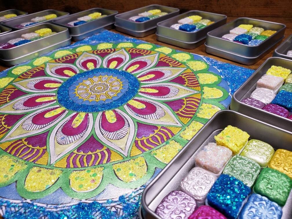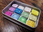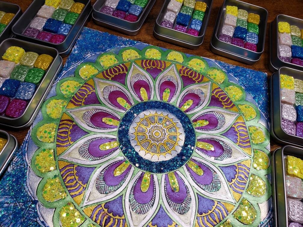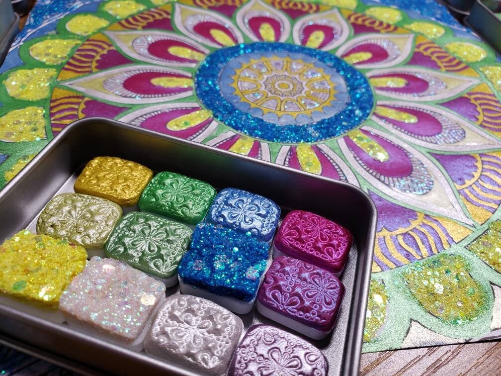 The finest glitters and mica pigments in small batch watercolors, made with all organic binders. I use the best essential clove oil as a preservative and highest grade gum arabic powder available.
