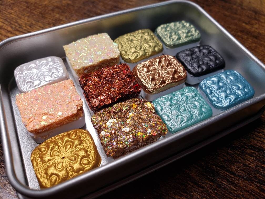 The finest mica pigments and glitters in small batch watercolors, made with all organic binders. I use the best essential clove oil as a preservative and highest grade gum arabic powder available.