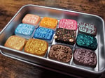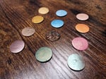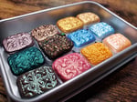 The finest holographic specular and mica pigments, .05mm, and .1mm glitter in small batch watercolors in 10 shades, made with all organic binders. I use the best essential clove oil as a preservative and highest grade gum arabic powder available.