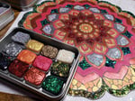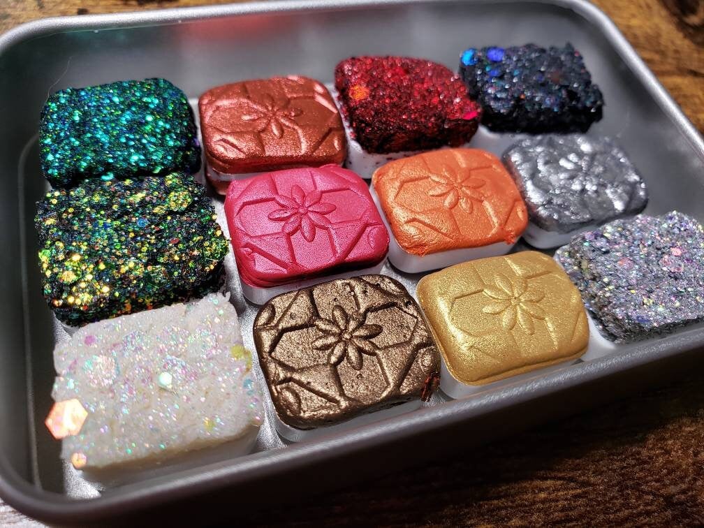 The finest glitters and mica pigments in small batch watercolors, made with all organic binders. I use the best essential clove oil as a preservative and highest grade gum arabic powder available.