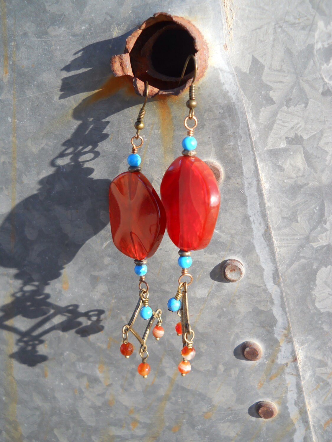 At around four inches long, these are what I like to call "shoulder dusters," because they're long enough to sweep the tops of your shoulders as you move. Surprisingly light for their size, you'll adore the way they swing and sway. Made from Turkish bronze wire and beads, natural red (looks like orange) jasper, and North African bronze dangles, they're a Mediterranean dream of summer colors. I found the handmade bronze dangles in the corner of a small booth at a local gem show and knew that I'd be able to make something unique and amazing! The tiny natural stone beads at the bottom catch the light and almost glow, adding luster and style to these cool tribal, BoHo earrings.