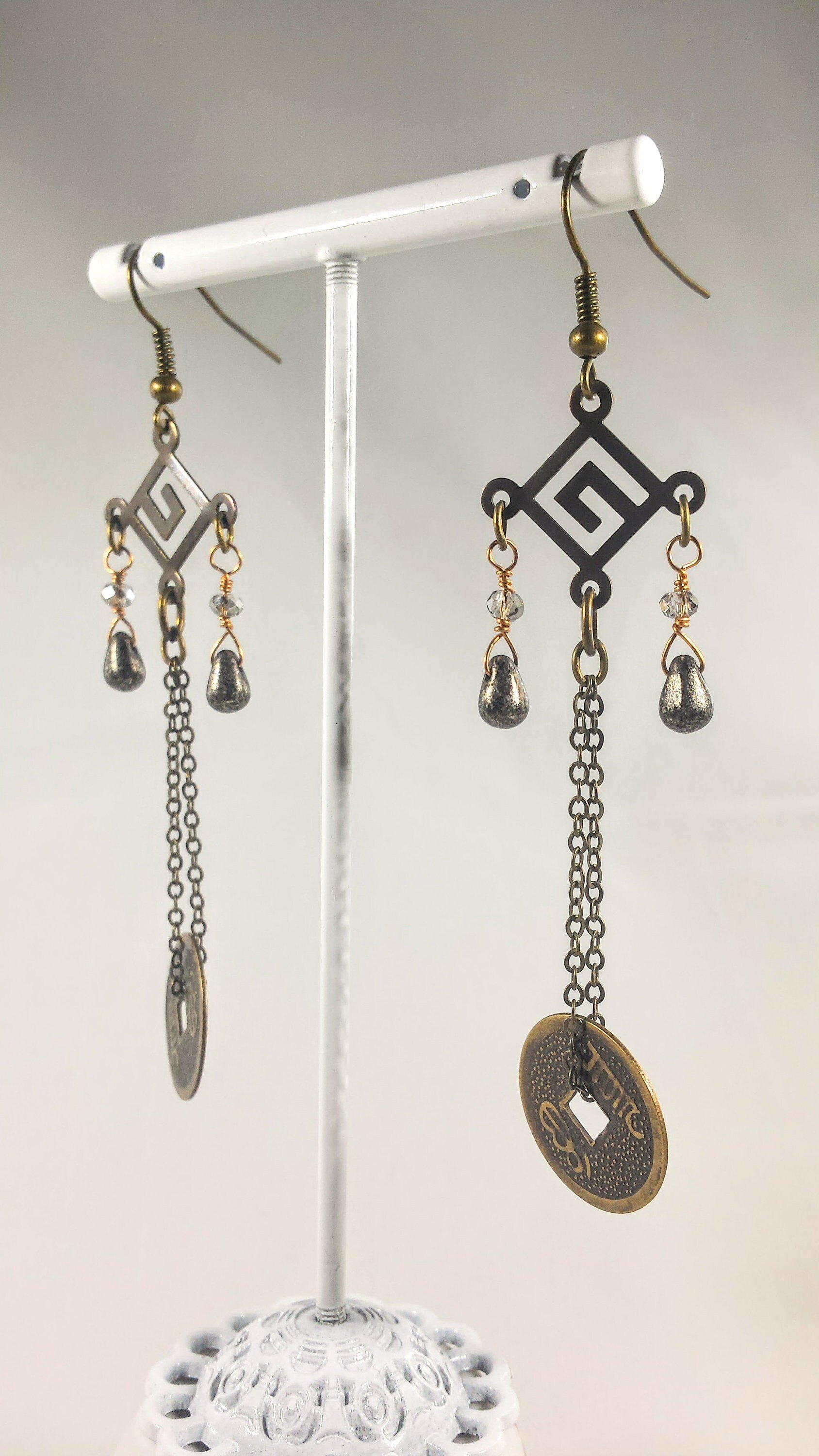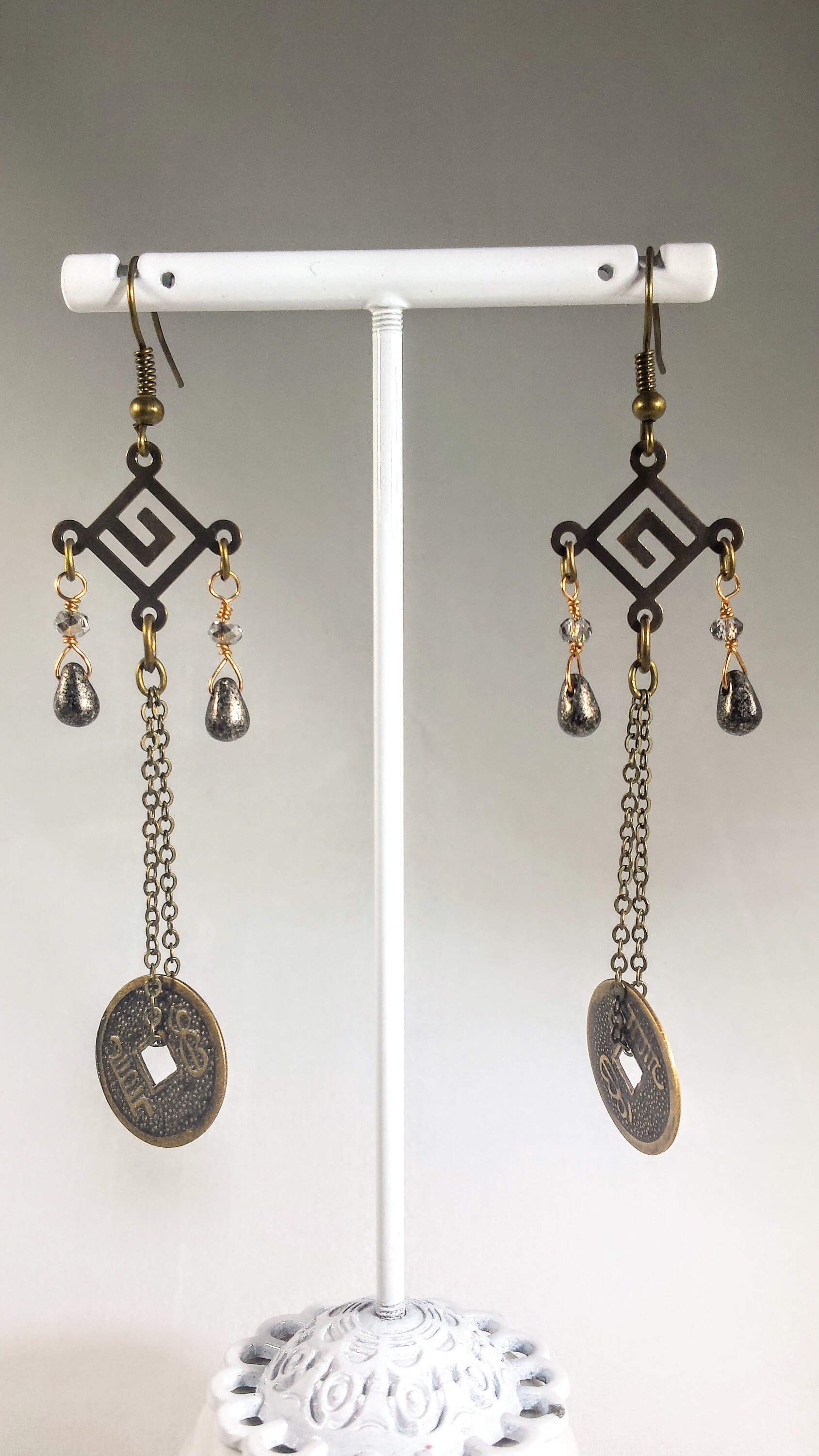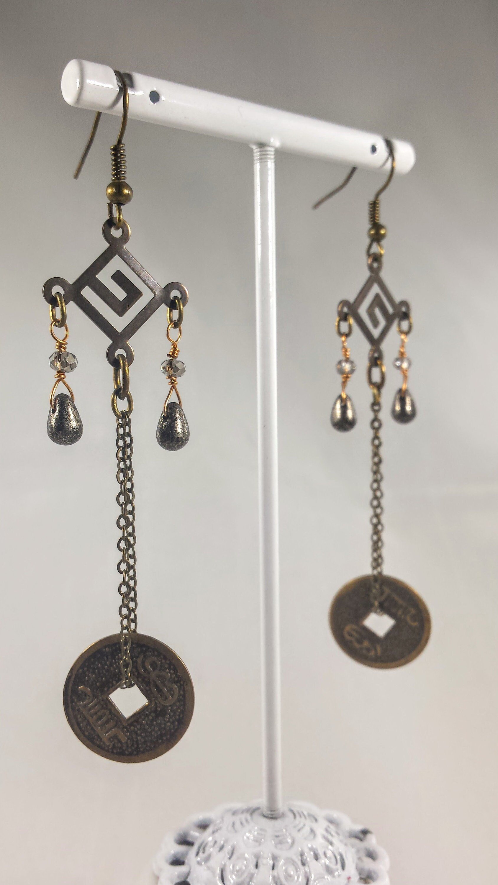Long and lovely, these earrings have a lot of awesome going on. Uniques grey stone drops, and Czech crystal accent the long bronze chains and Chinese style coins and bronze filigree, with a little extra sparkle, of course. These earrings measure about four inches long, which is why we call them "shoulder dusters."