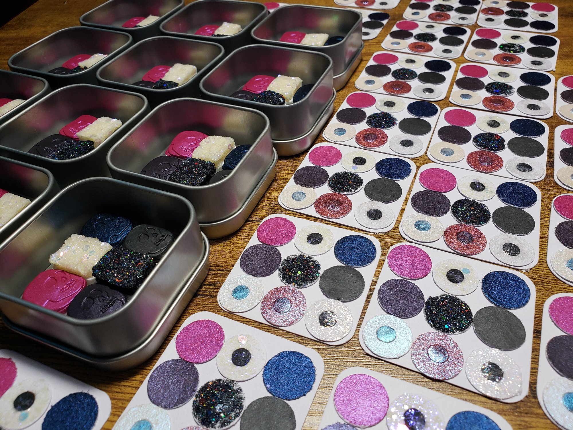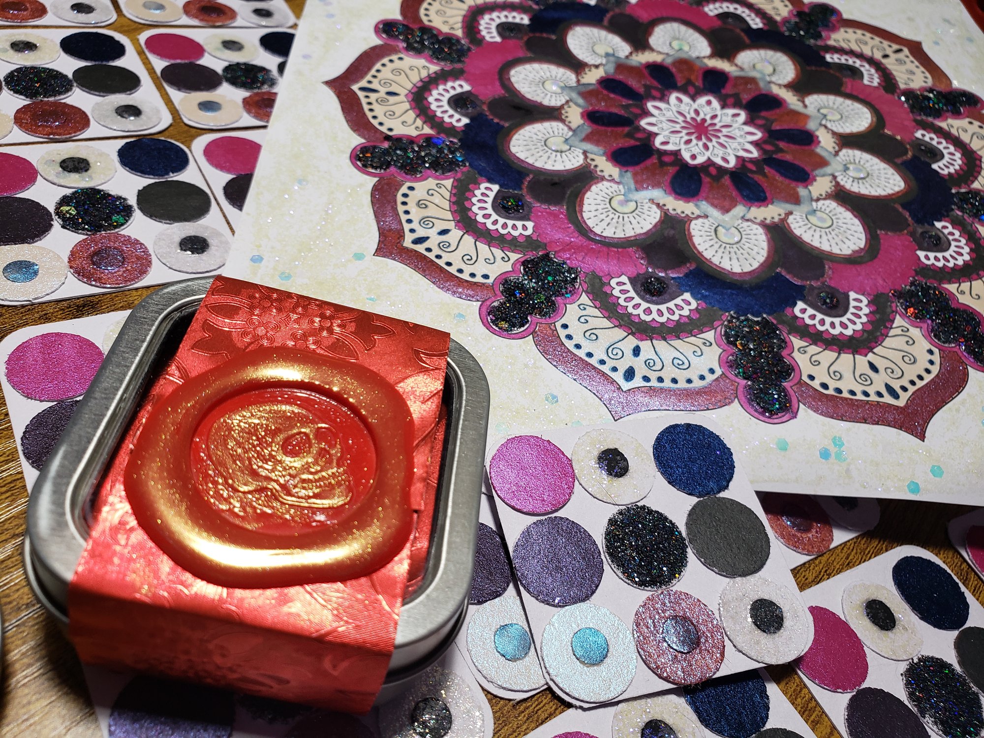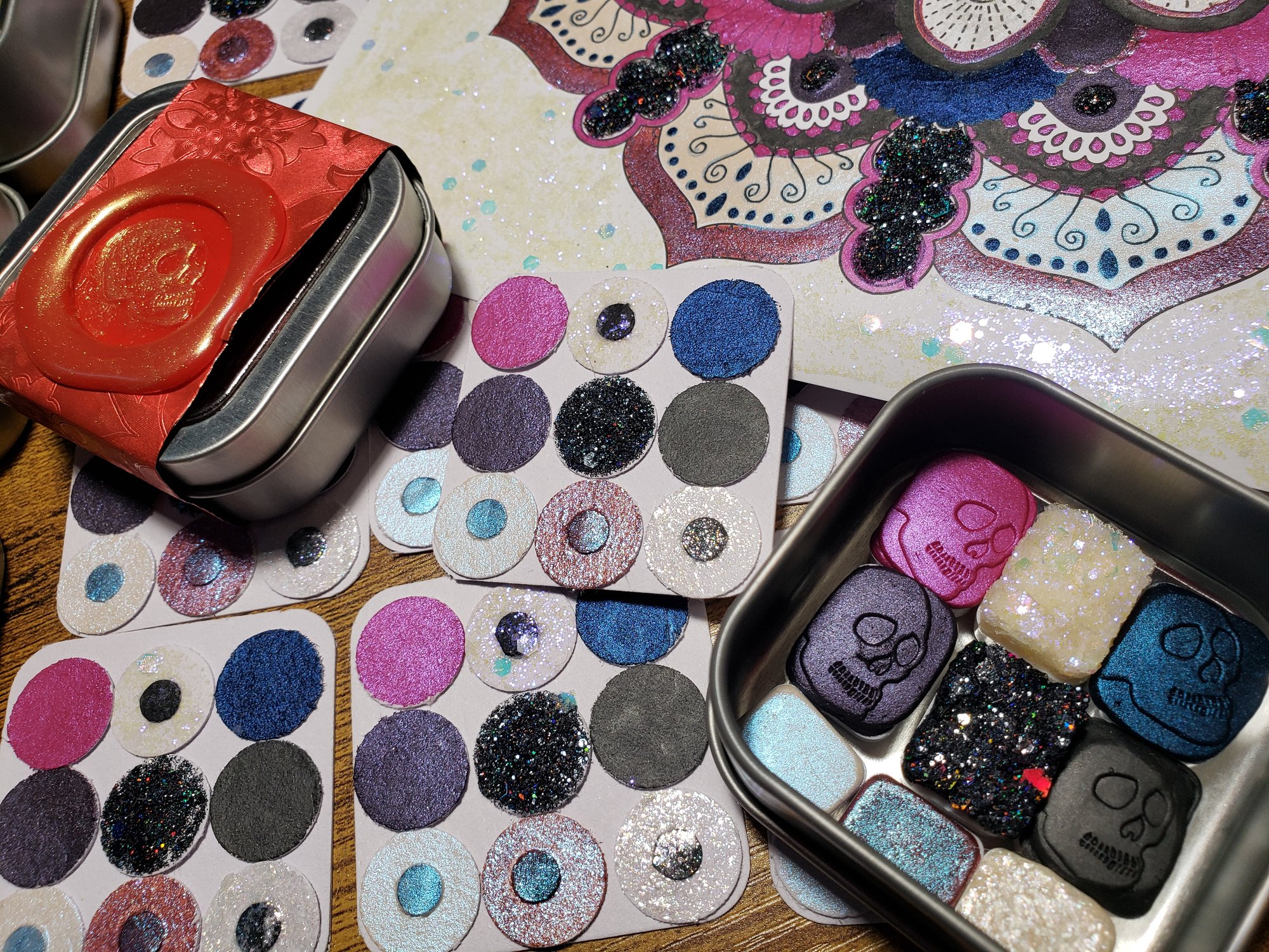 The finest holographic specular and mica pigments and glitter in small batch watercolors, made with all organic binders. I use the best essential clove oil as a preservative and highest grade gum arabic powder available.