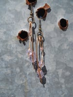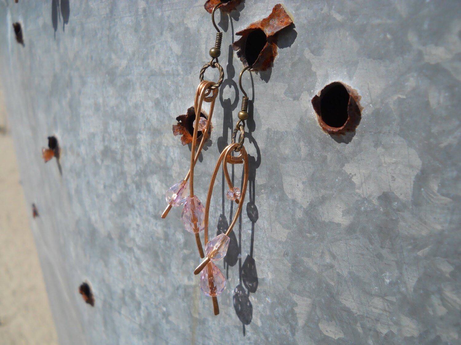 Long, elegant, and perfect to go with your best dress, these earrings are about 2 1/2 inches long, and feature hand hammered bronze wire "feathers" and an exotic variety of glass and pink crystal beads. Just the thing to add to your Victorian or Steampunk wardrobe, to an elegant event, or to wear to the office. The metal feathers make a great gift for the vegan or vegetarian in your life!