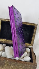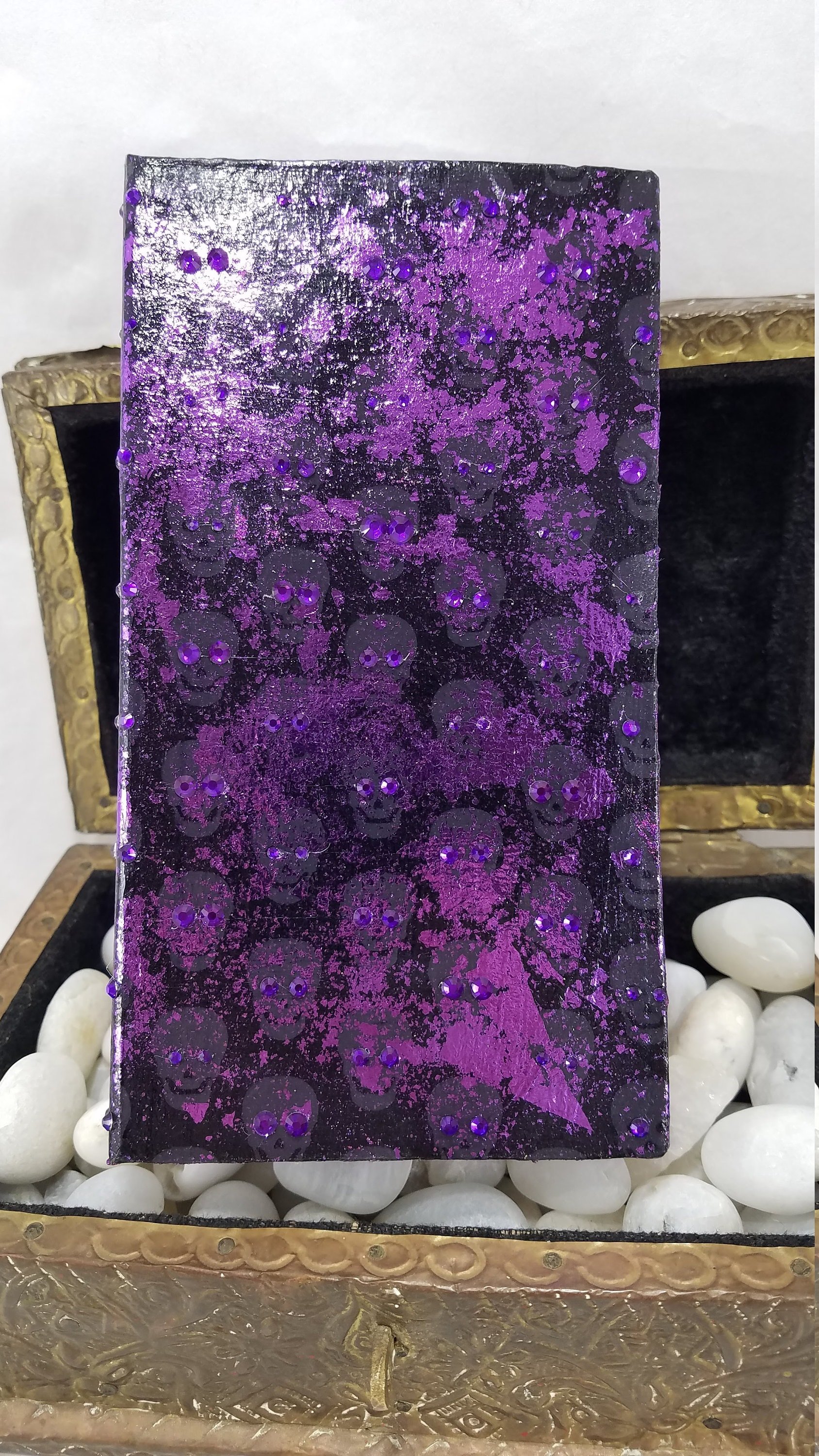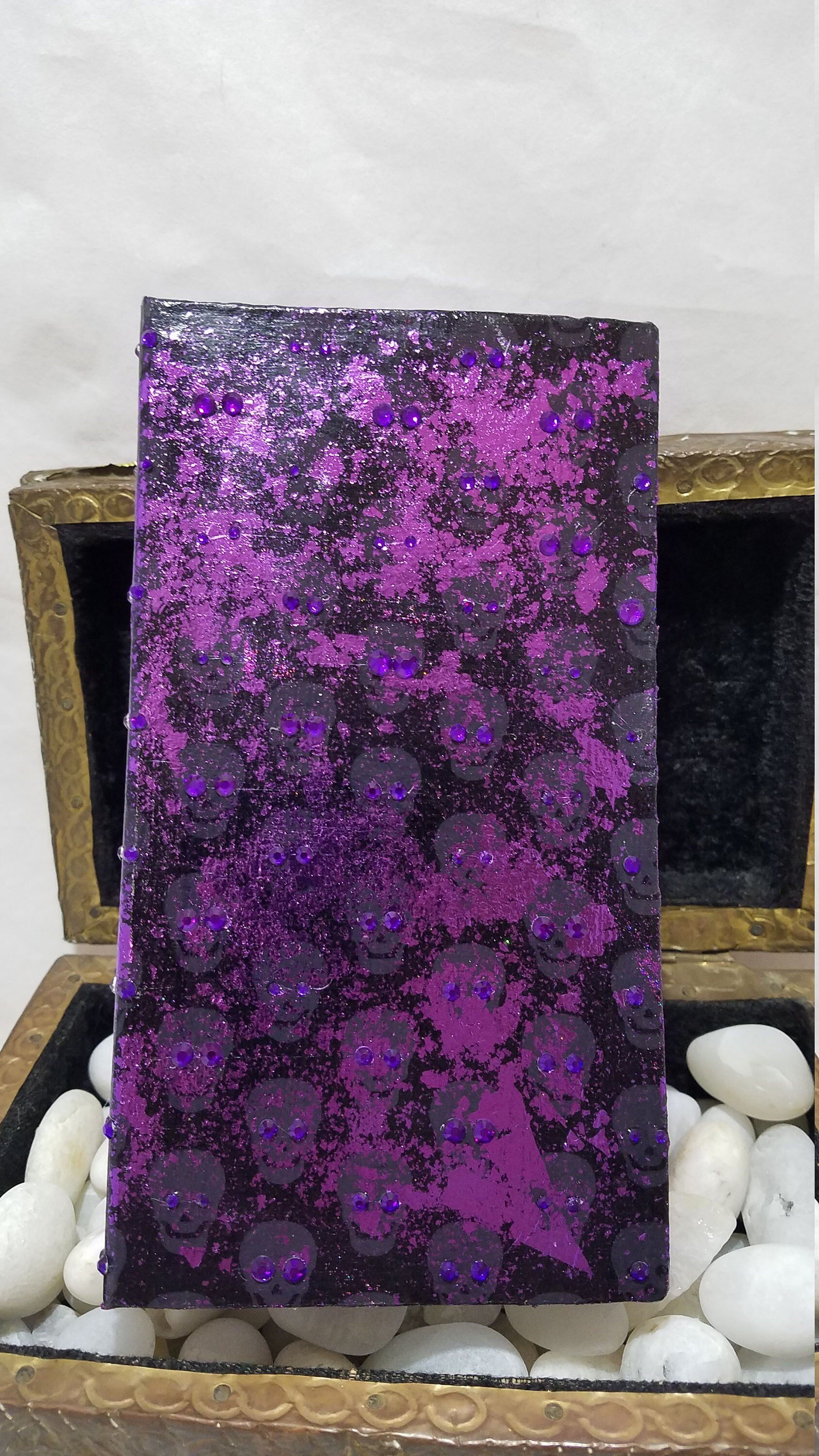 Original product name: Purple Aurora Borealis Rhinestoned Violet Metallic Foil Skull Self Care Shrine Handmade Magnetic Makeup Palette Double Sided Eyeshadow Case