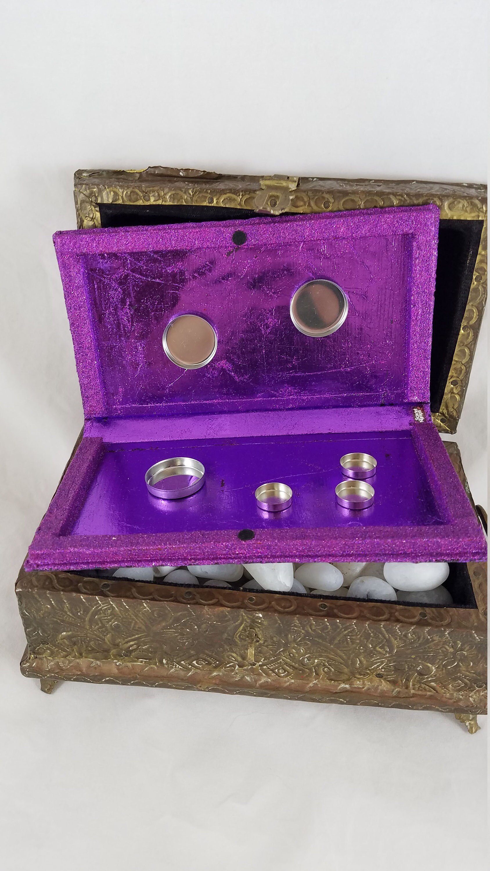 Makeup tins, magnetic sticker, buffing cloth, & satin bag [ size of your choosing, leave in notes: bag the size of the shrine or large enough for brushes & other products] included.