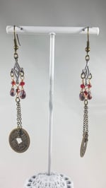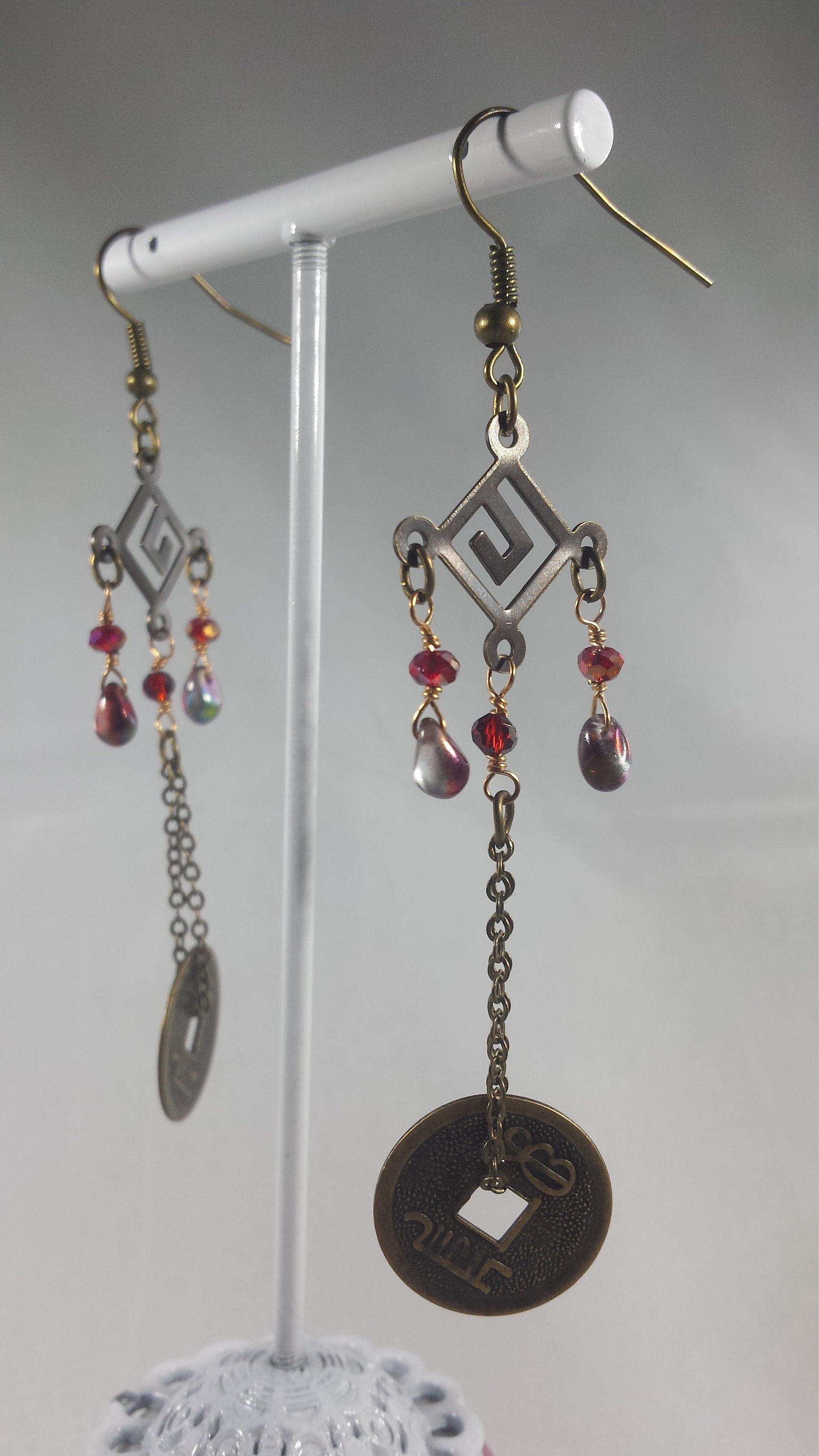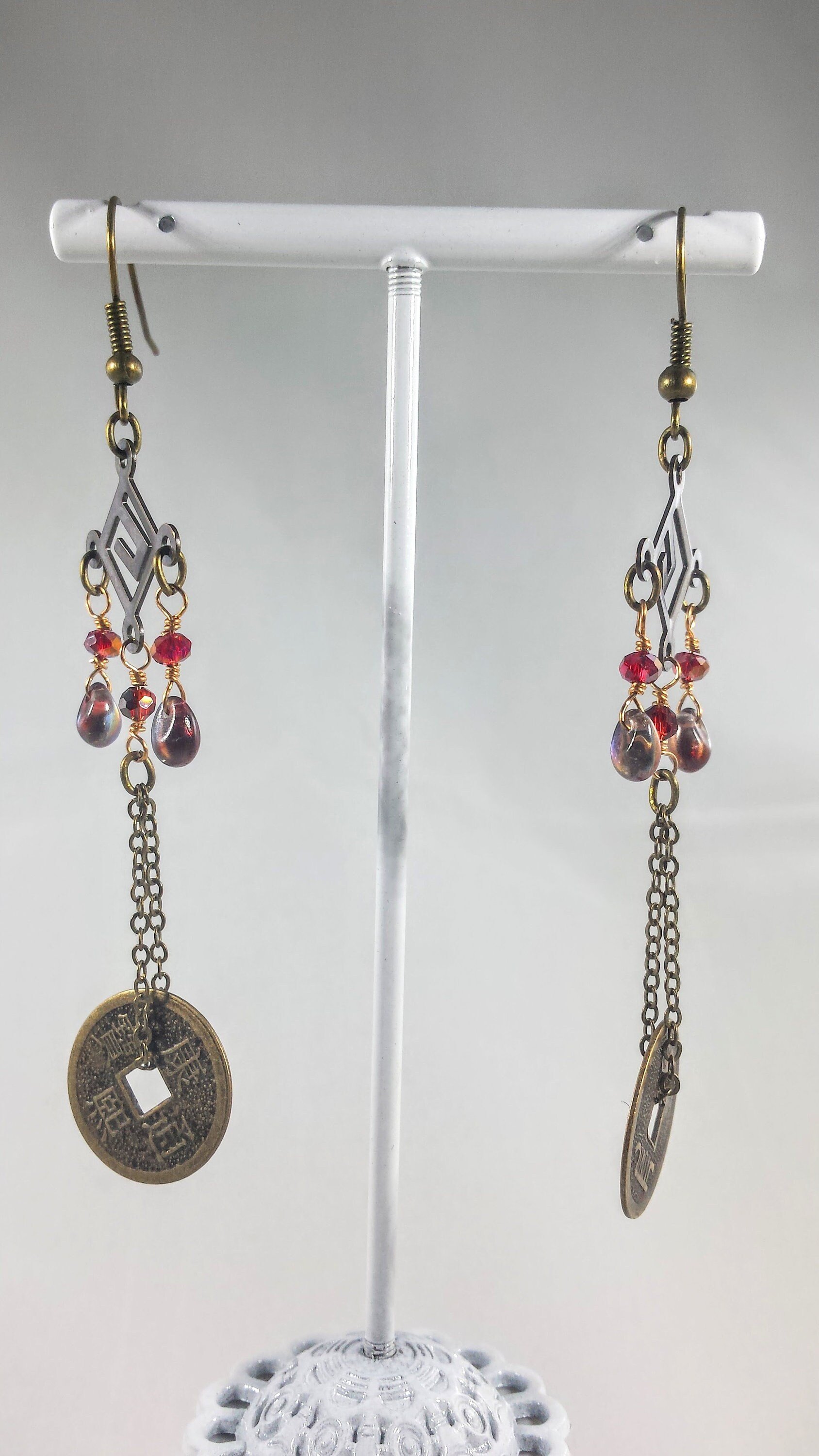 Long, elegant, and perfect to go with your best dress, these earrings are about 4 inches long, and feature bronze Chinese coins and an exotic Japanese Magatama and vintage crystal beads on extra length chains. Just the thing to add to your Victorian or Steampunk wardrobe, to an elegant event, or to wear to the office.