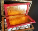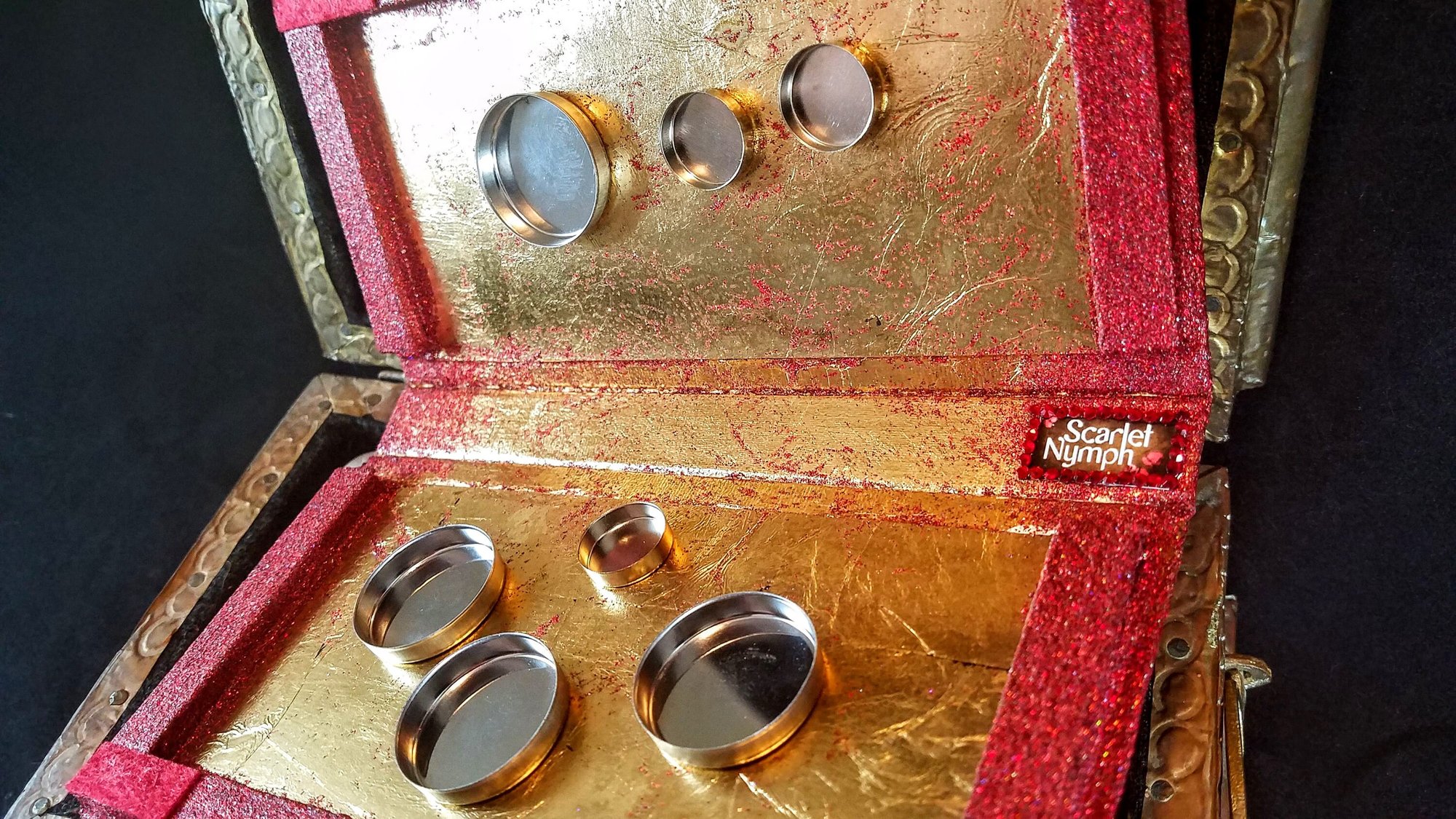 Handmade from artisian paper with abstract designs accented with brilliant aurora borealis rhinestones, gold foil, a holographic glitter, and a magnetic closing system. Both sides of the palette are magentic, so standard tin eyeshadow and lipstick pots will work great. The inside of this makeup shrine features a brilliant and gorgeous gold foil finish accented with amazing red foil, glittering rhinestones, and a ridiculous amount of gold holographic glitter!
