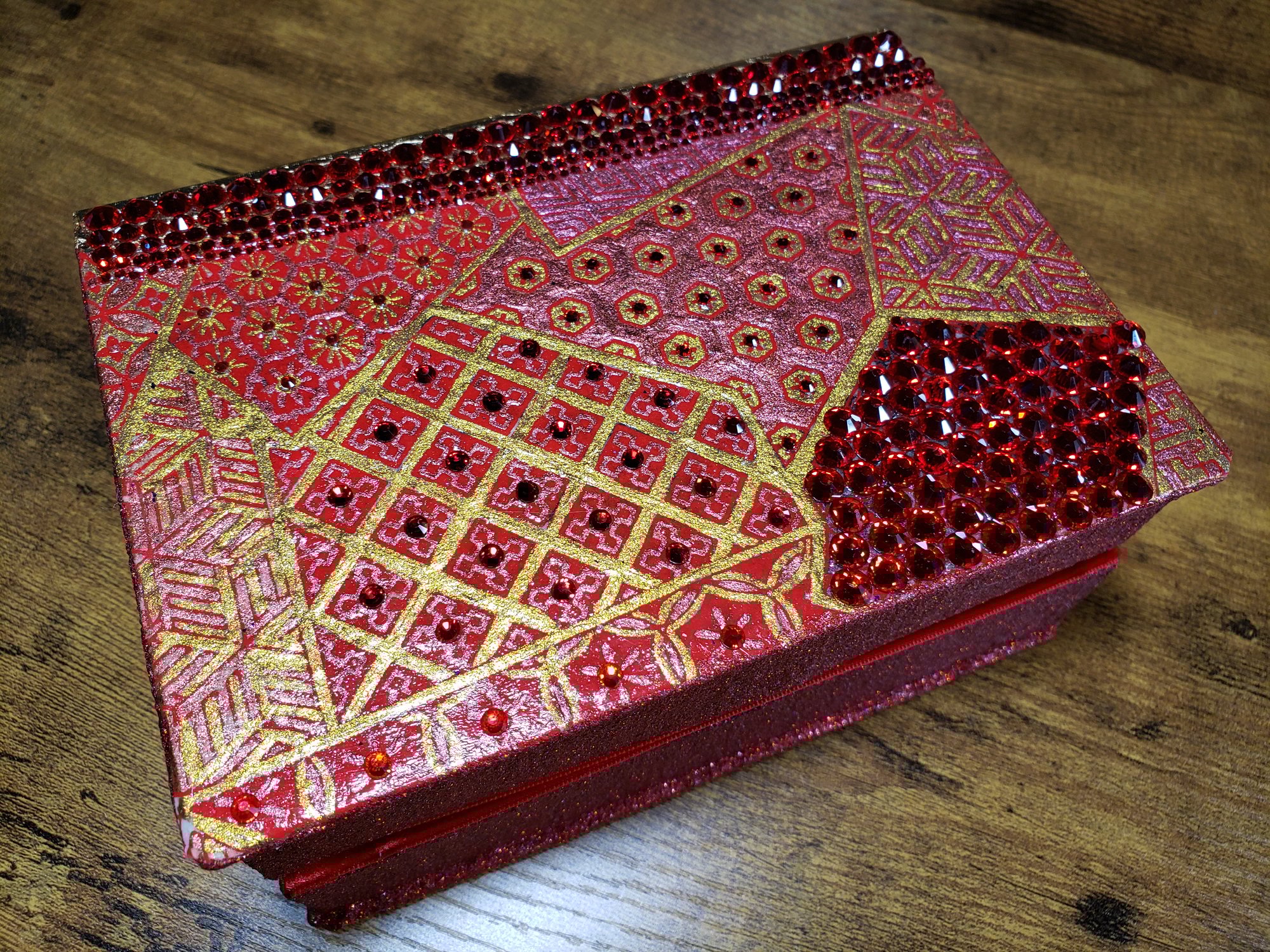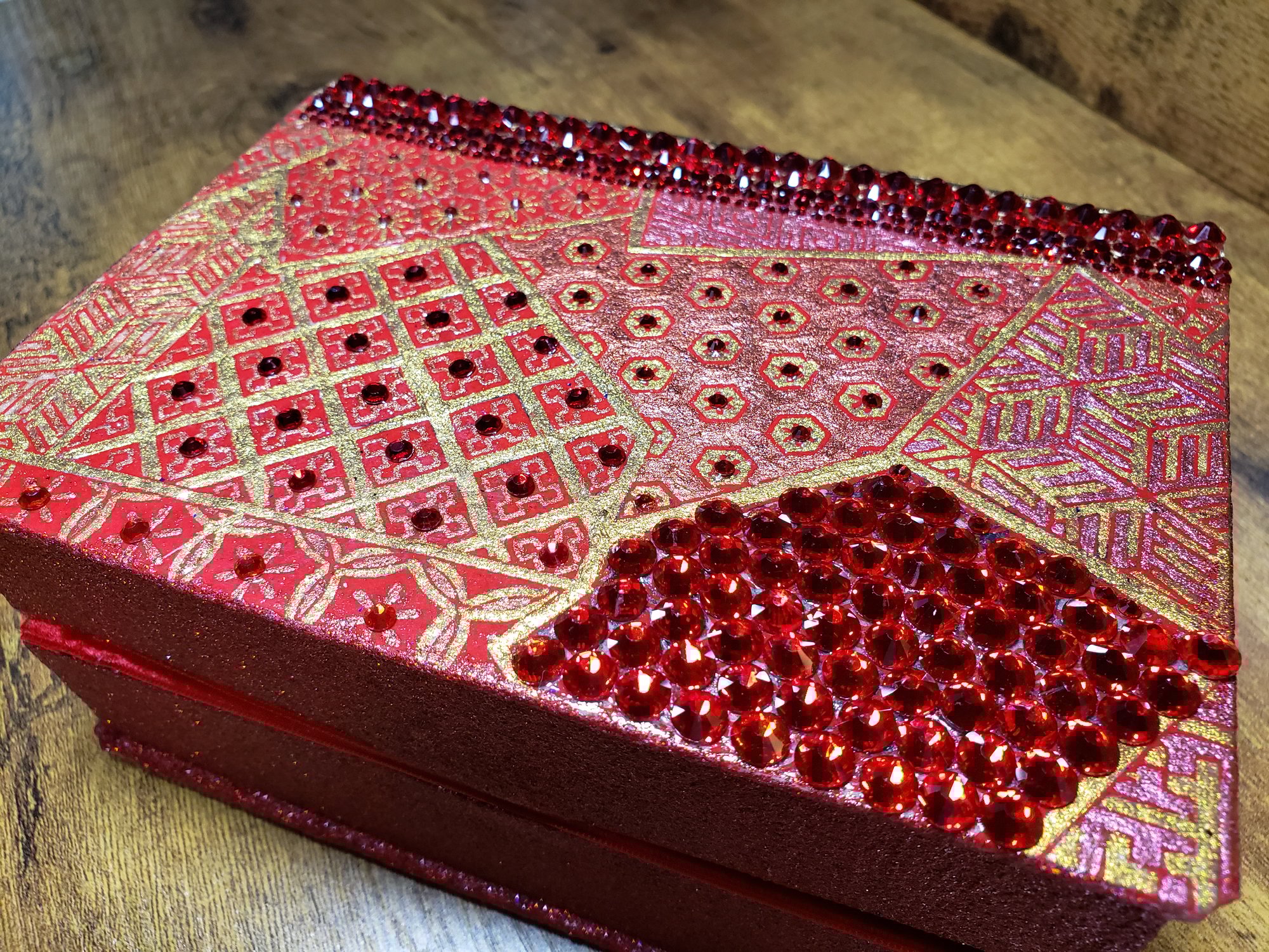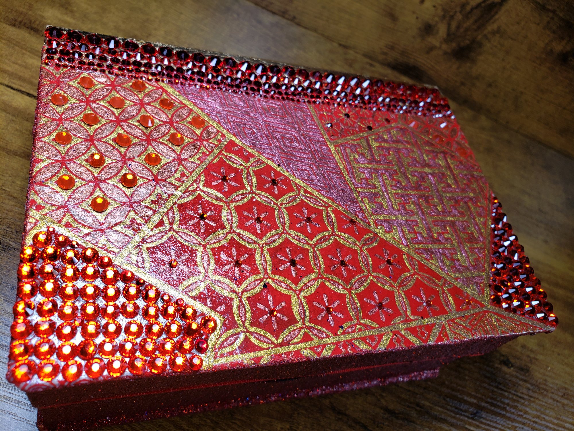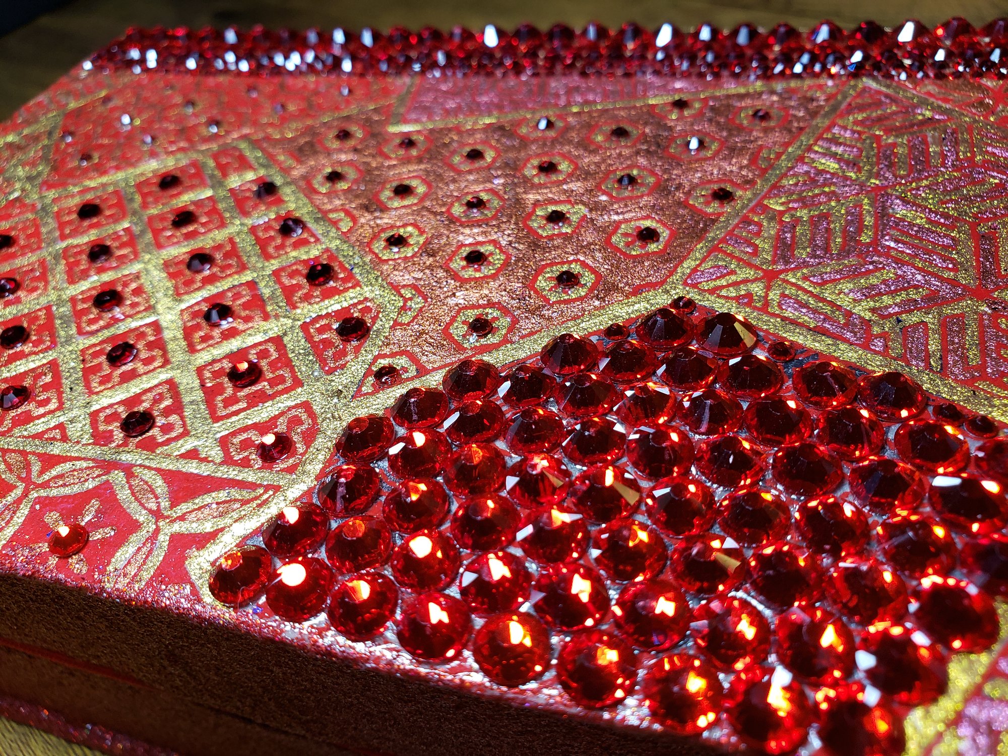 Handmade from artesian paper featuring brilliant red and gold Indian geometric designs accented with aurora borealis rhinestones, handmade chameleon paints, a LOT of holographic glitter, and a magnetic closing system. Both sides of the palette are made of stainless steel, so my magnetic watercolor paints will fit and stay tight. The inside of this watercolor shrine features a brilliant and gorgeous red foil finish accented with amazing ribbon, glittering rhinestones, and a ridiculous amount of red holographic glitter.