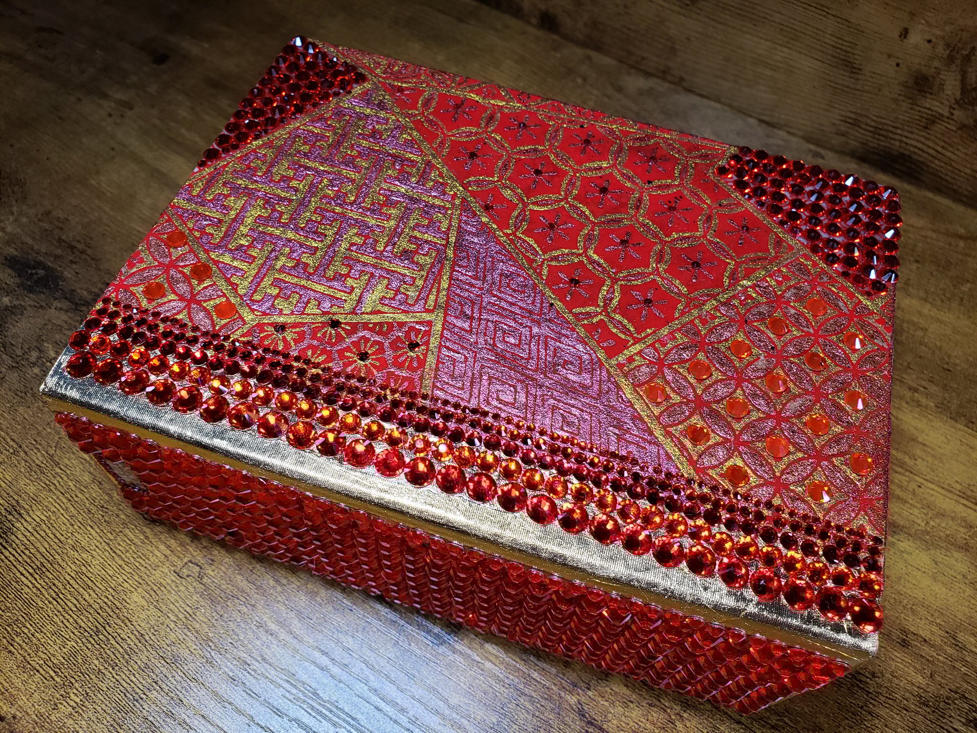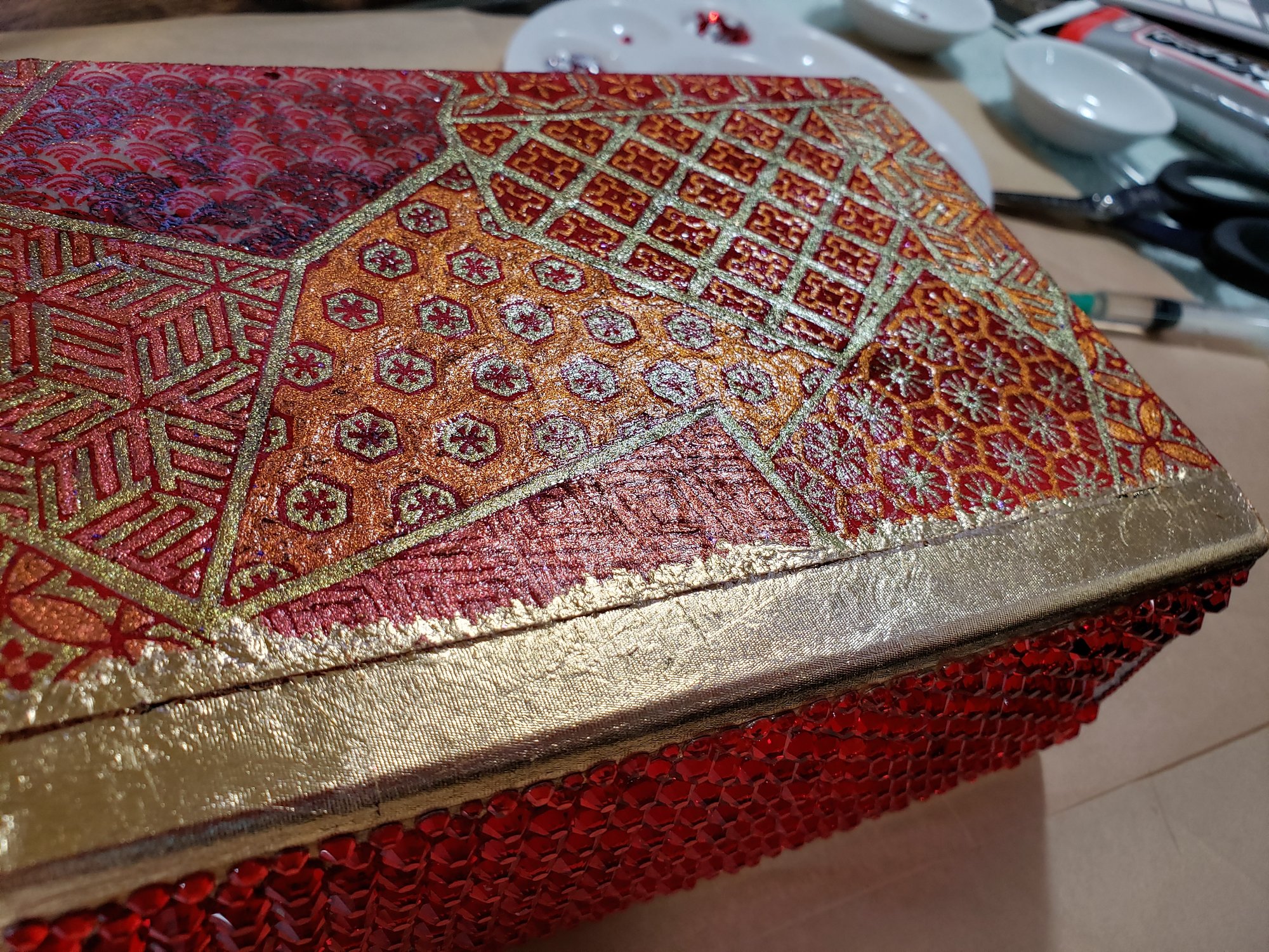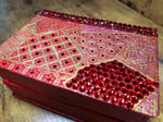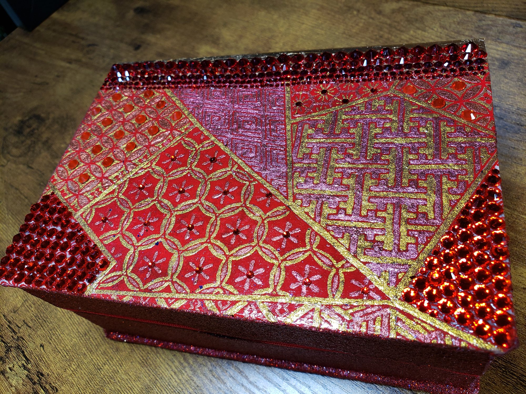 Handmade from artesian paper featuring brilliant red and gold Indian geometric designs accented with aurora borealis rhinestones, handmade chameleon paints, a LOT of holographic glitter, and a magnetic closing system. Both sides of the palette are made of stainless steel, so my magnetic watercolor paints will fit and stay tight. The inside of this watercolor shrine features a brilliant and gorgeous red foil finish accented with amazing ribbon, glittering rhinestones, and a ridiculous amount of red holographic glitter.