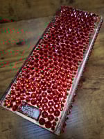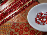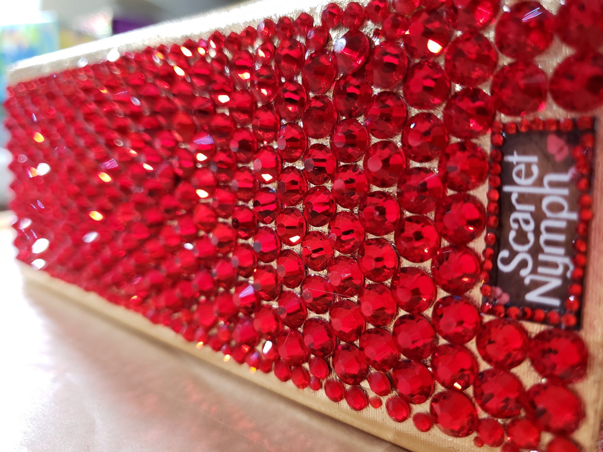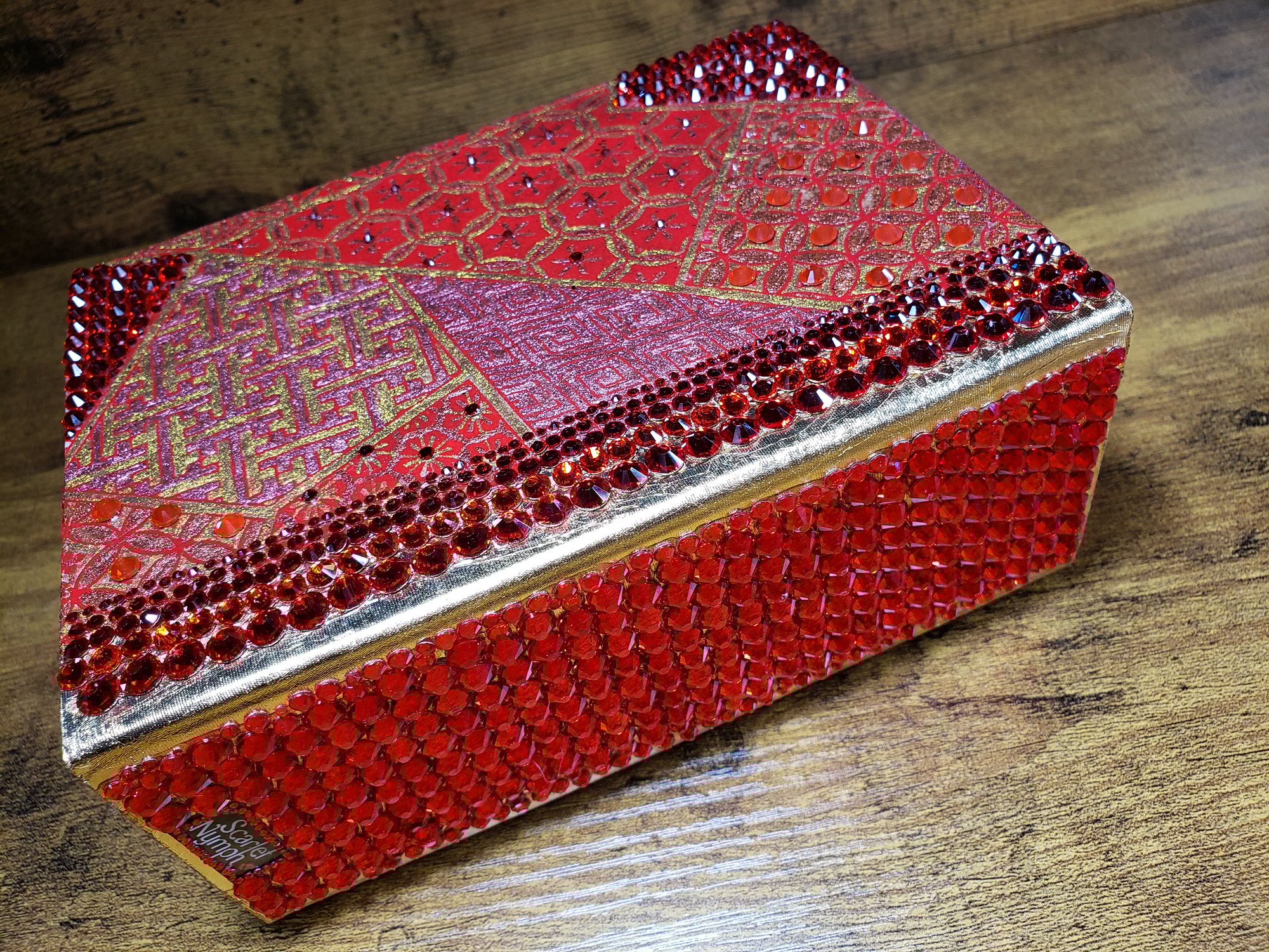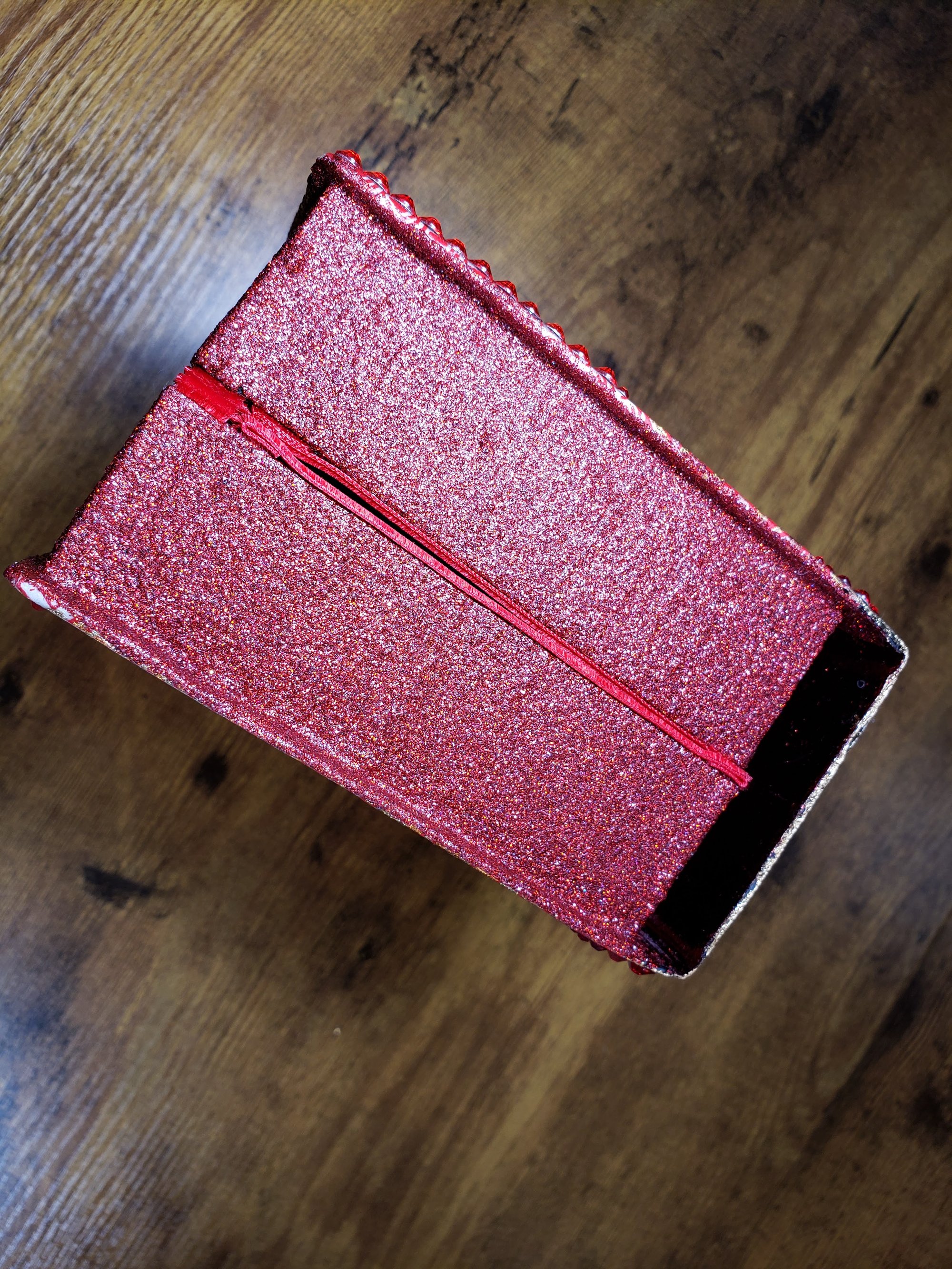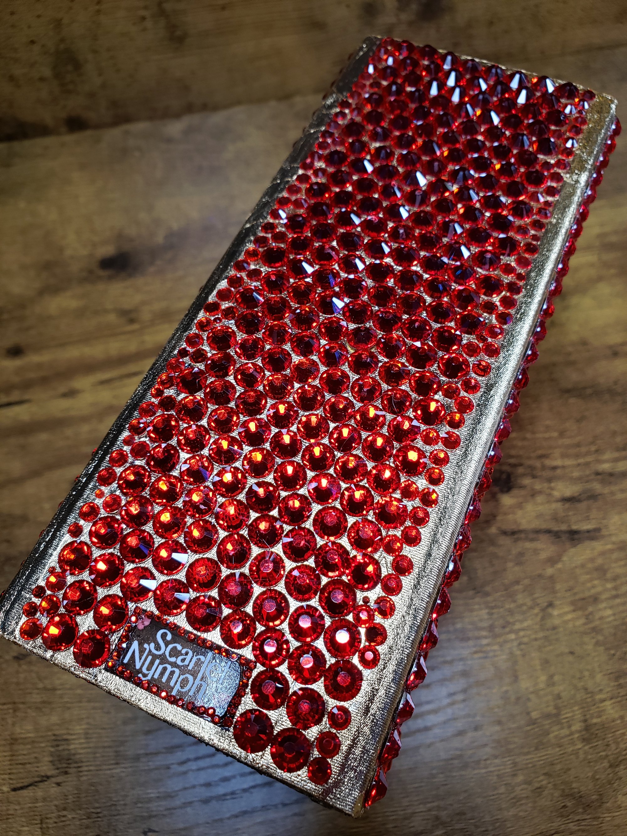 Handmade from artesian paper featuring brilliant red and gold Indian geometric designs accented with aurora borealis rhinestones, handmade chameleon paints, a LOT of holographic glitter, and a magnetic closing system. Both sides of the palette are made of stainless steel, so my magnetic watercolor paints will fit and stay tight. The inside of this watercolor shrine features a brilliant and gorgeous red foil finish accented with amazing ribbon, glittering rhinestones, and a ridiculous amount of red holographic glitter.