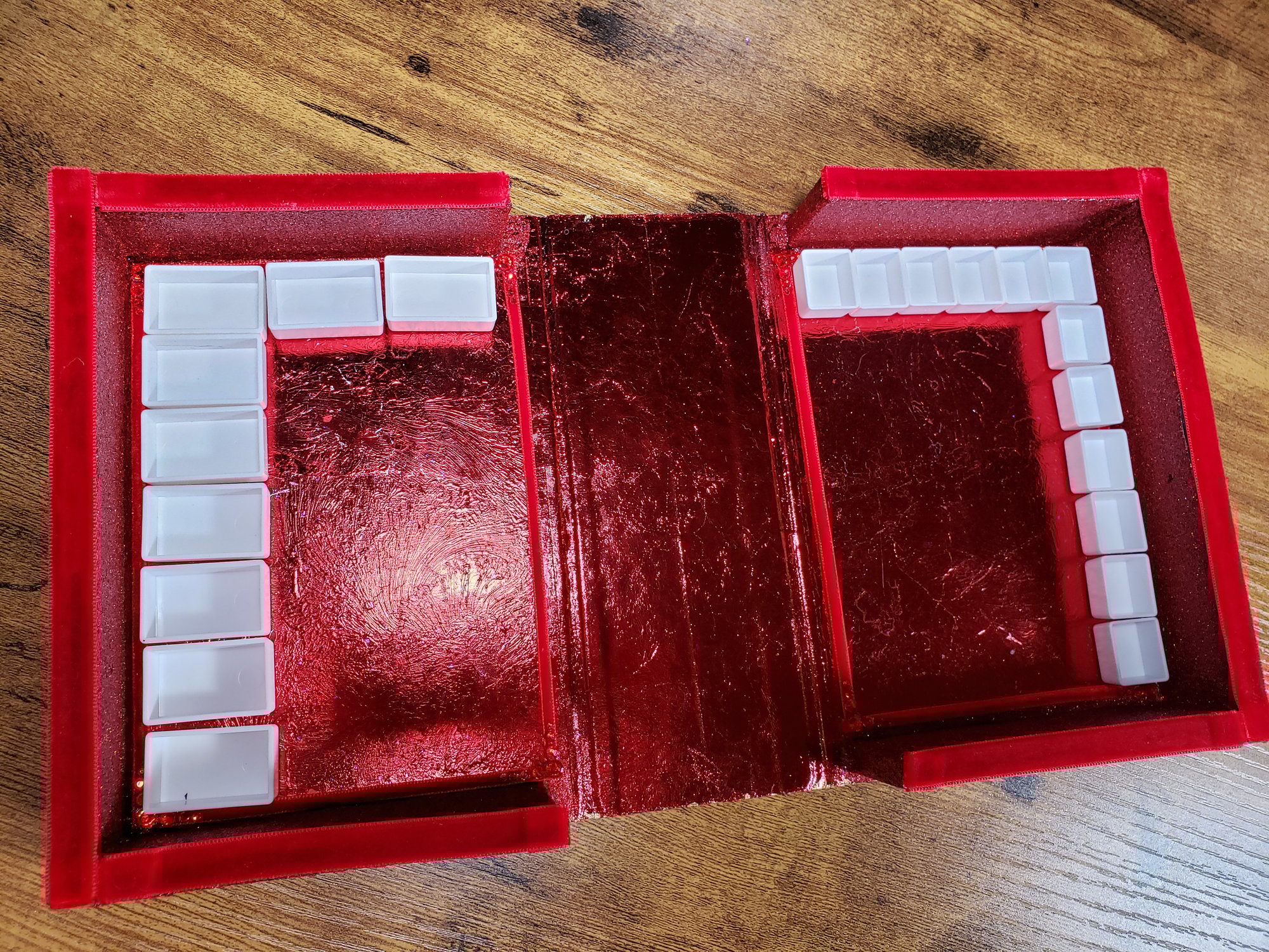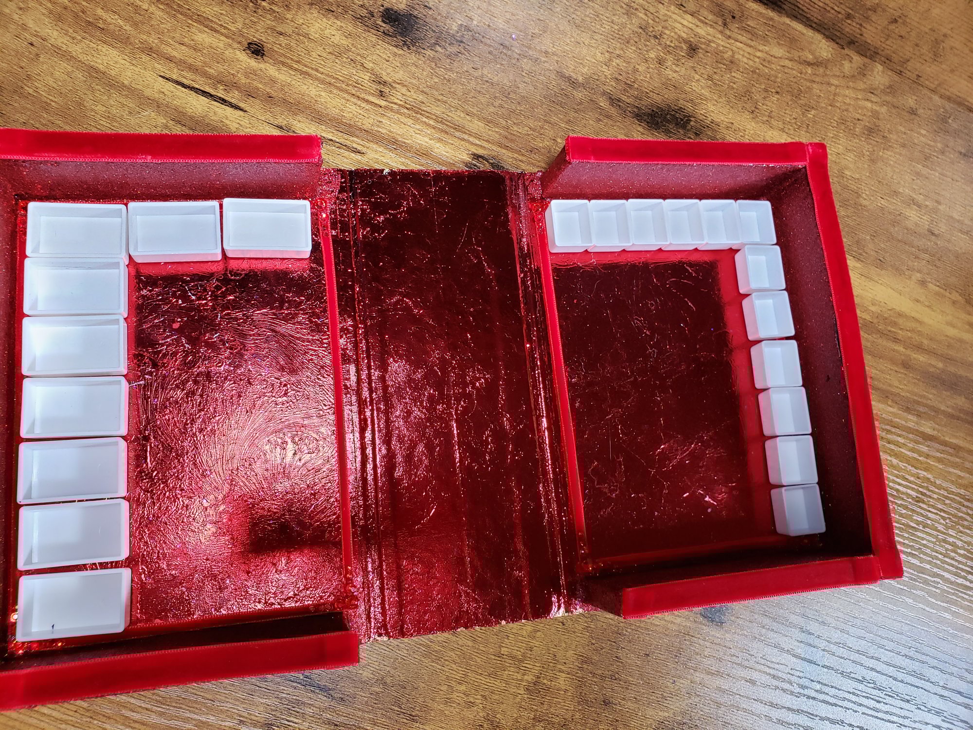 Organize and arrange your watercolors! With two sides to use, you can bring along a series of colors for whatever artistic endeavor you find. The watercolor shrine holds about 42 full sized (3.2 ml) watercolor pans or about 84 1/2 (1.8 ml) sized pans.