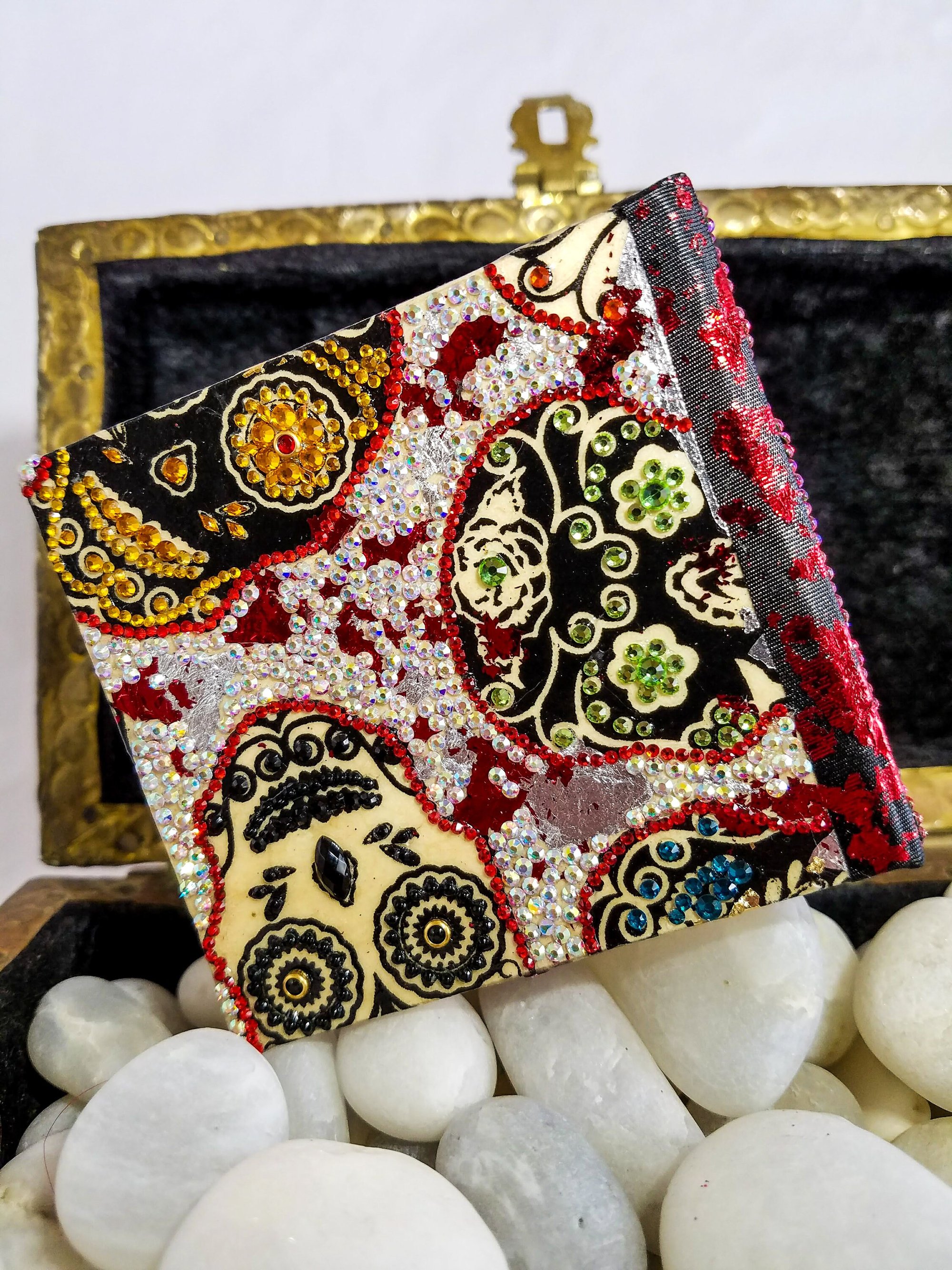 If you LOVE makeup, you will adore this one of a kind practical piece of art! This magnificent magnetic eyeshadow palette has been hand-made using quality handmade papers, fine rhinestones, gold, silver, and metallic red leaf, felt, and small but powerful magnets. Each rhinestone has been carefully placed by hand to accent the paper design and provide maximum sparkle!! A gorgeous handmade magnetic shrine for anyone in your life who LOVES their eyeshadows! Amazing white paper with Mexican style Dia delos Muertos Calaveras, or sugar skulls will accent any makeup vanity and provide a fantastic dash of dazzle.