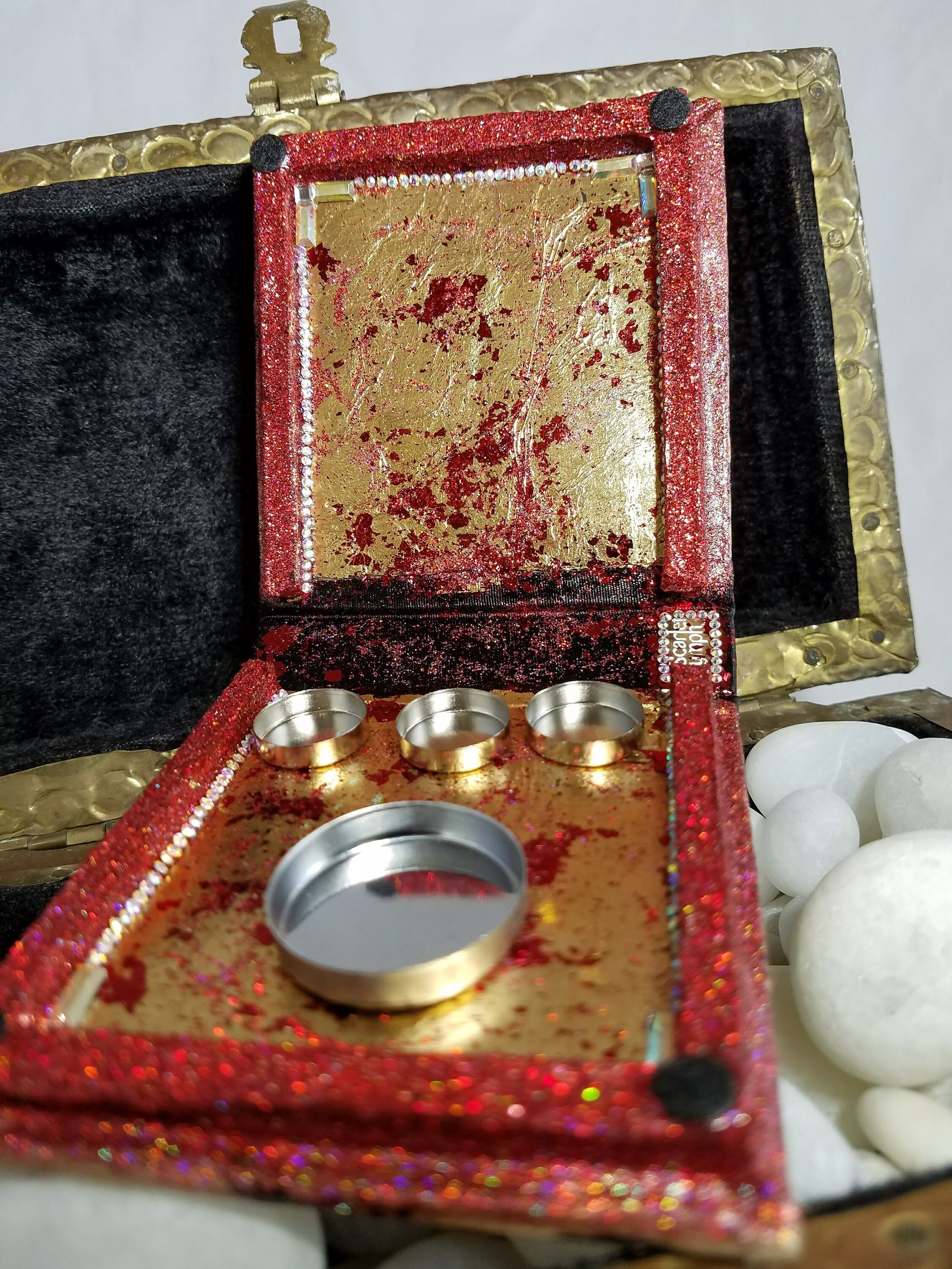 Makeup tins, magnetic sticker, buffing cloth, & satin bag [ size of your choosing, leave in notes: bag the size of the shrine or large enough for brushes & other products] included.