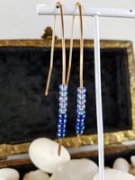 There are some days when I can't wait to get home so that I can do a little art therapy. These days I've been really into HITTING THINGS WITH A HAMMER! Thus, SMASH IT PRETTY!! was born. I've SMASHED 16 gauge bronzed wire into a dramatic hook that call an "elf ear," inspired by my love of fantasy and science fiction. These feature dramatic cerulean and sapphire blue glass beads and are about 3 inches long from the top of the hook to the bottom.