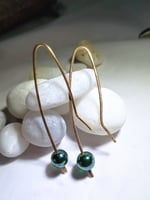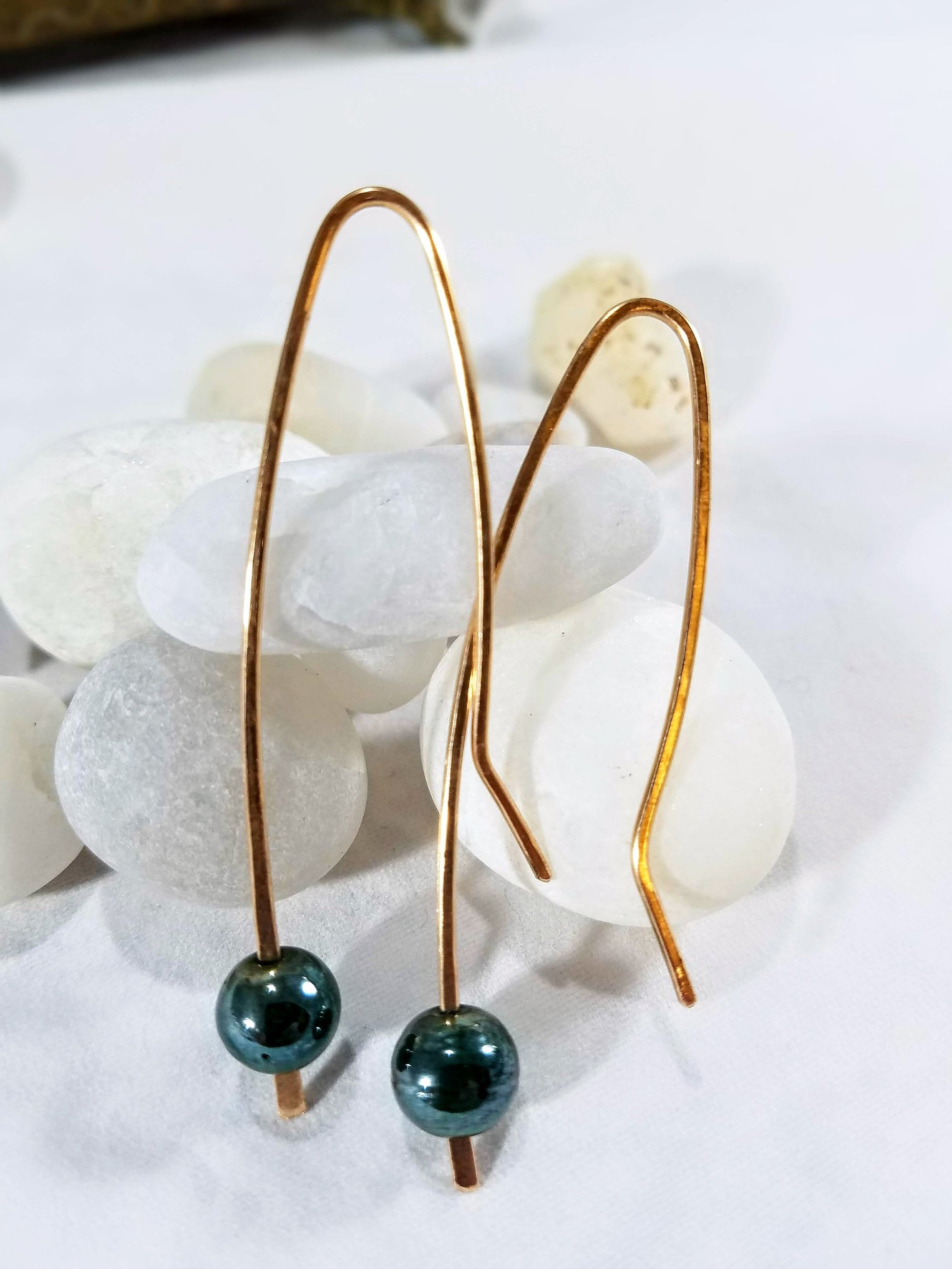 There are some days when I can't wait to get home so that I can do a little art therapy. These days I've been really into HITTING THINGS WITH A HAMMER! Thus, SMASH IT PRETTY!! was born. I've SMASHED 16 gauge bronzed wire into a dramatic hook that call an "elf ear," inspired by my love of fantasy and science fiction. These feature sea green glossy fire hardened glass beads and are about 3 inches long from the top of the hook to the bottom.