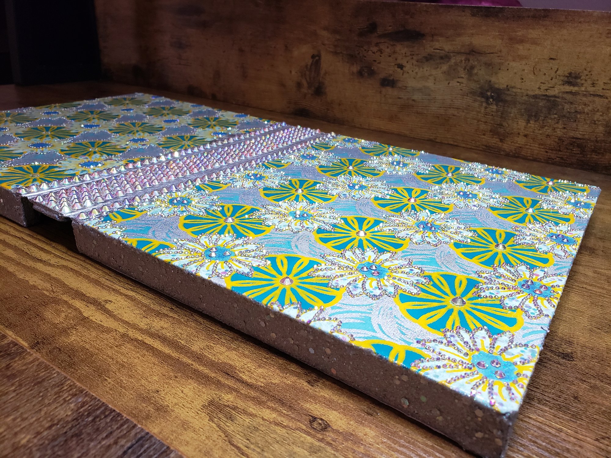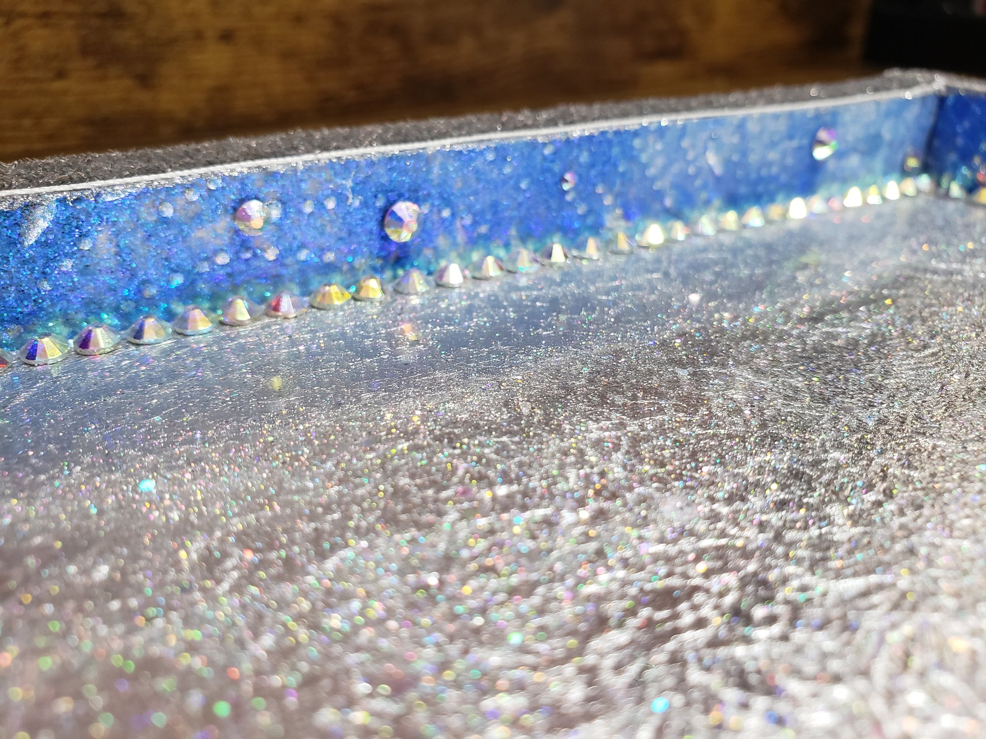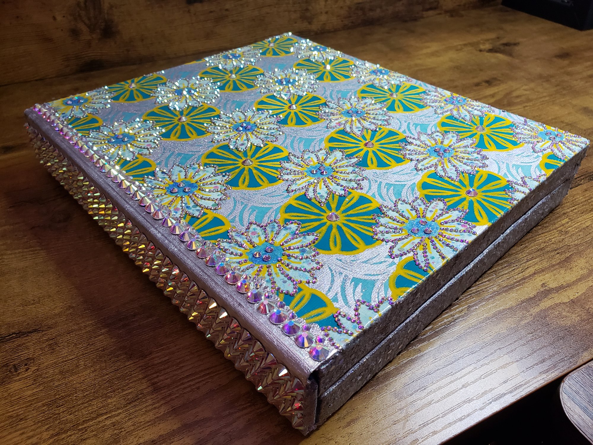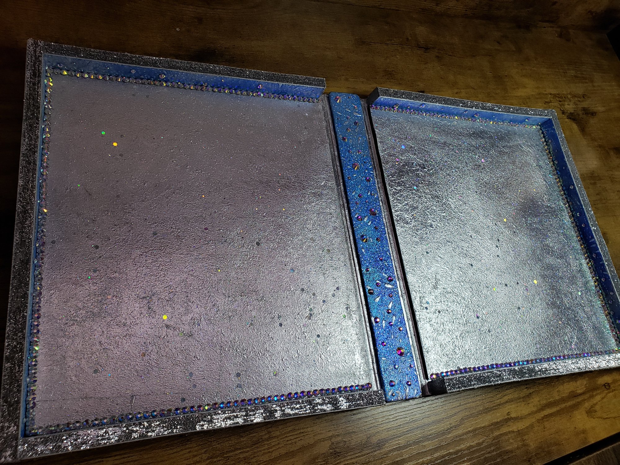 Handmade from unique artesian paper and embellished with colorful flower papers, accented with brilliant aurora borealis rhinestones, handmade chameleon paints, a LOT of holographic glitter, and a magnetic closing system. Both sides of the palette are made of magnets, so standard eye shadow pans will fit and stay tight. The inside of this makeup shrine features a brilliant and gorgeous gold glitter metallic finish accented with amazing ribbon, glittering rhinestones, and a ridiculous amount of holographic glitter.
