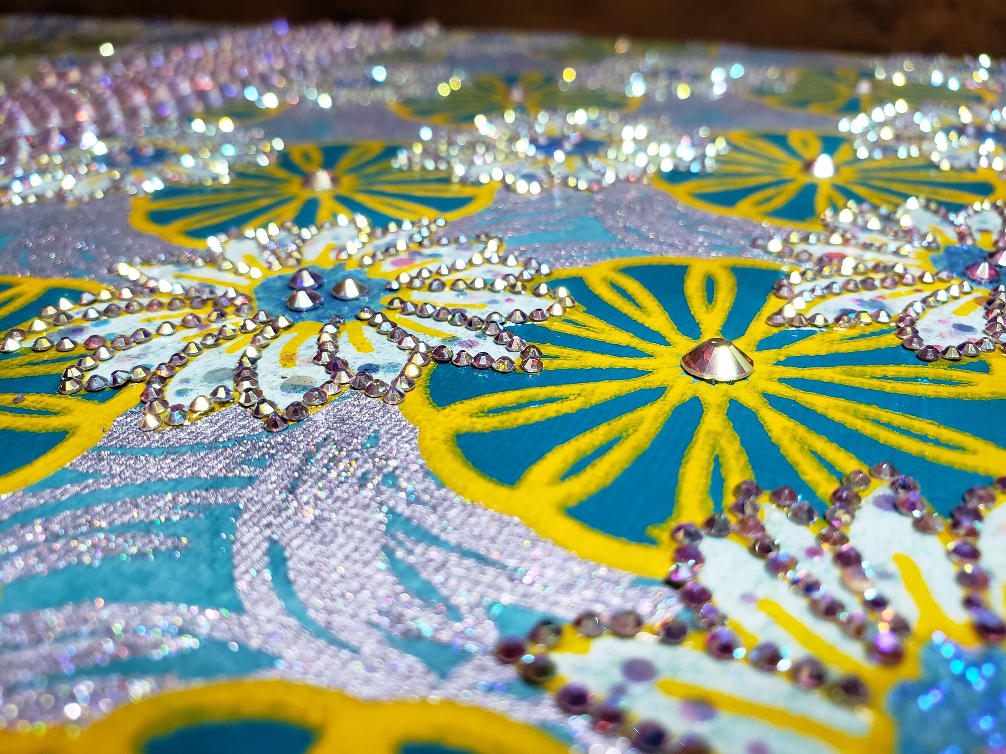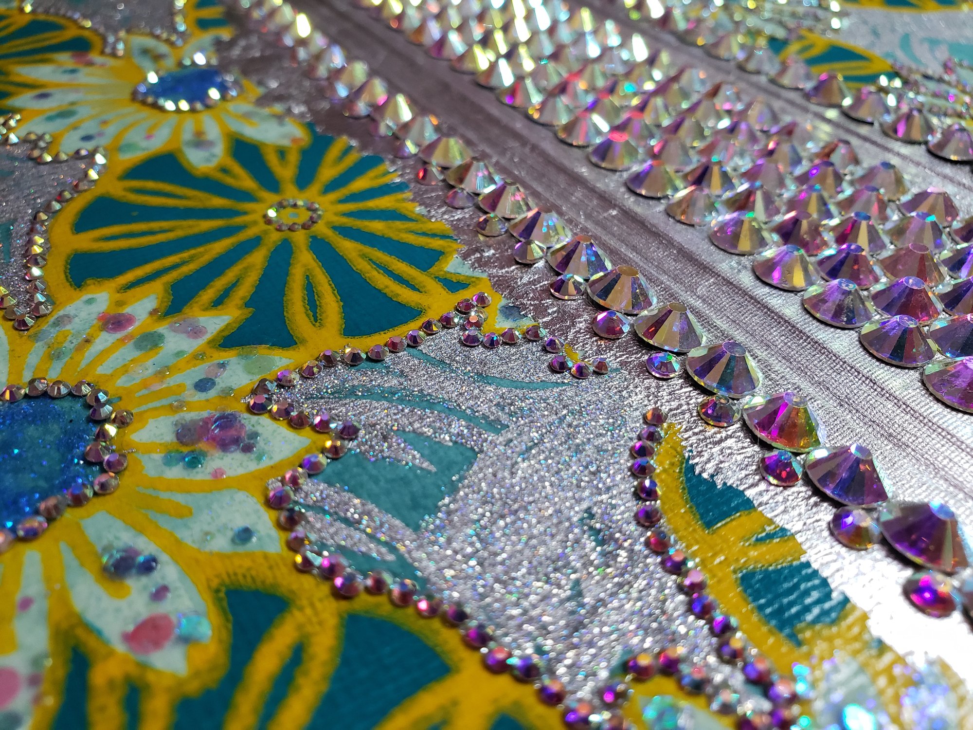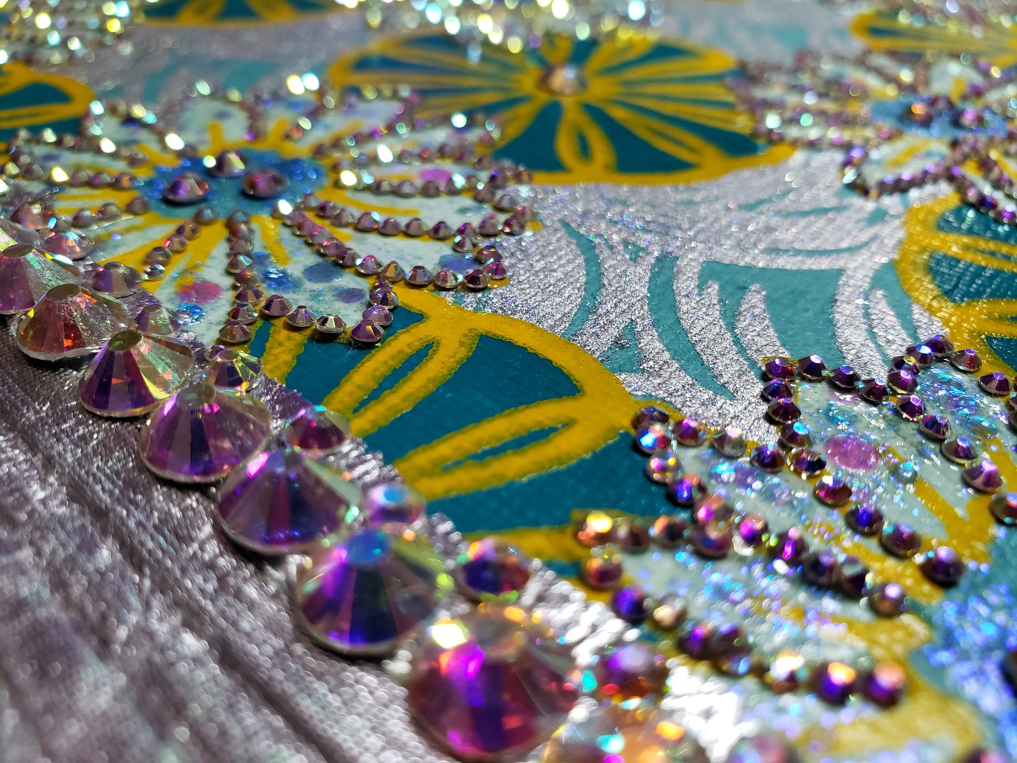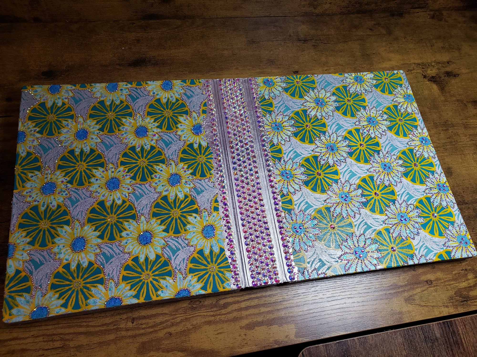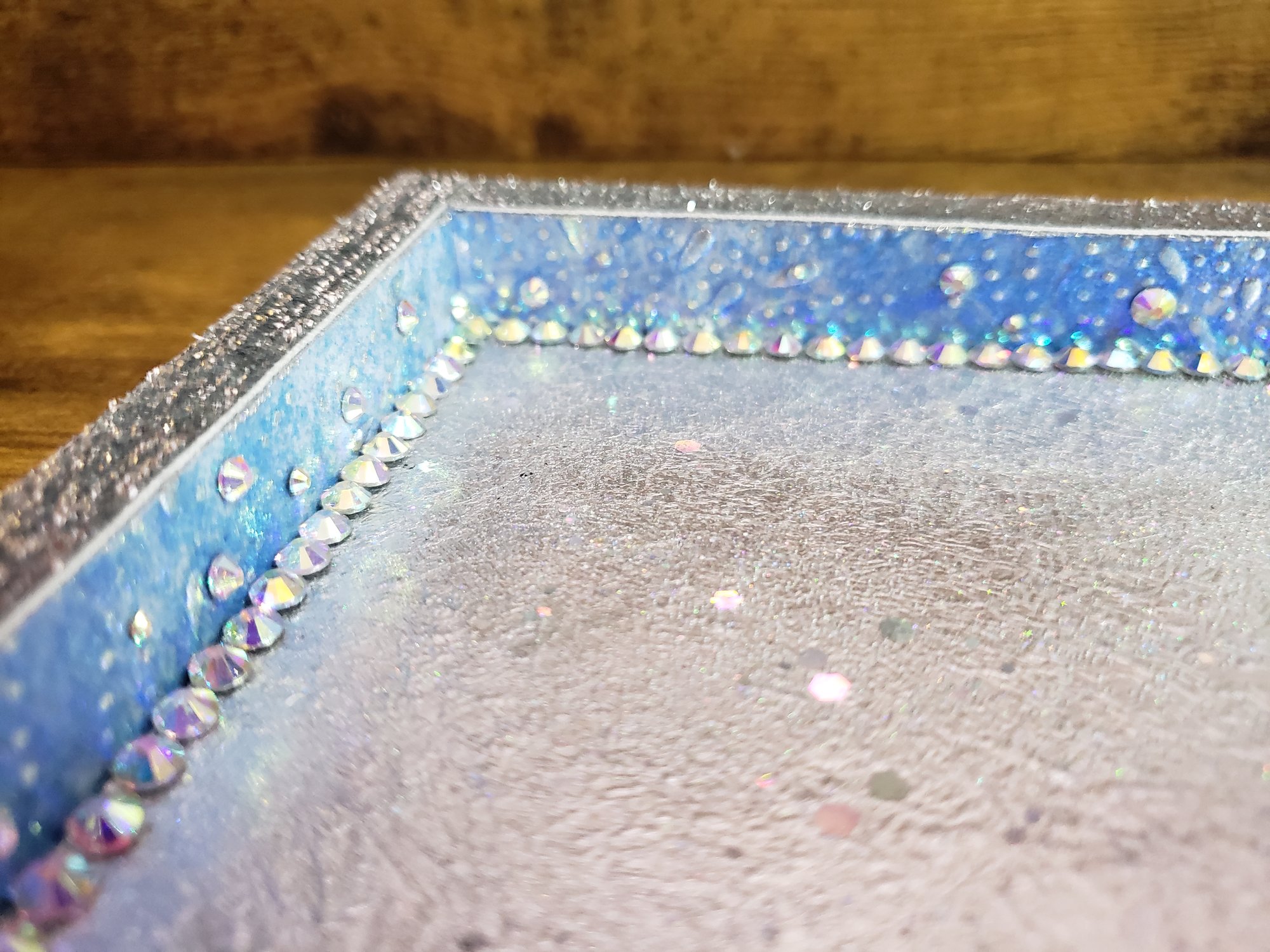Handmade from unique artesian paper and embellished with colorful flower papers, accented with brilliant aurora borealis rhinestones, handmade chameleon paints, a LOT of holographic glitter, and a magnetic closing system. Both sides of the palette are made of magnets, so standard eye shadow pans will fit and stay tight. The inside of this makeup shrine features a brilliant and gorgeous gold glitter metallic finish accented with amazing ribbon, glittering rhinestones, and a ridiculous amount of holographic glitter.